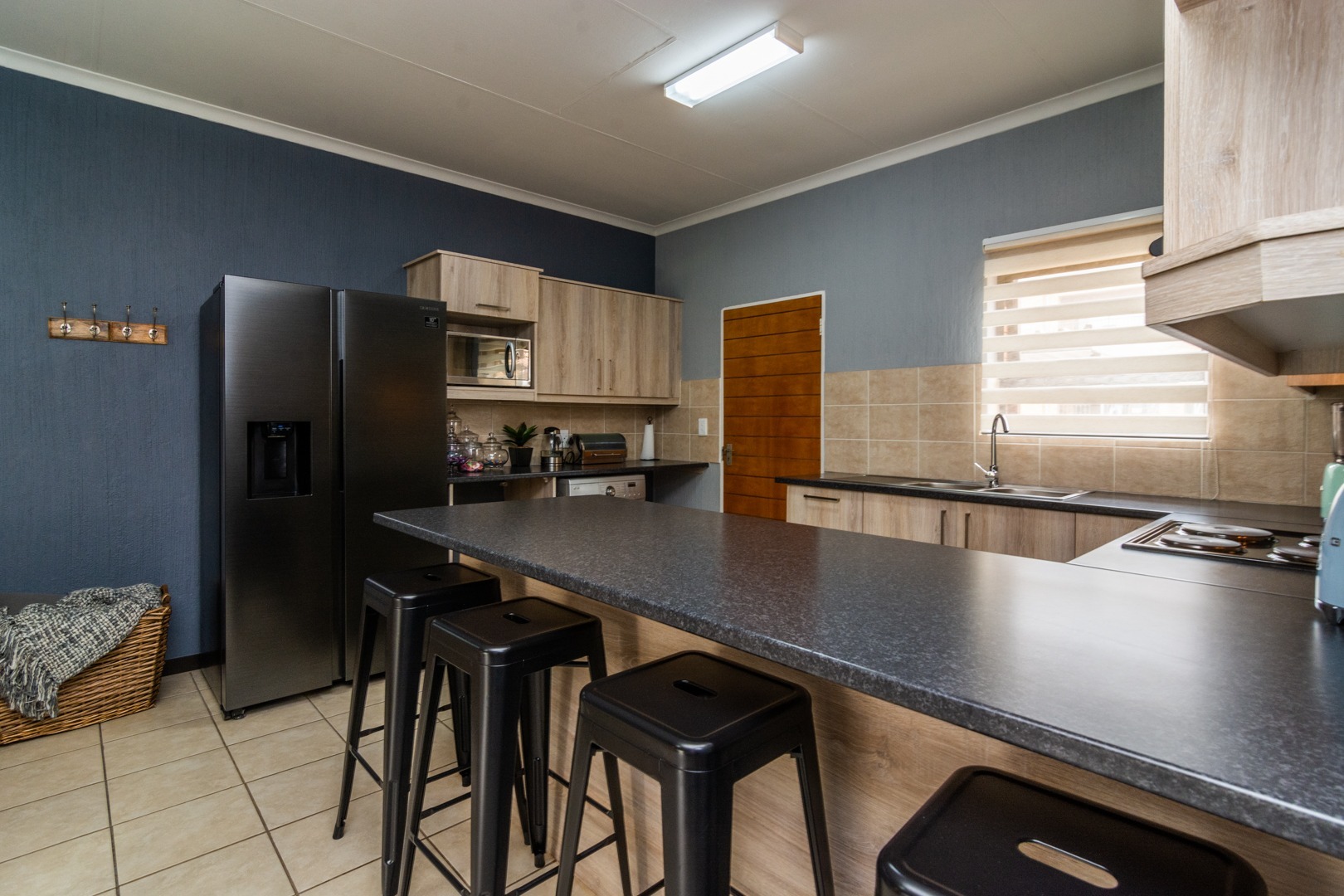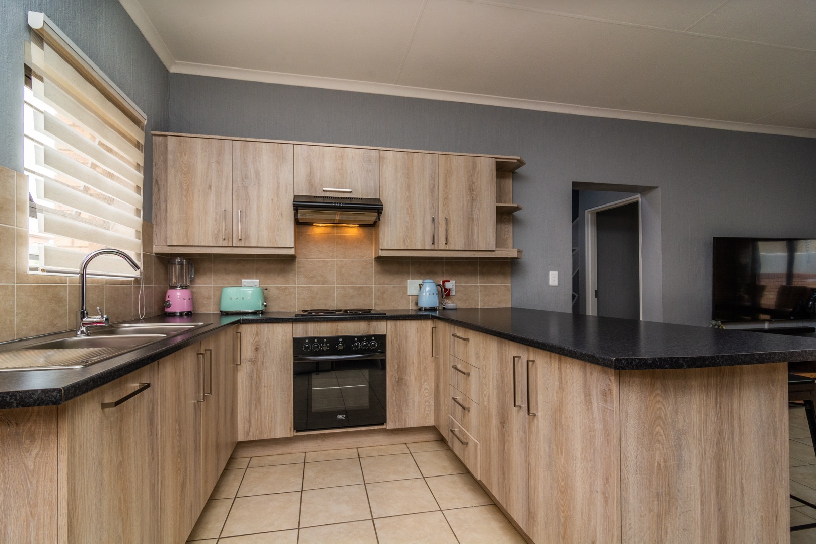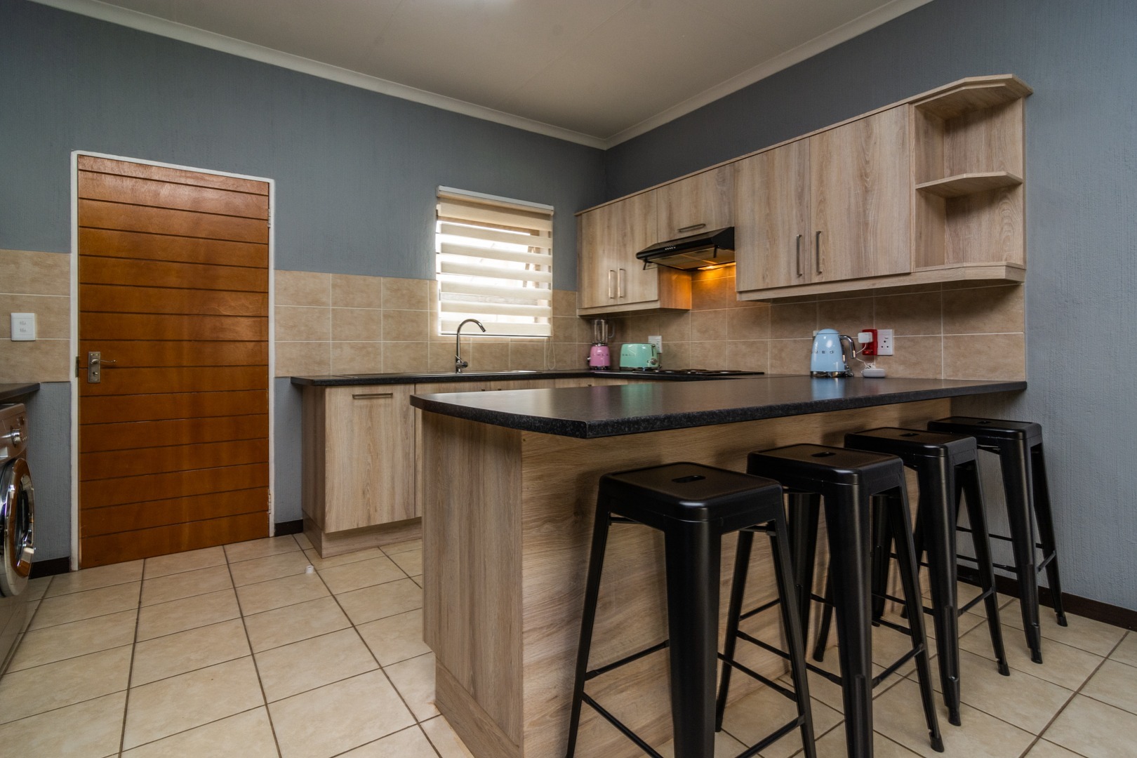 The kitchen with space for 2 undercounter appliances and a double door fridge offers ample cupboard space.