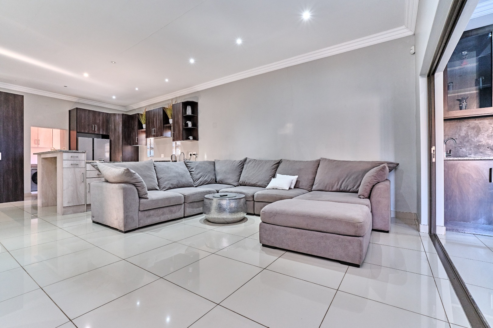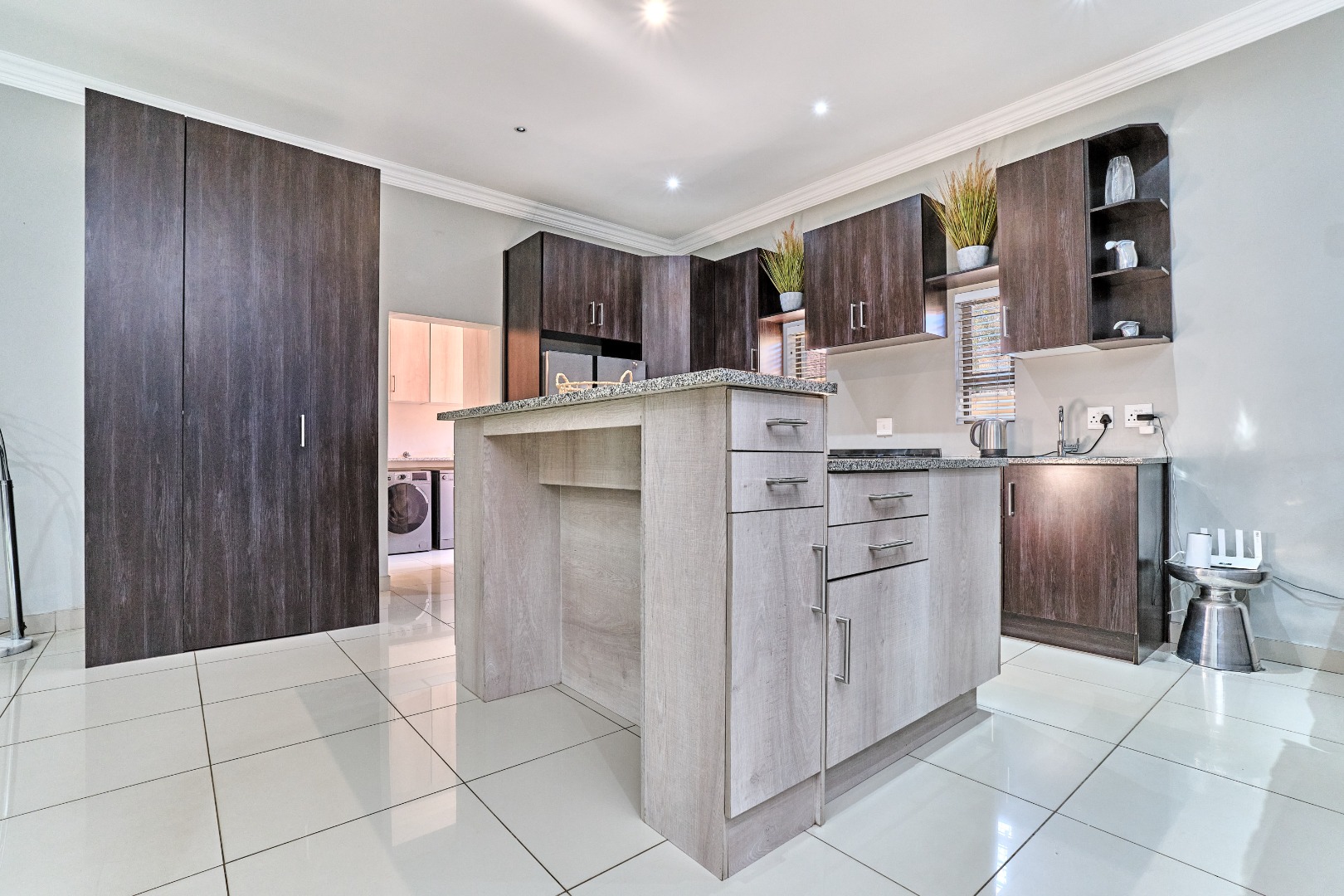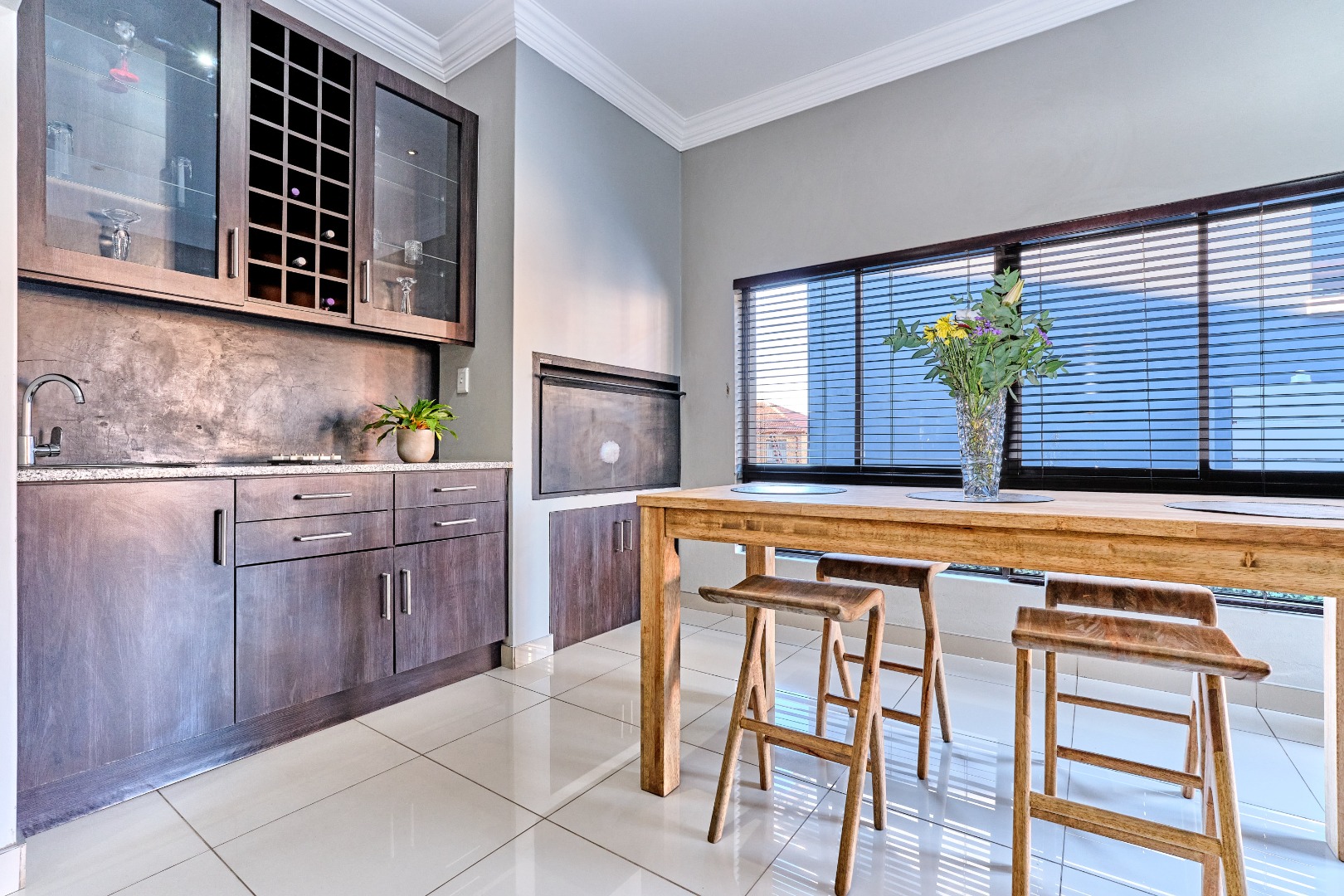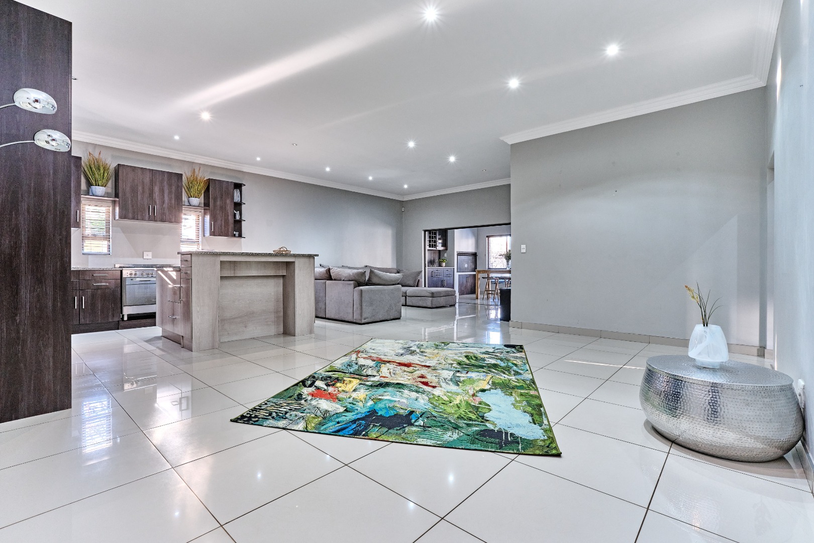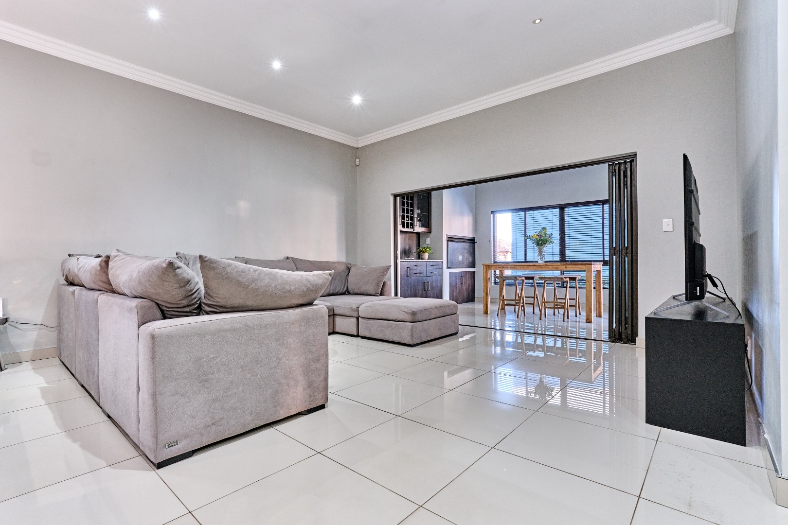 Modern design. High ceilings, beautifully tiled throughout, with 3 bedrooms and a study, 2 full bathrooms, and a spacious open-plan design that seamlessly connects the lounge, kitchen and entertainment space, complete with a built-in prep and sleek bar area plus an indoor braai - perfect for hosting guests and enjoying time with the family. The spacious main bedroom has ample built-in cupboards plus an en-suite with a double vanity, large shower and corner bath. There is a second full bathroom, a separate scullery with ample cupboard space keeps the kitchen clutter free.