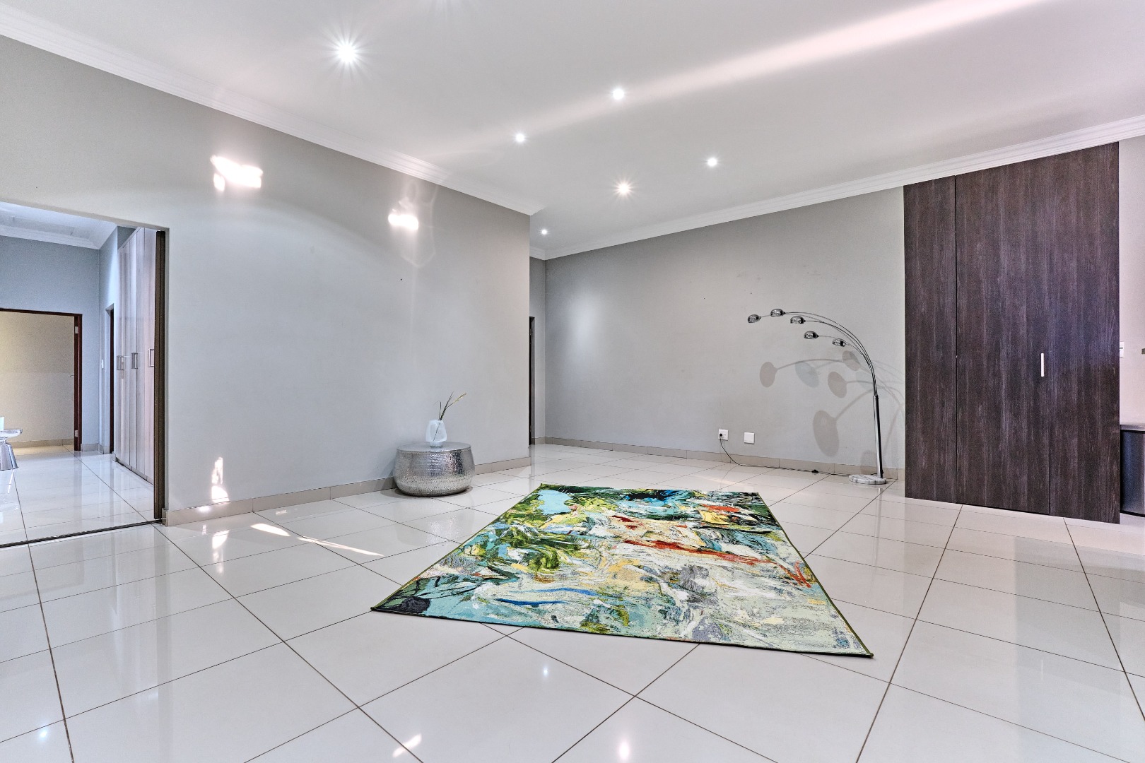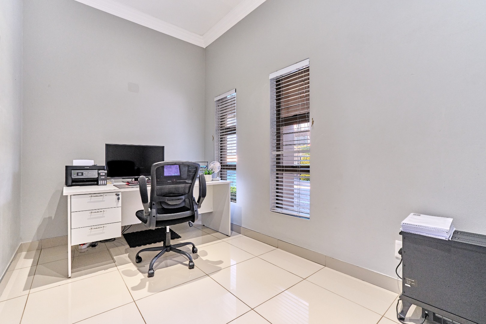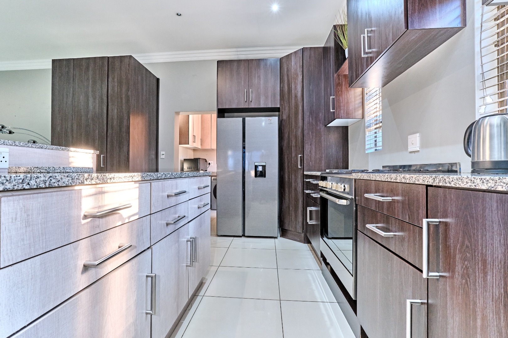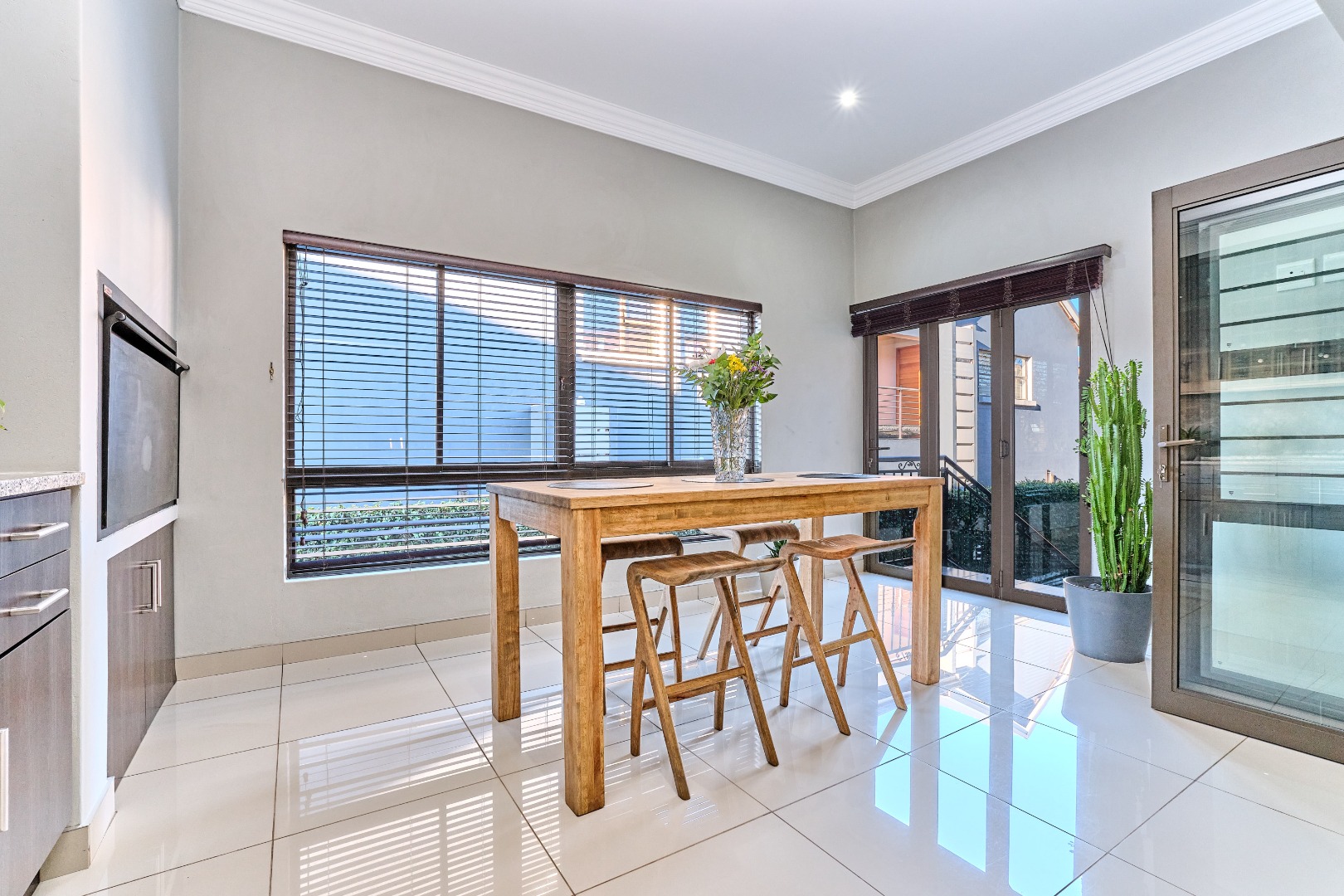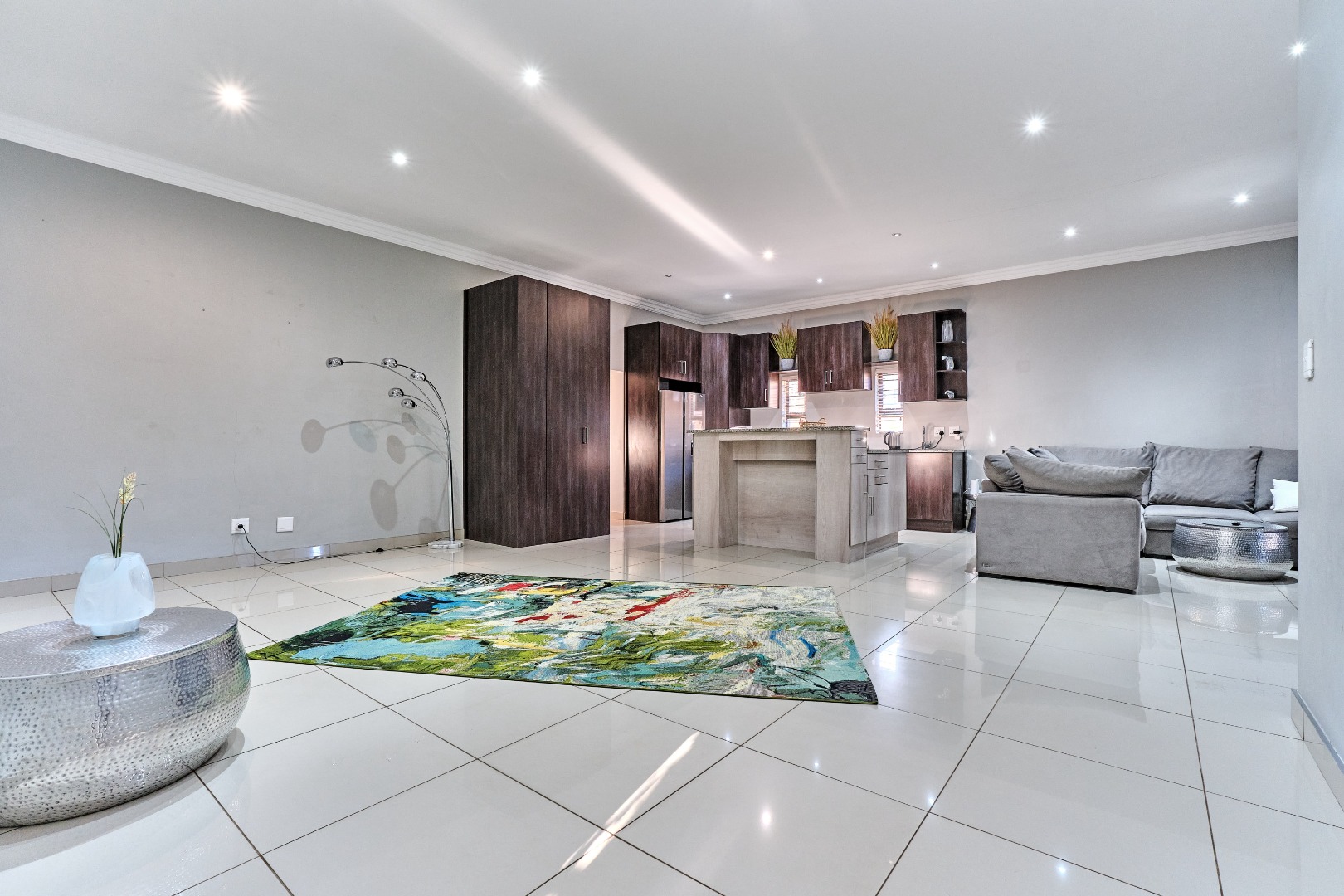 Modern design. High ceilings, beautifully tiled throughout, with 3 bedrooms and a study, 2 full bathrooms, and a spacious open-plan design that seamlessly connects the lounge, kitchen and entertainment space, complete with a built-in prep and sleek bar area plus an indoor braai - perfect for hosting guests and enjoying time with the family. The spacious main bedroom has ample built-in cupboards plus an en-suite with a double vanity, large shower and corner bath. There is a second full bathroom, a separate scullery with ample cupboard space keeps the kitchen clutter free.