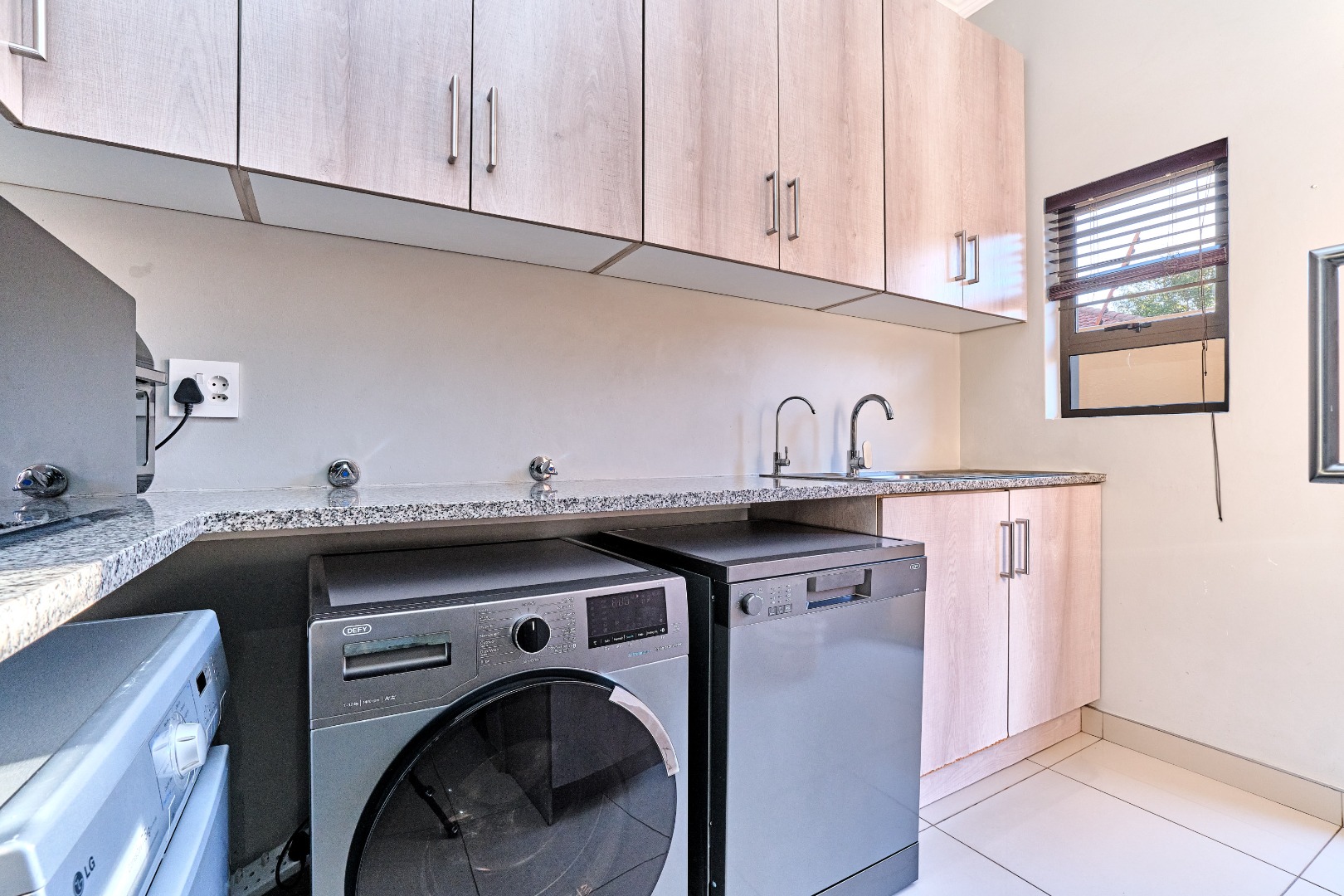 Low maintenance, no big garden to upkeep, only a small grass area and neat beds that wrap around the house. There is a double garage with a generous store room at the back, and driveway with plenty of space for additional parking.