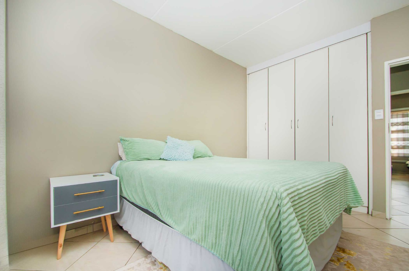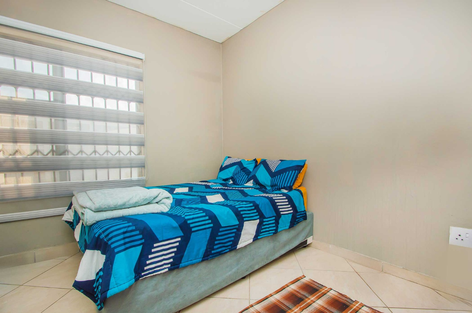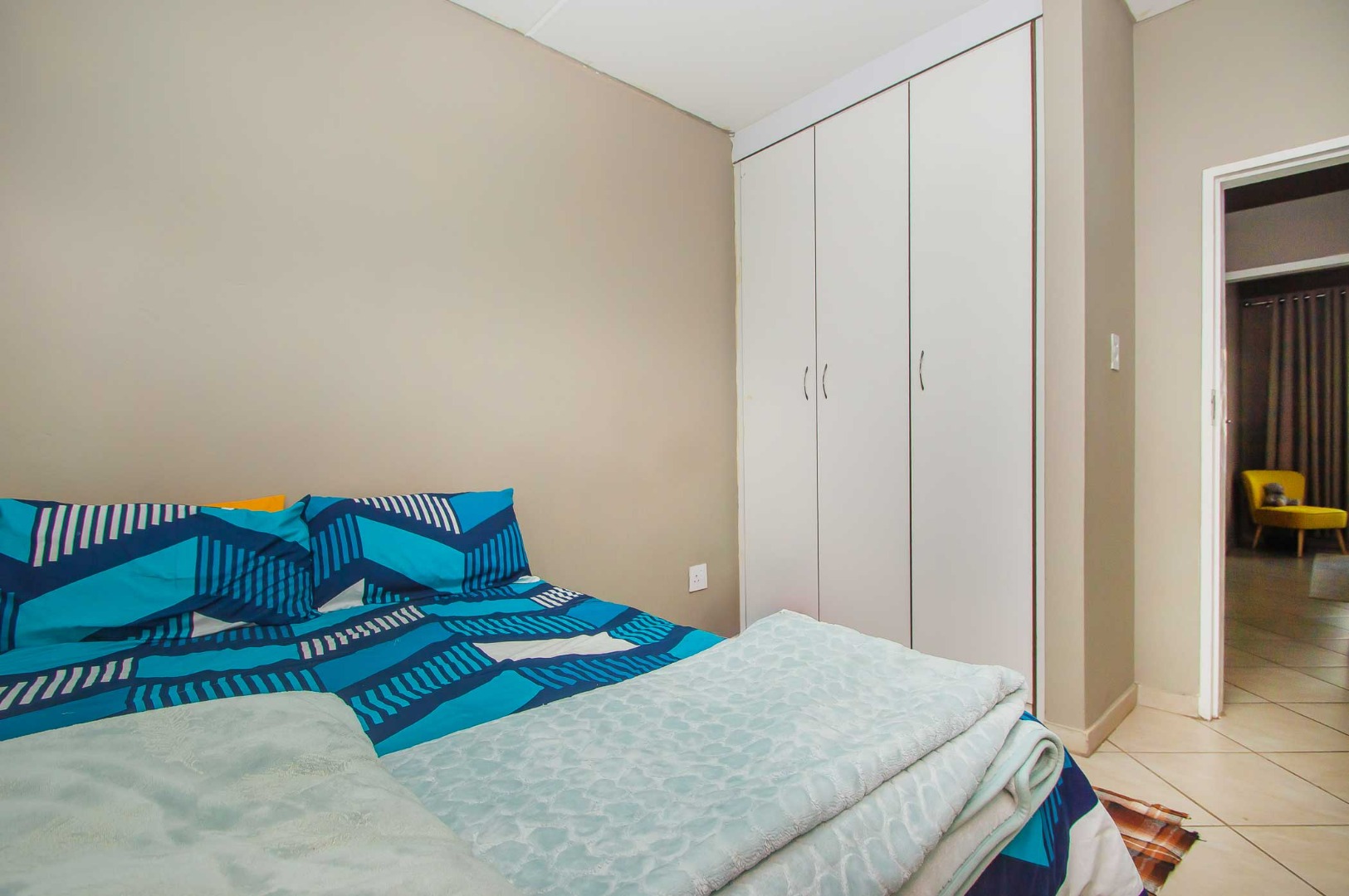 The main bedroom is spacious and sunny with built in cupboards. The second bedroom is fitted with lovely blinds.