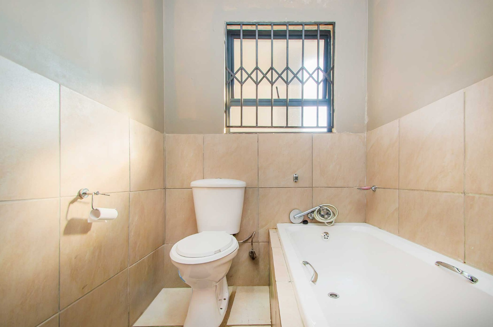 The bathroom features a toilet, basin and bath with a hand shower attachment.