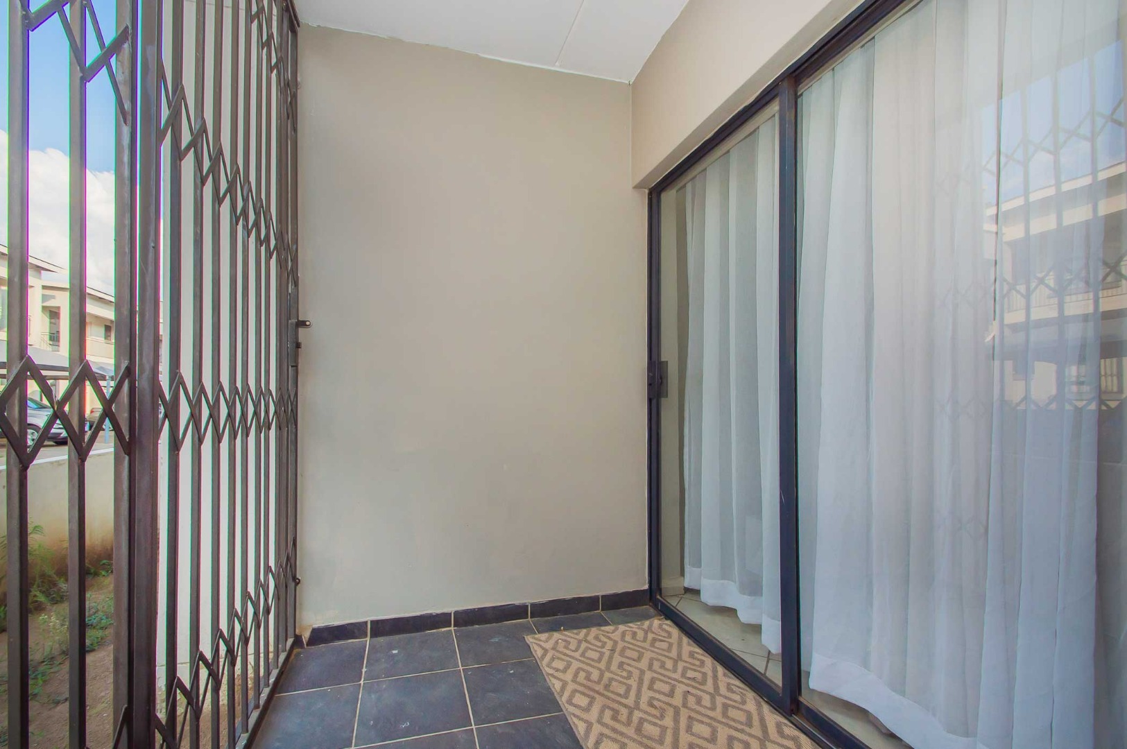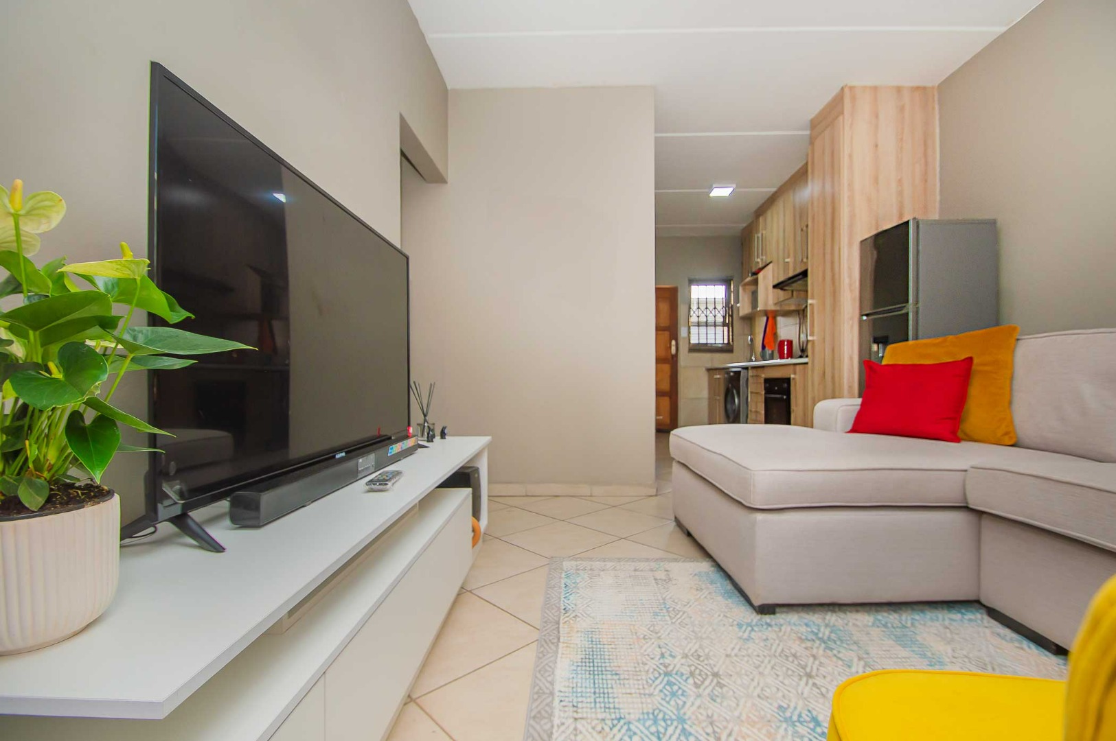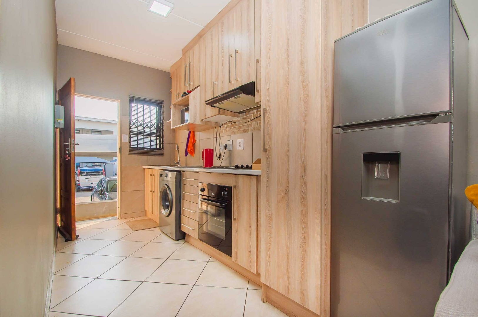 As you enter, you’ll notice the beautiful kitchen, making this apartment feel warm and inviting as it flows through to the open-plan living area. A sliding door leads onto the covered patio which is secured with a security gate. The apartment is tiled throughout and features modern finishes.
