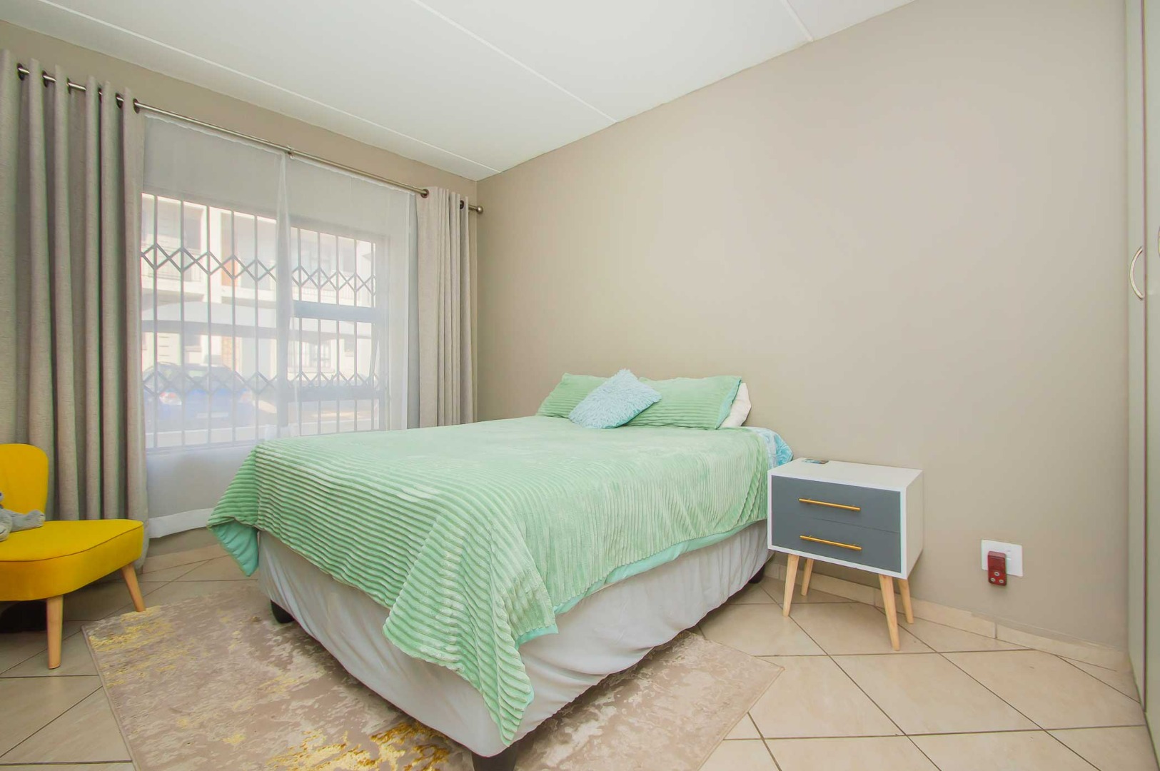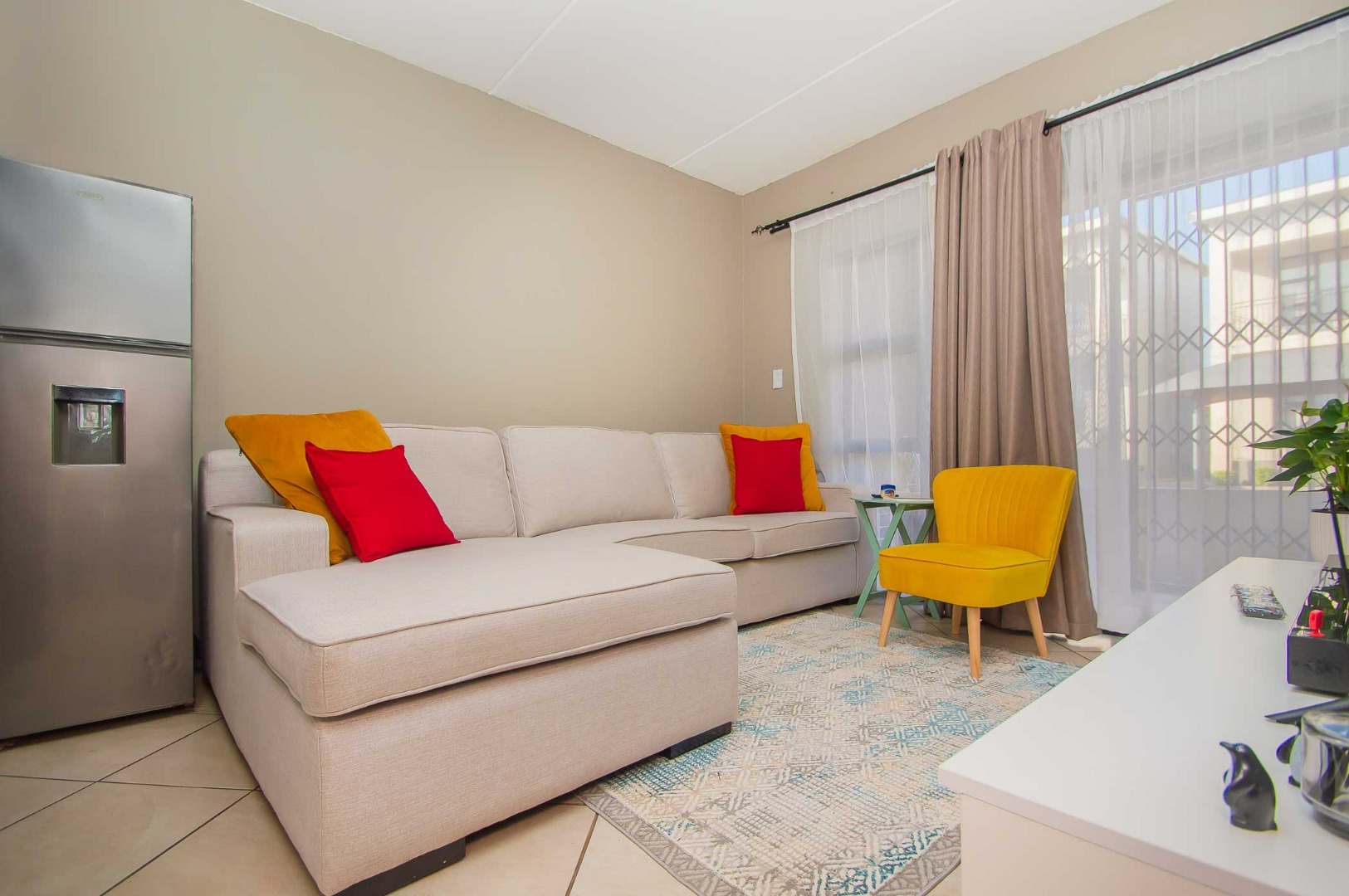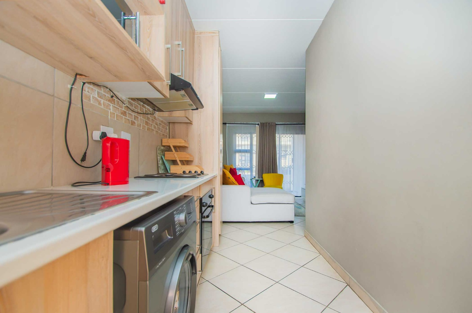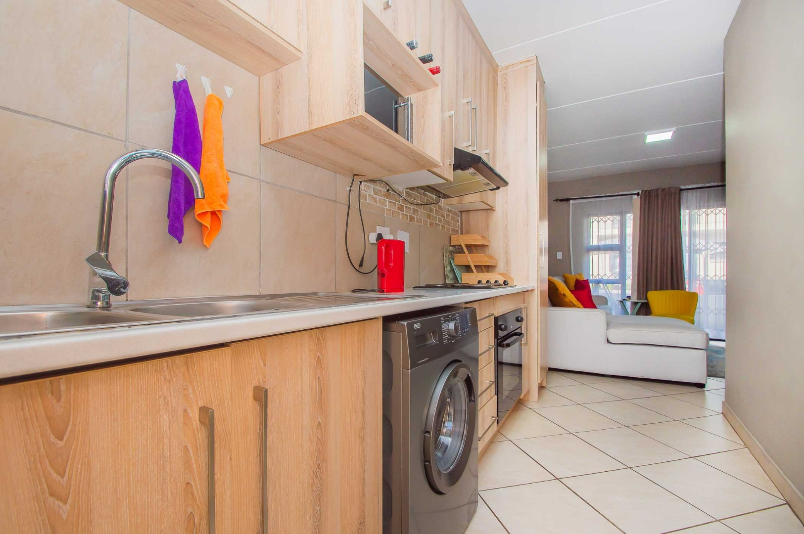 As you enter, you’ll notice the beautiful kitchen, making this apartment feel warm and inviting as it flows through to the open-plan living area. A sliding door leads onto the covered patio which is secured with a security gate. The apartment is tiled throughout and features modern finishes.