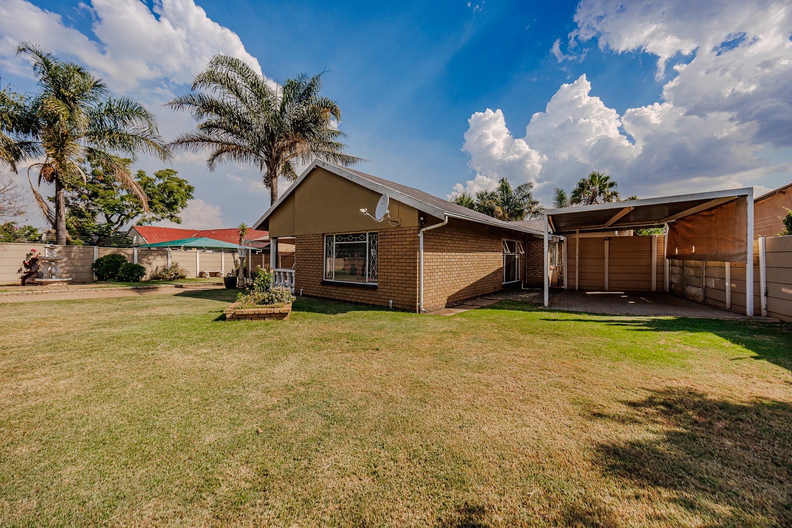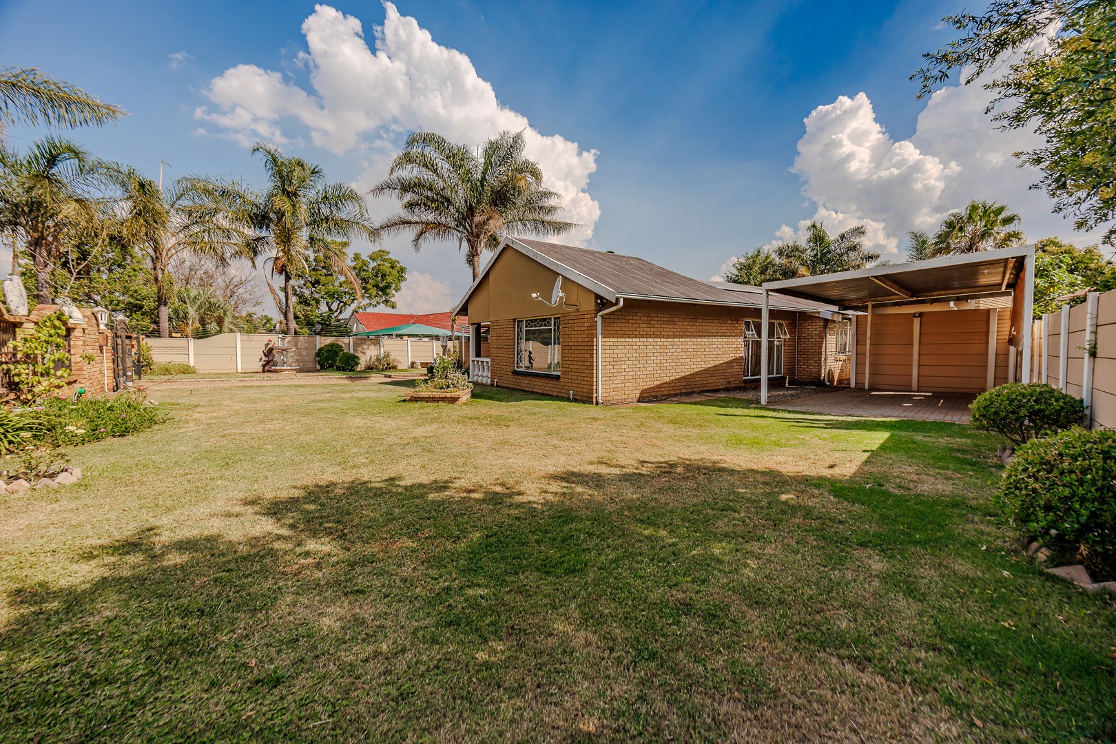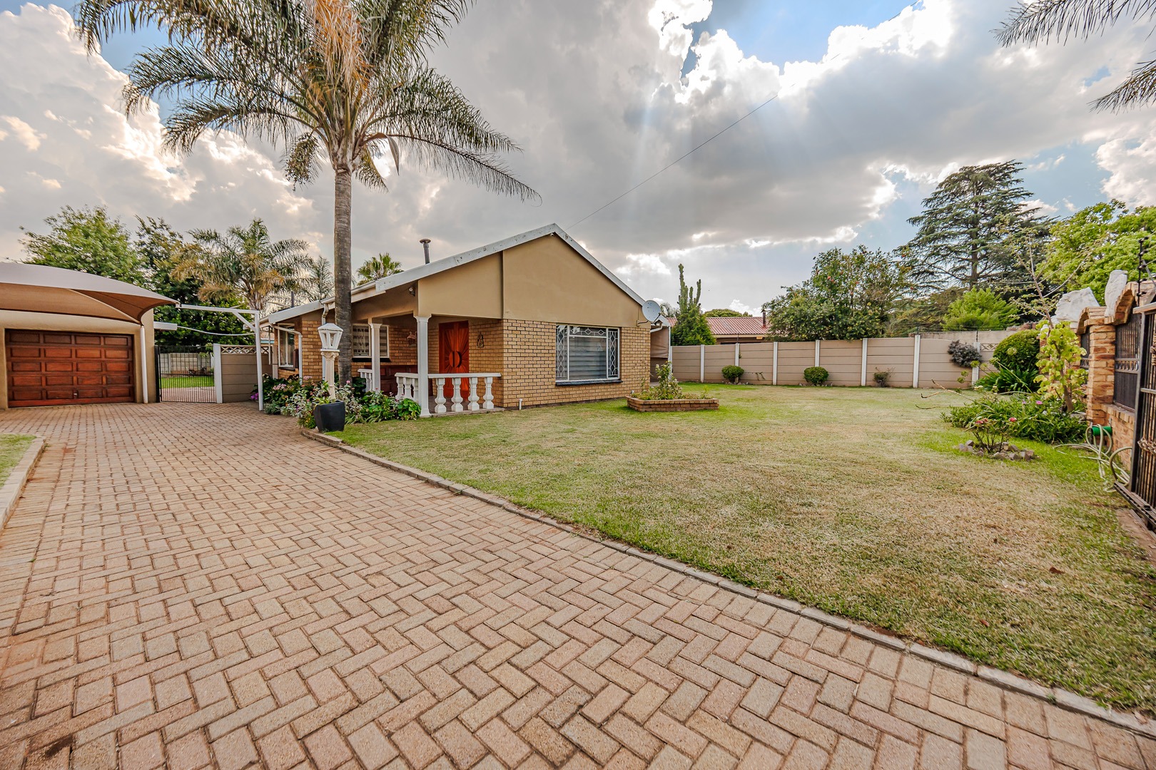 Discover this charming single-story brick home, offering a blend of comfort and practicality in the heart of Witpoortjie. The property immediately impresses with its inviting kerb appeal, featuring a spacious paved driveway leading to a double garage and additional covered carport parking. A welcoming front porch, adorned with pillars and vibrant flower beds, sets an inviting tone, complemented by a generous front lawn and established palm trees, creating a picturesque first impression.