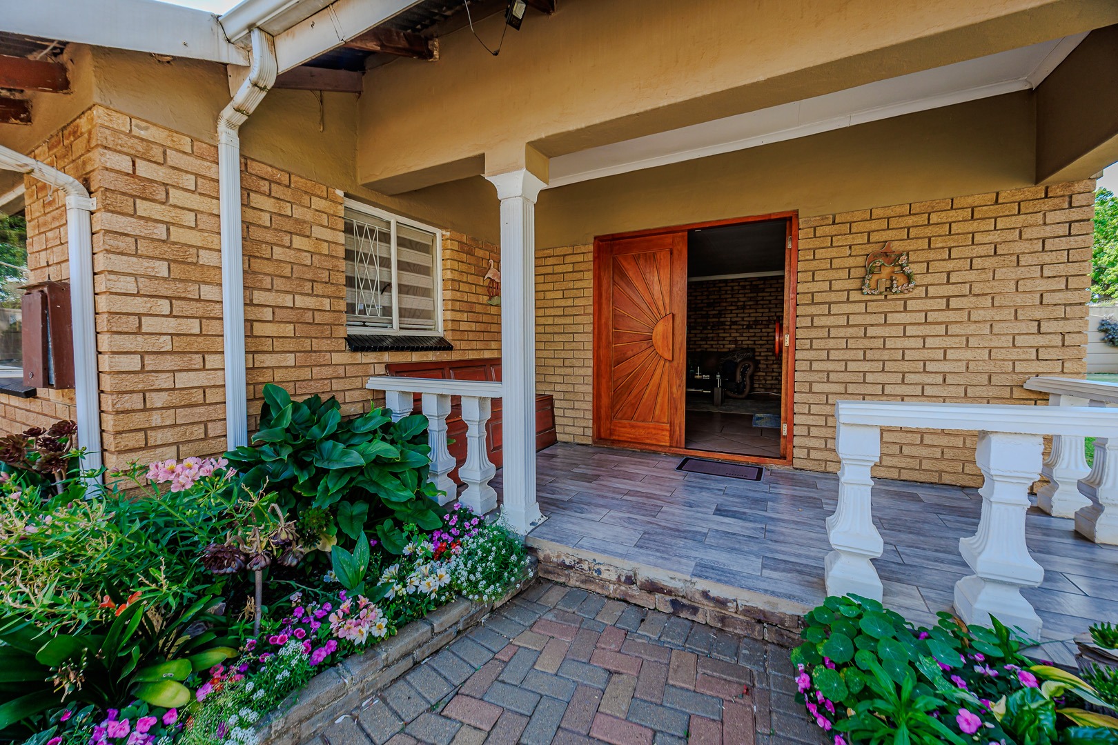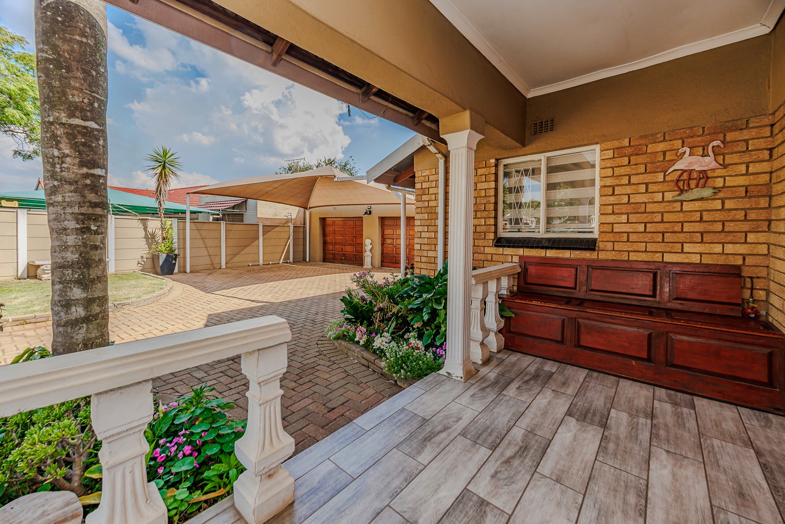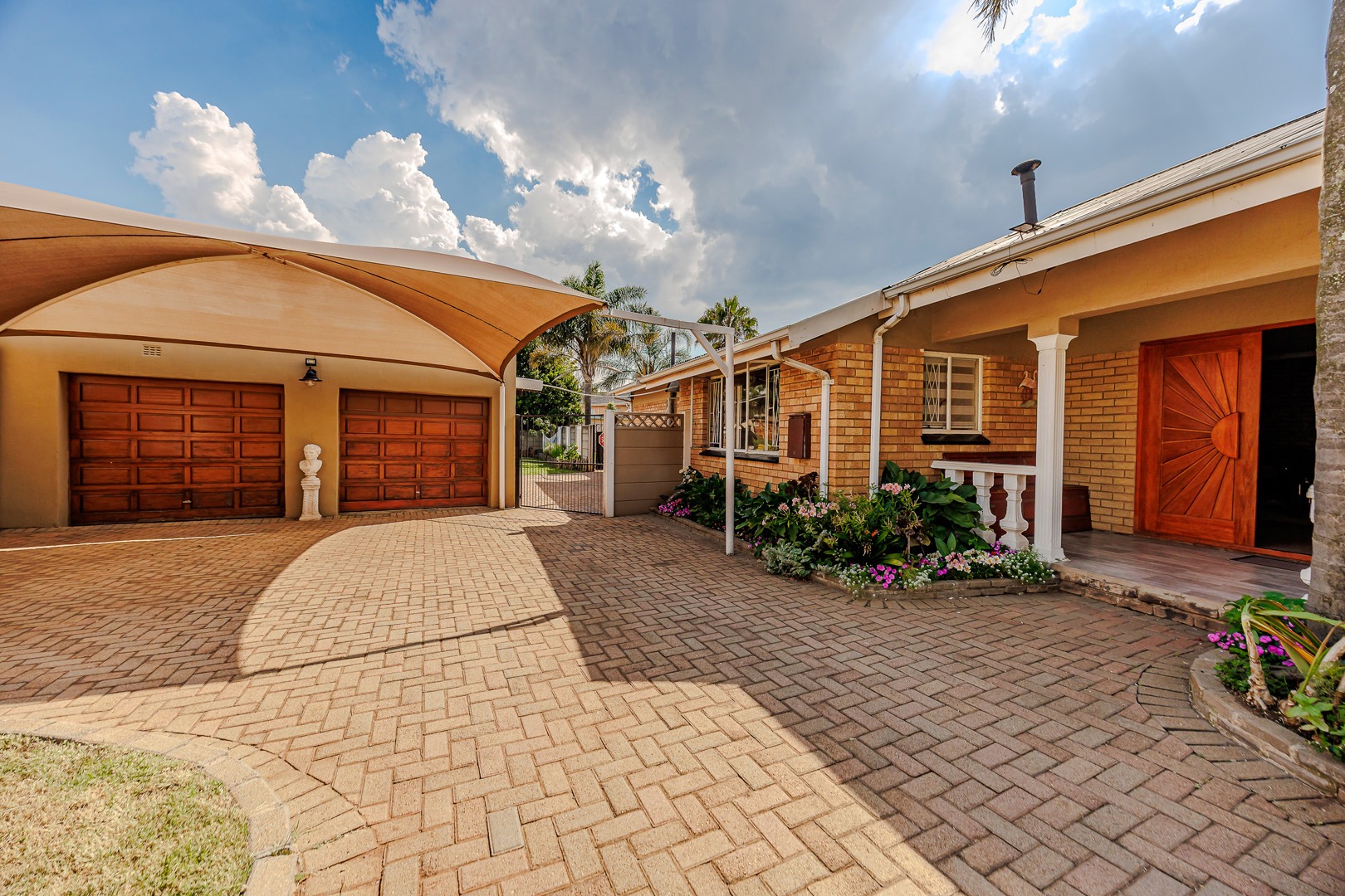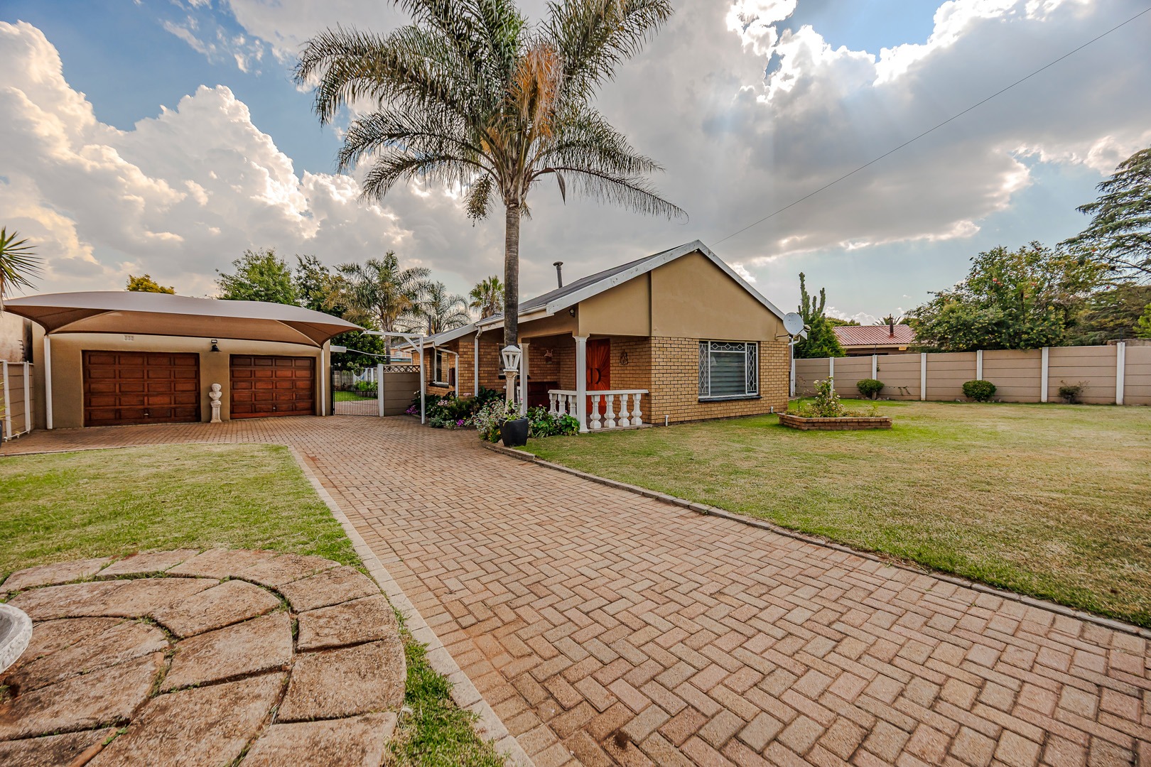 Discover this charming single-story brick home, offering a blend of comfort and practicality in the heart of Witpoortjie. The property immediately impresses with its inviting kerb appeal, featuring a spacious paved driveway leading to a double garage and additional covered carport parking. A welcoming front porch, adorned with pillars and vibrant flower beds, sets an inviting tone, complemented by a generous front lawn and established palm trees, creating a picturesque first impression.