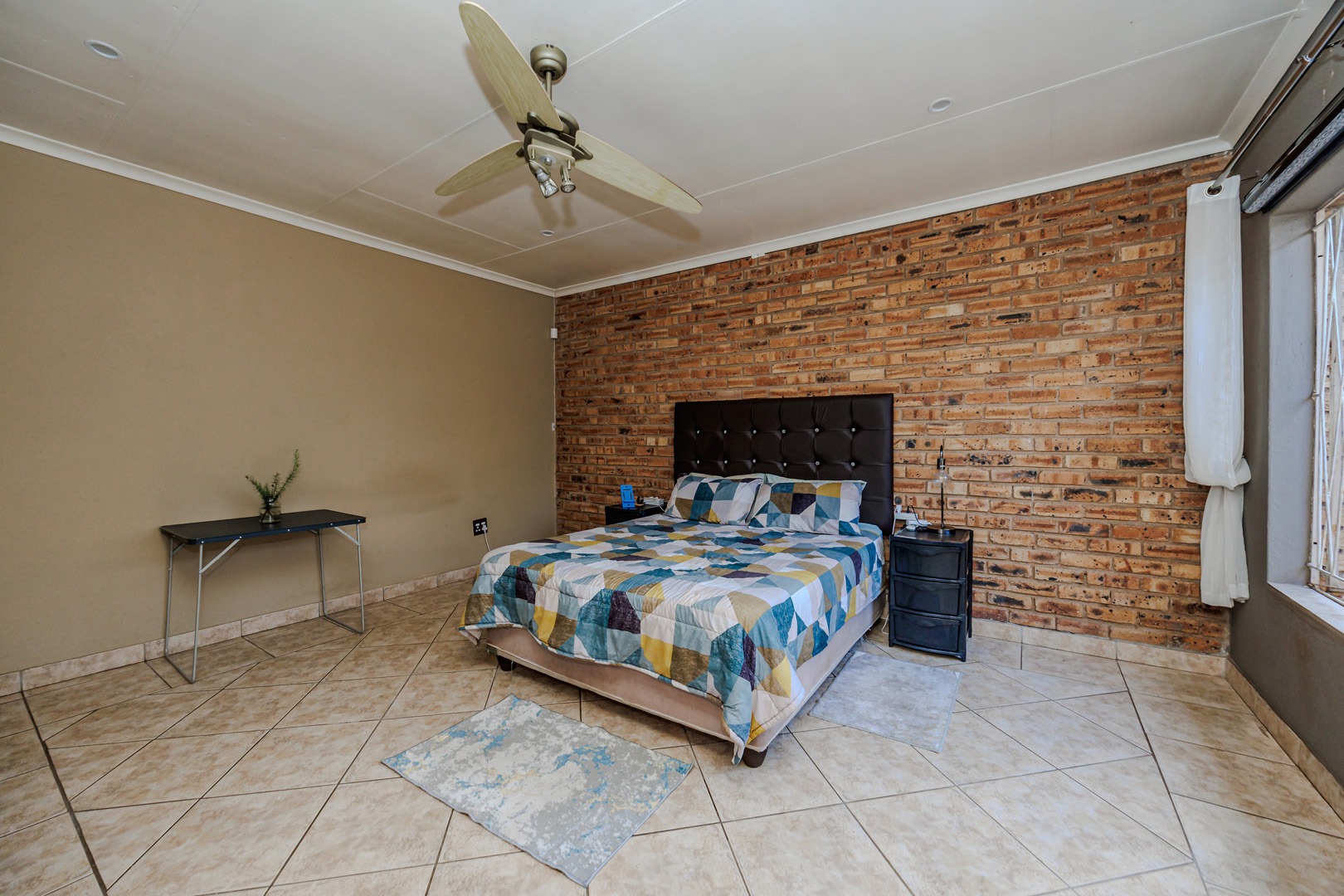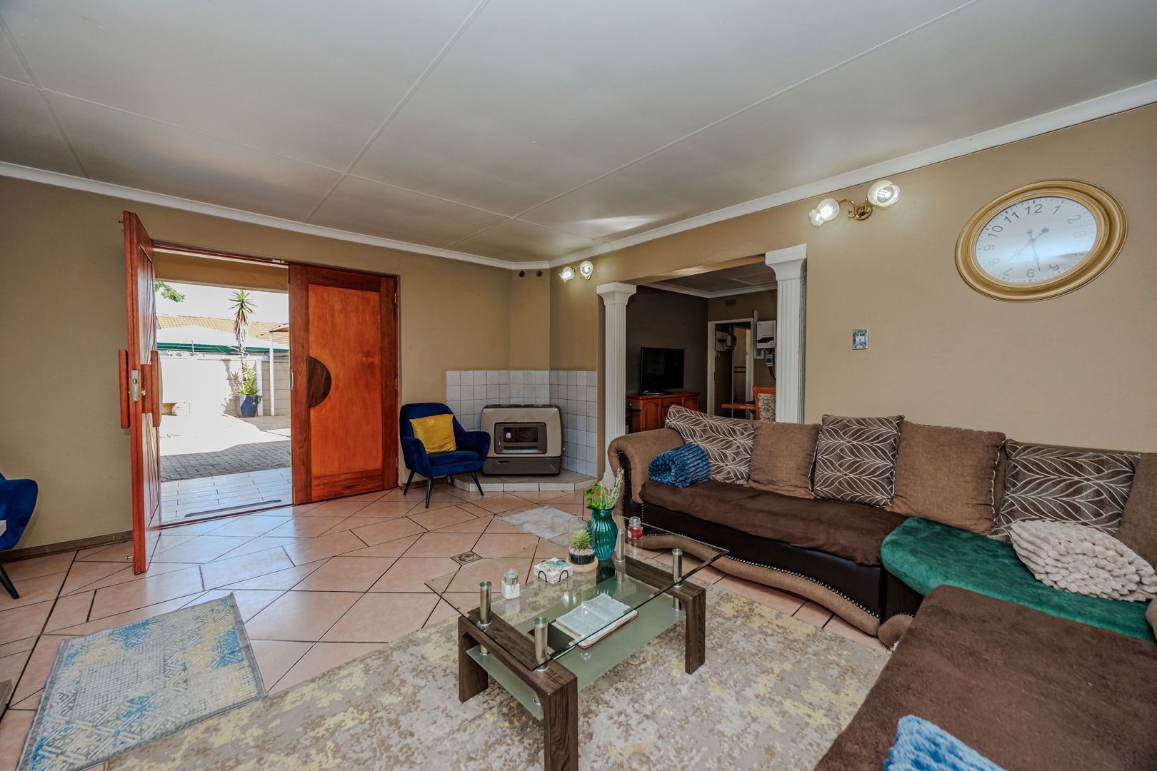 Step inside to an intelligently designed interior that boasts an open-plan layout. The spacious lounge, highlighted by an exposed brick accent wall and decorative pillars, flows seamlessly into the dining area, creating an ideal space for both relaxation and entertaining. A well-appointed kitchen efficiently serves the home's culinary needs.
