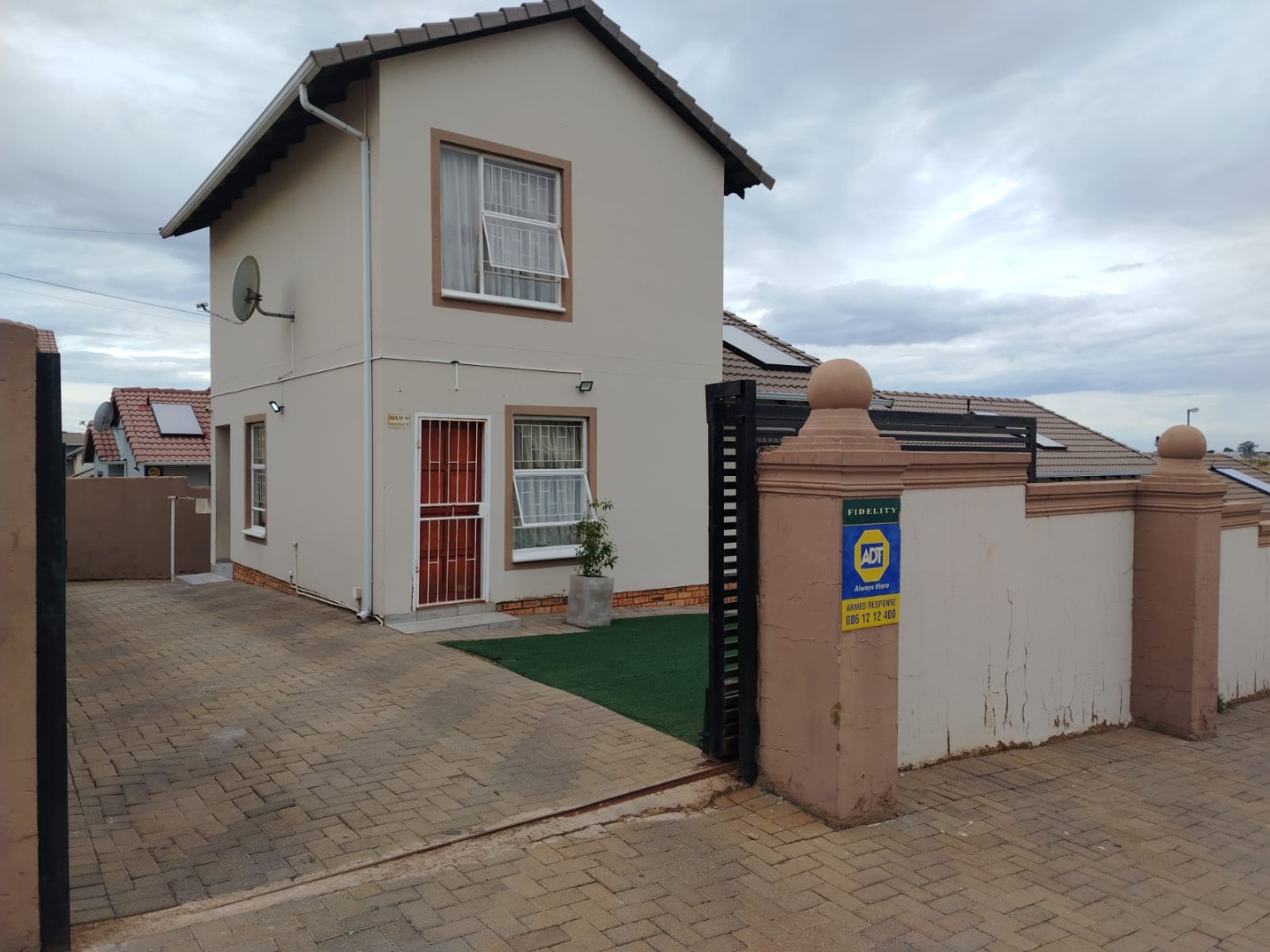 Right from the get-go, this two-story home makes a great impression with its neat, modern exterior, featuring a light beige finish and brown trim. You'll love the low-maintenance outdoor space, complete with a paved driveway for your three parking spots and a patch of artificial turf – perfect for easy living. The private yard, secured by a high boundary wall, gives you that extra peace of mind.