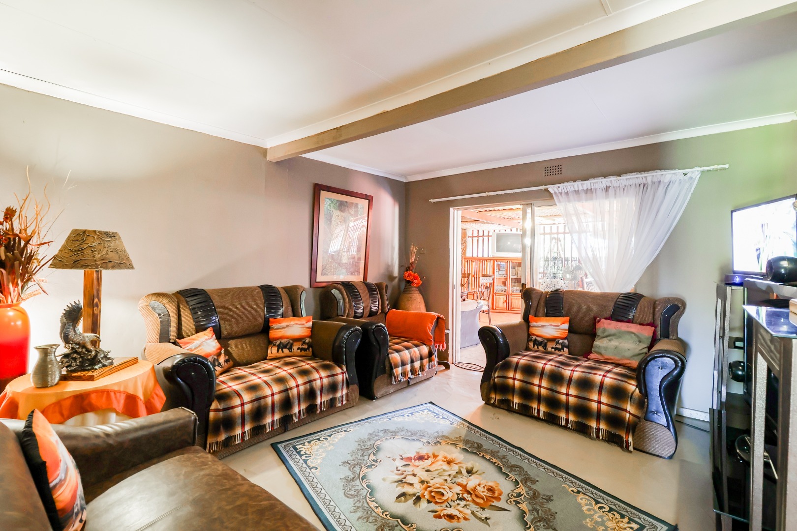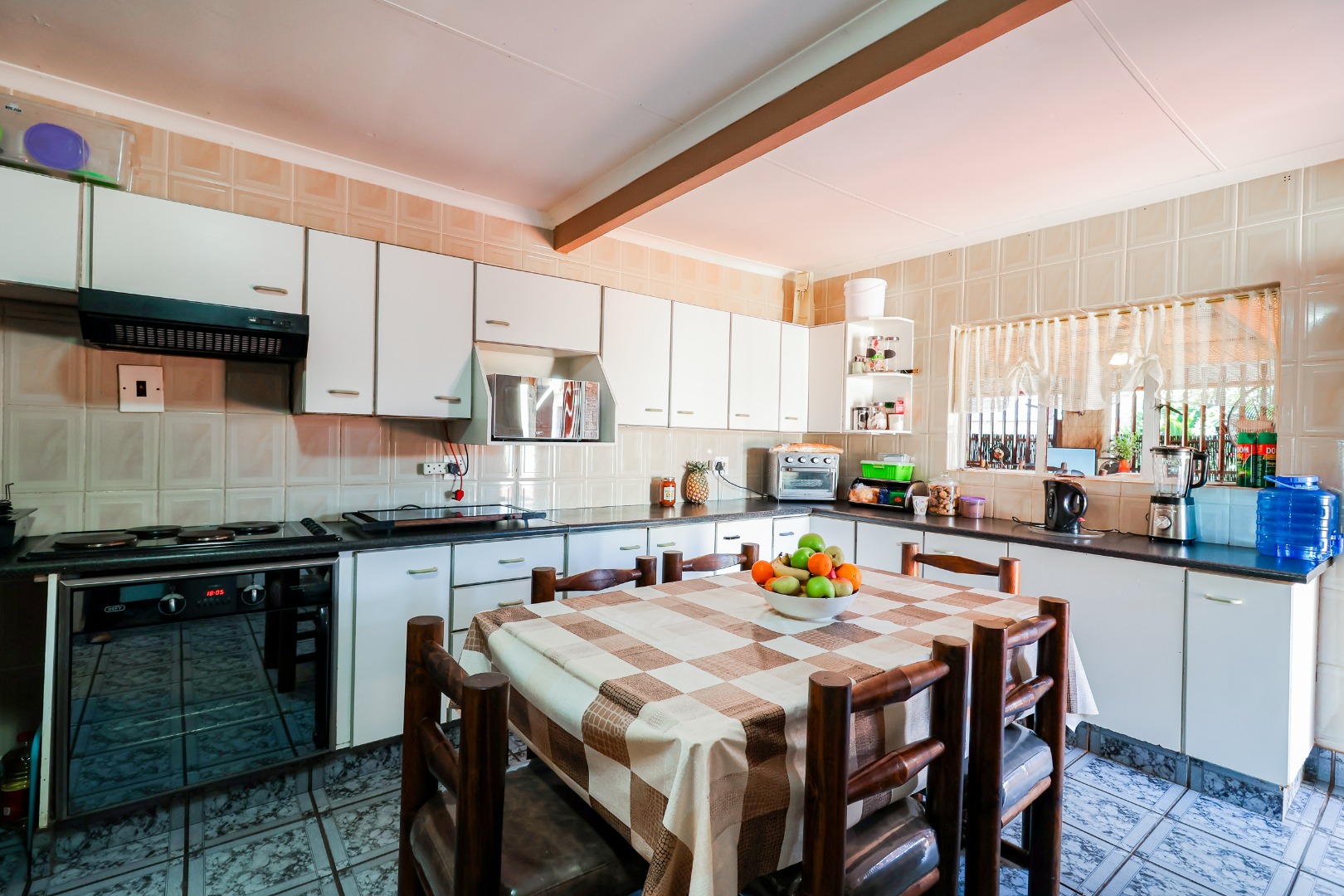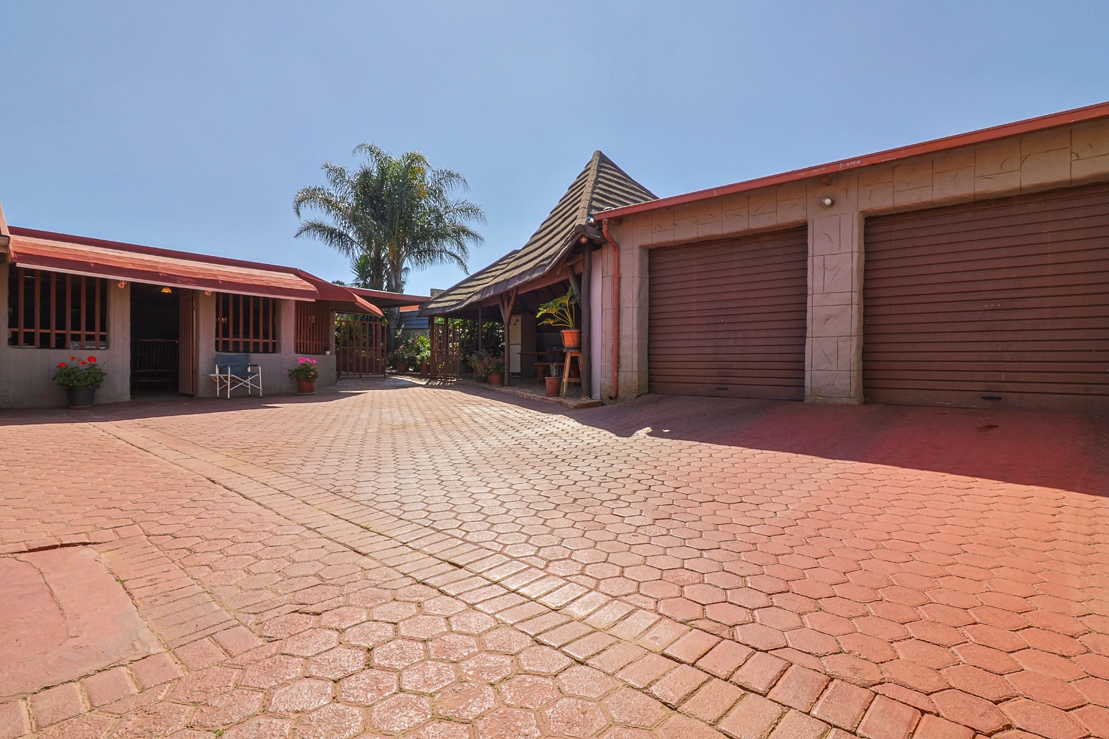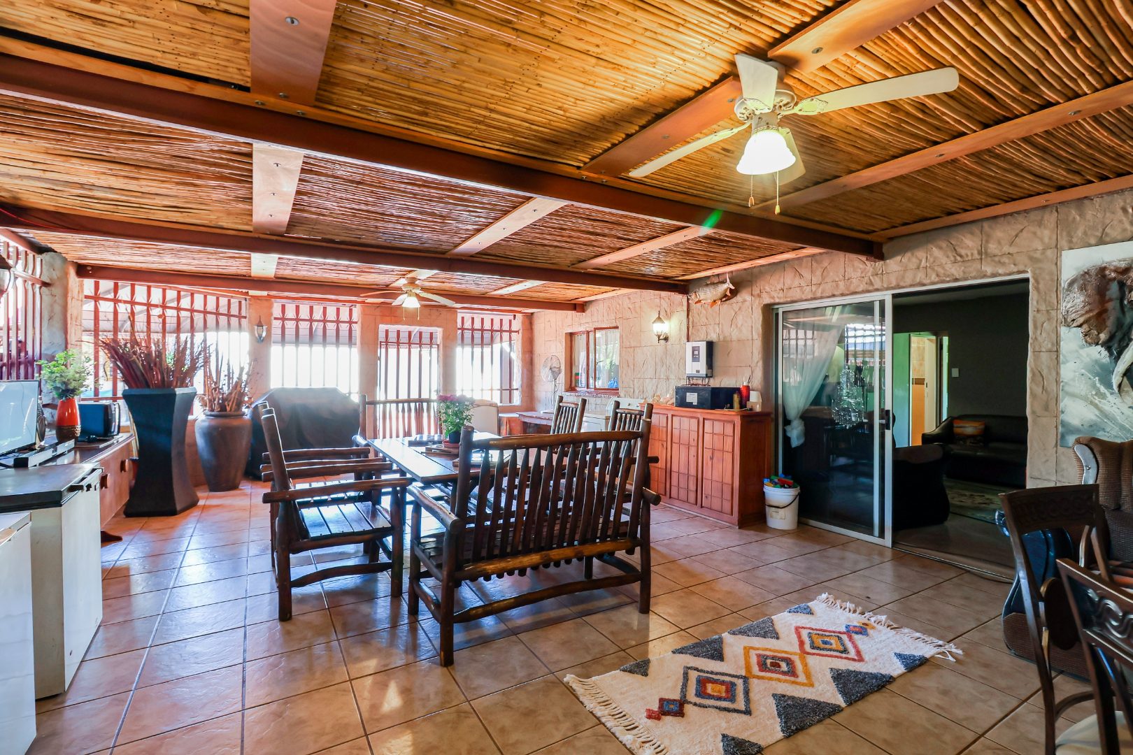 One of the real highlights here is the fantastic outdoor living. You'll love the spacious covered patio with its rustic bamboo ceiling and ceiling fans, perfect for relaxing. Plus, there's an awesome lapa featuring a traditional thatched roof, a built-in braai, and a bar area – ideal for those South African get-togethers! The property also includes two garages and four additional parking spaces, so there's always room for your vehicles and guests.