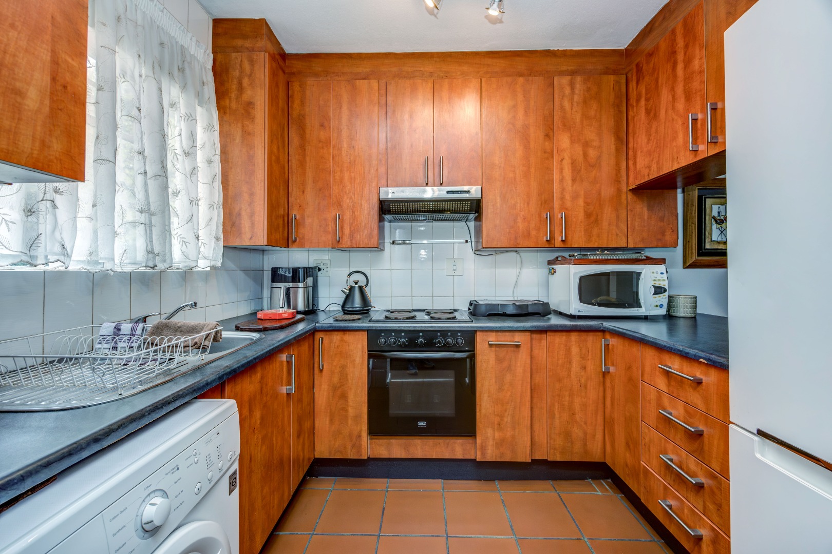 Situated in a secure complete, open plan lounge/dining area, leading to covered patio and nice size garden, 1 bedroom (new carpets), 1 bathroom (bath with shower in bath), kitchen with loads of cupboards, original kitchen was replaced, space for fridge and 1 appliance, extra cupboard space in the dining area and 1 carport.