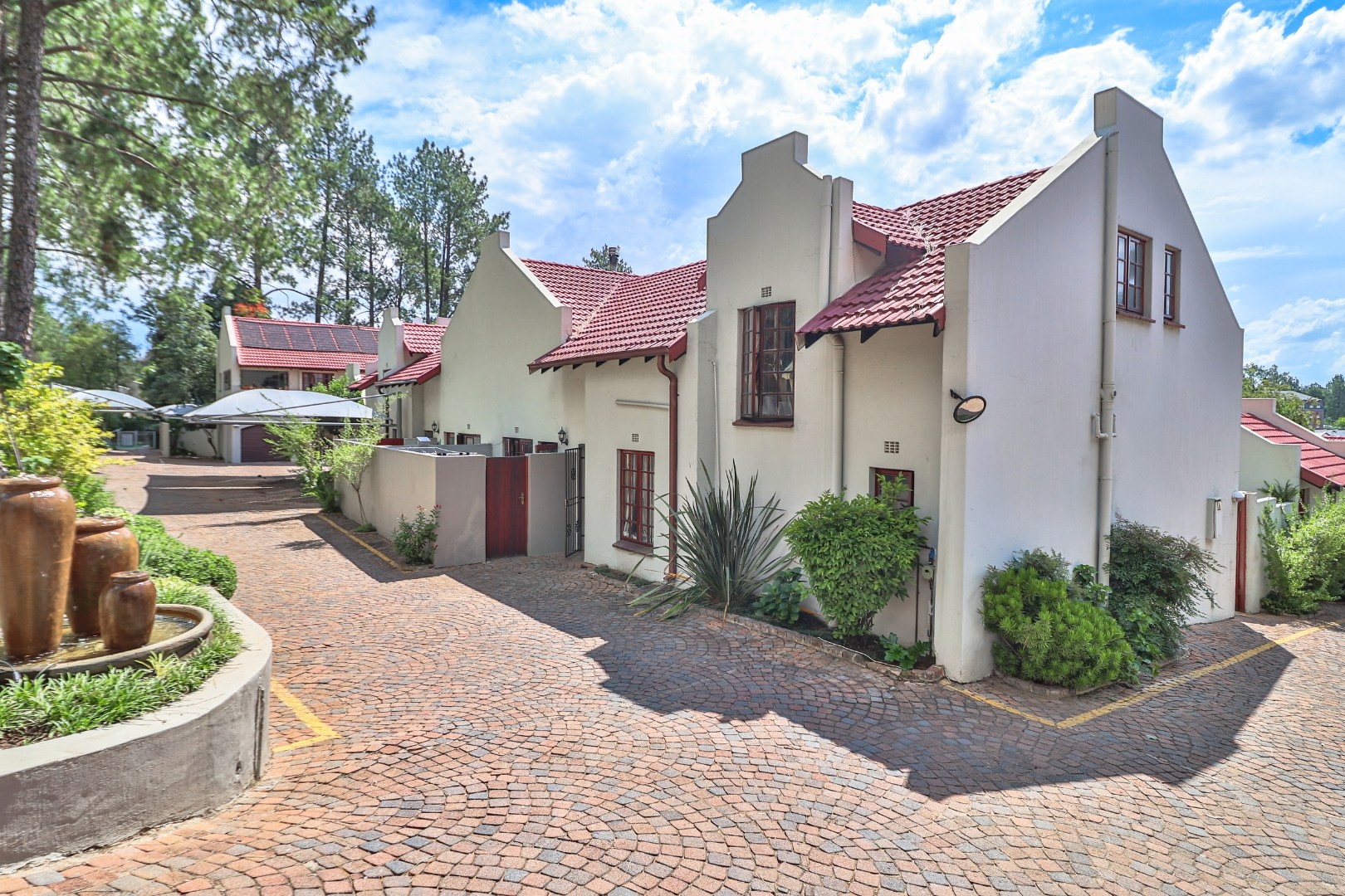 Step into this lovely 3-bedroom, 2-bathroom unit nestled in a charming complex in Bryanston. You will immediately notice the inviting gabled architecture with its classic red tiled roofs and crisp white exteriors - all set within beautifully maintained grounds featuring a cobbled driveway and enormous trees! Each unit enjoys a private entrance, giving you that extra sense of home.