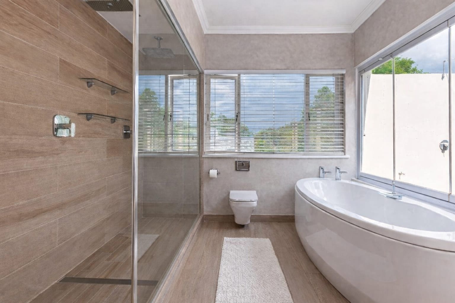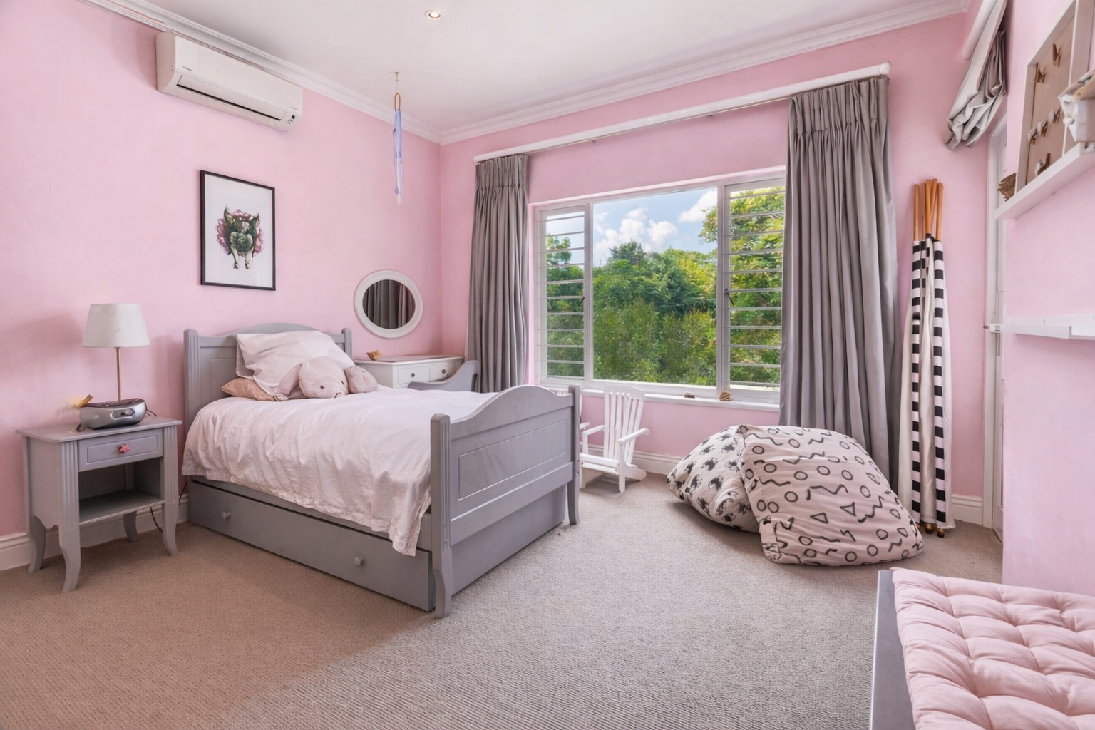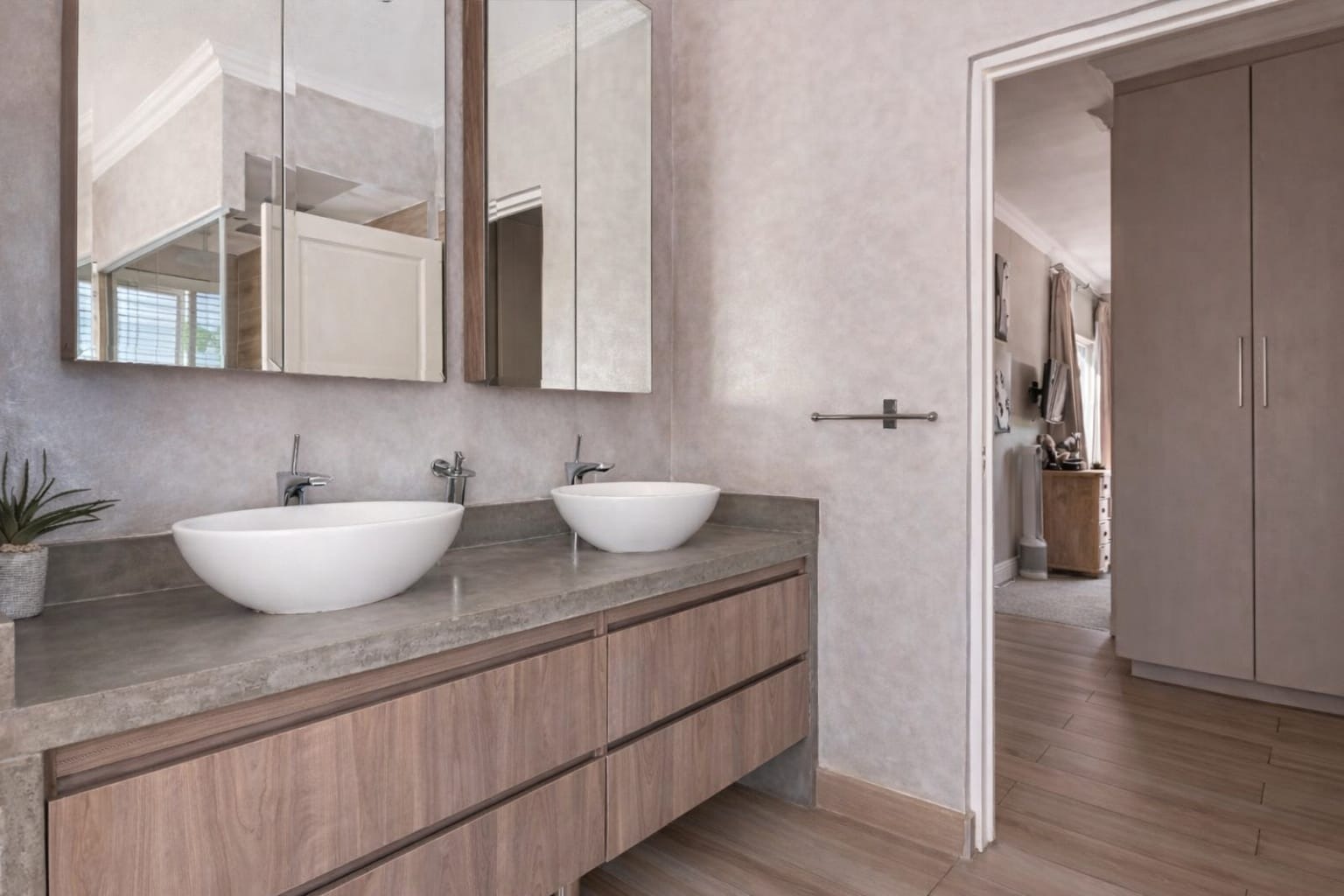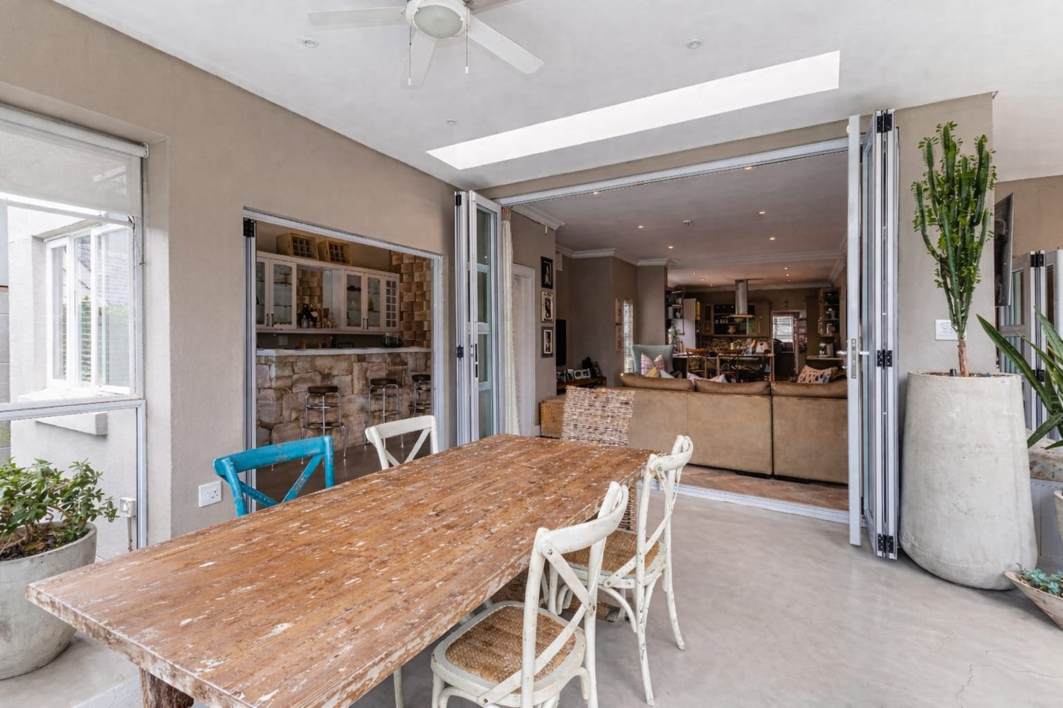 A striking double-volume entrance leads to multiple interleading living spaces that open onto a fully enclosed entertainer’s patio with fitted bar. The outdoor offering is outstanding, a decked lapa, pizza oven, braai area, relaxed seating zones and a dedicated children’s play area, all designed for year-round hosting.