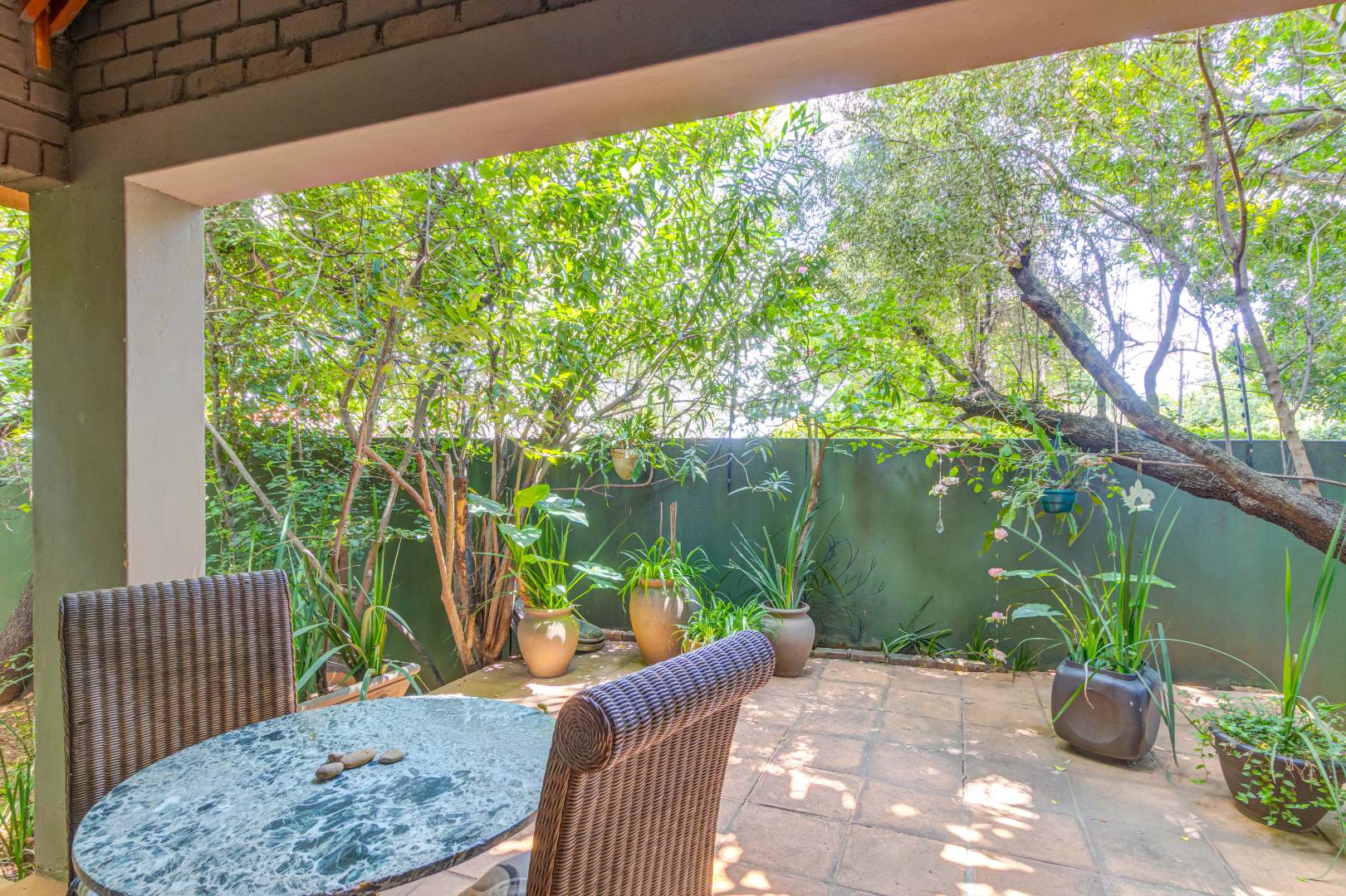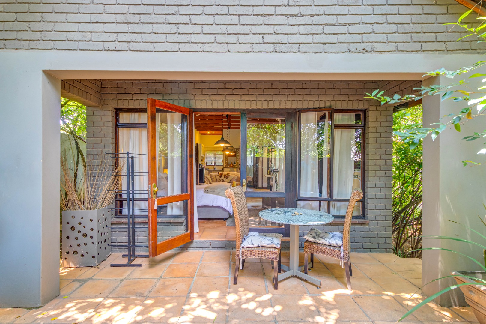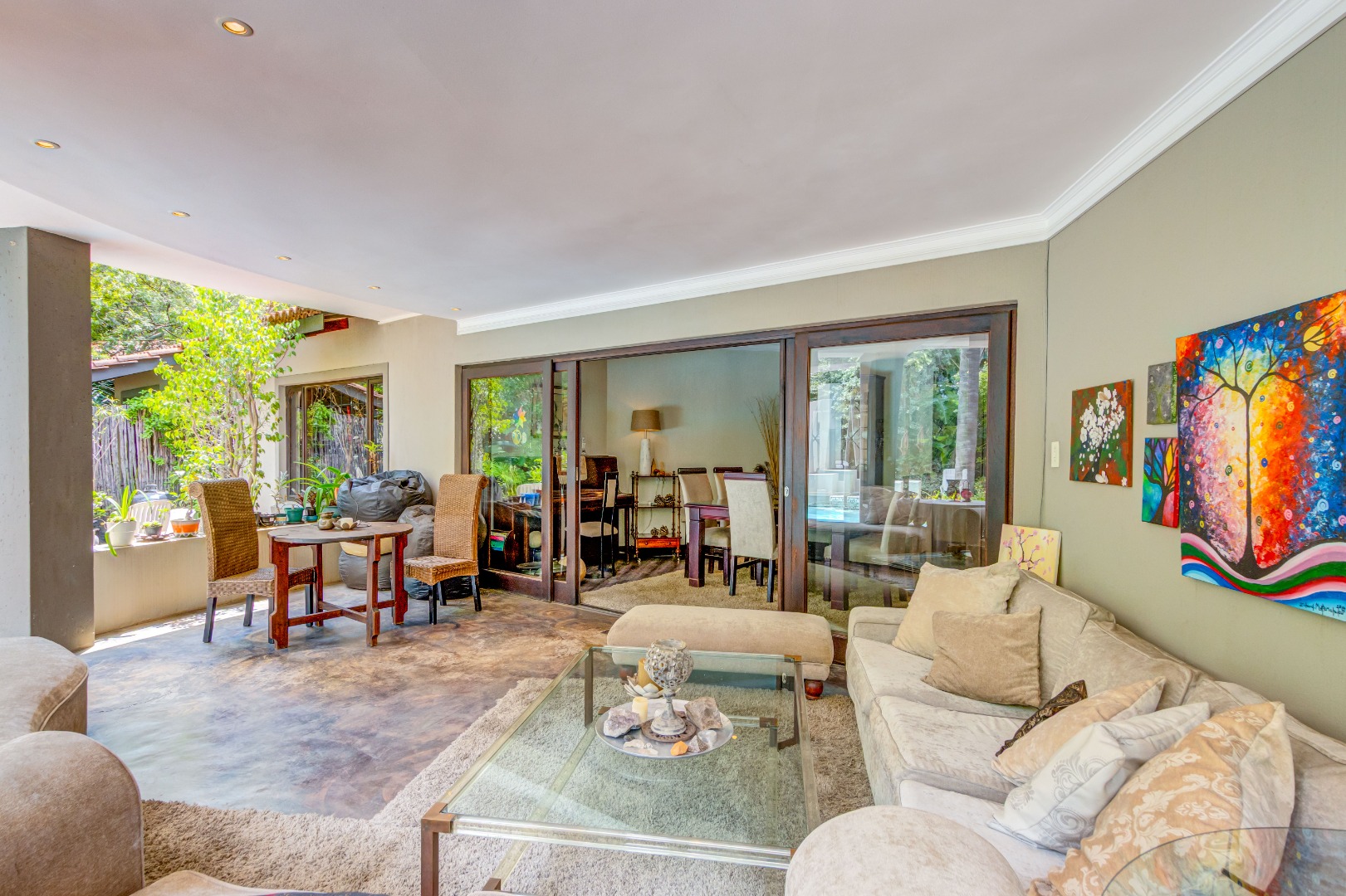 Large stacking glass doors connect the dining room and living spaces to this courtyard, enhancing the sense of space and flow. A further elevated terrace with shaded seating offers leafy treetop views, an inviting retreat for morning coffee, sunset sundowners or a relaxing meditation.
