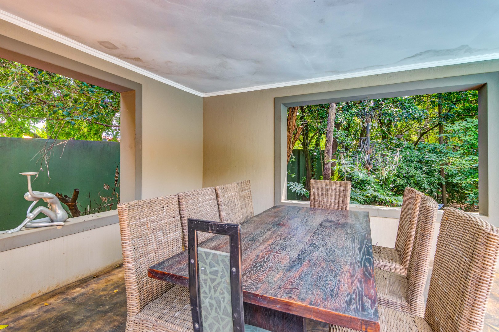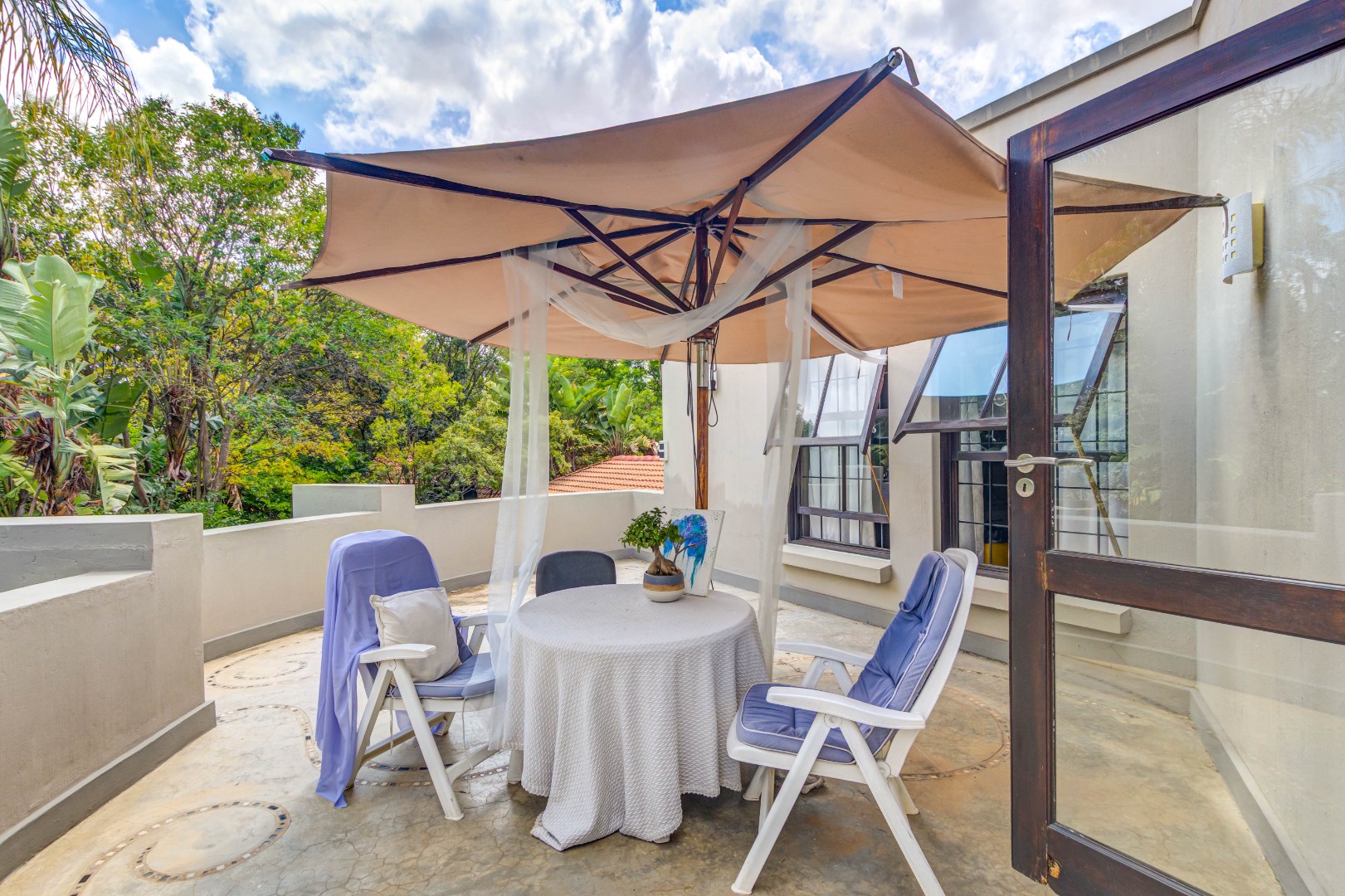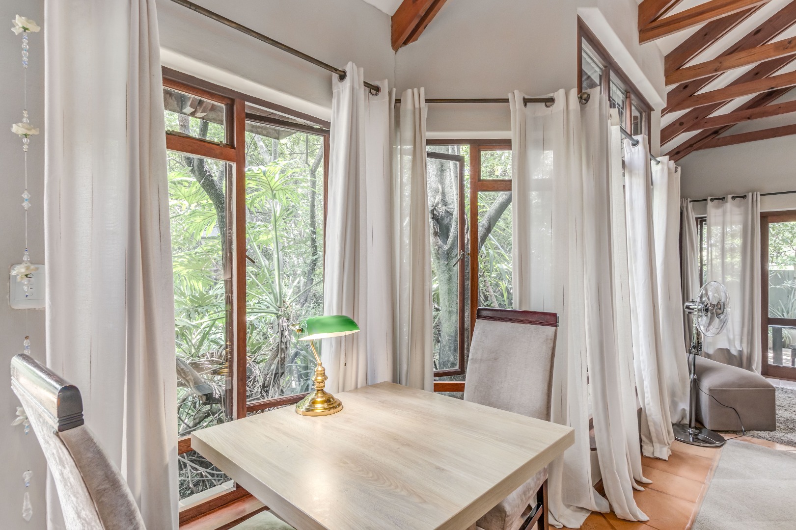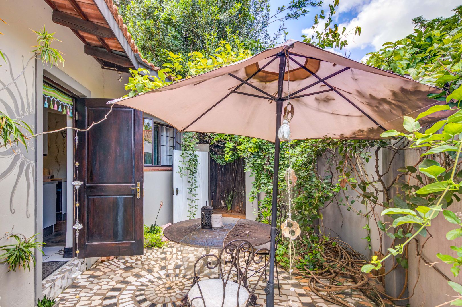 Large stacking glass doors connect the dining room and living spaces to this courtyard, enhancing the sense of space and flow. A further elevated terrace with shaded seating offers leafy treetop views, an inviting retreat for morning coffee, sunset sundowners or a relaxing meditation.