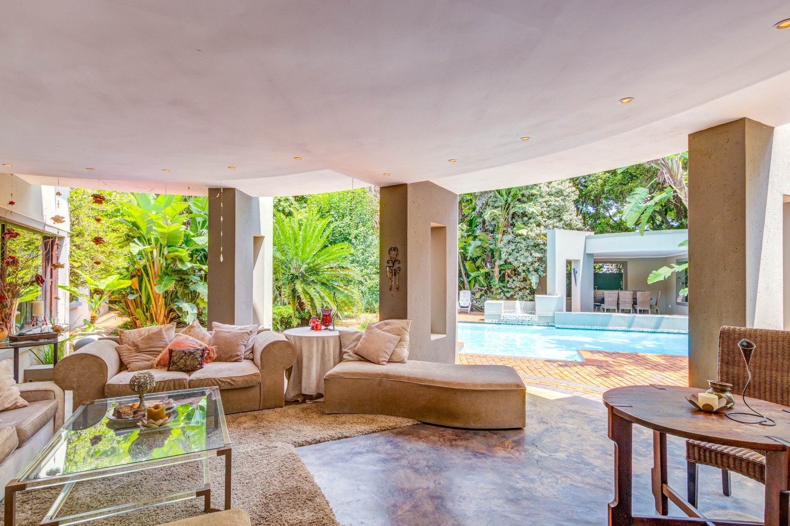 At the centre of the home is a magnificent, covered patio lounge that opens directly onto the pool terrace. Overlooking the swimming pool and surrounded by lush tropical planting, this tranquil outdoor haven is perfectly suited to relaxed family days or hosting memorable gatherings with friends.