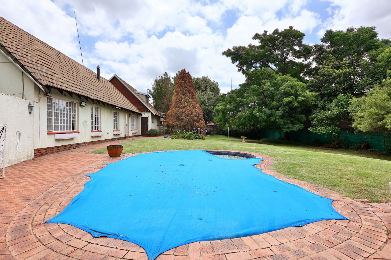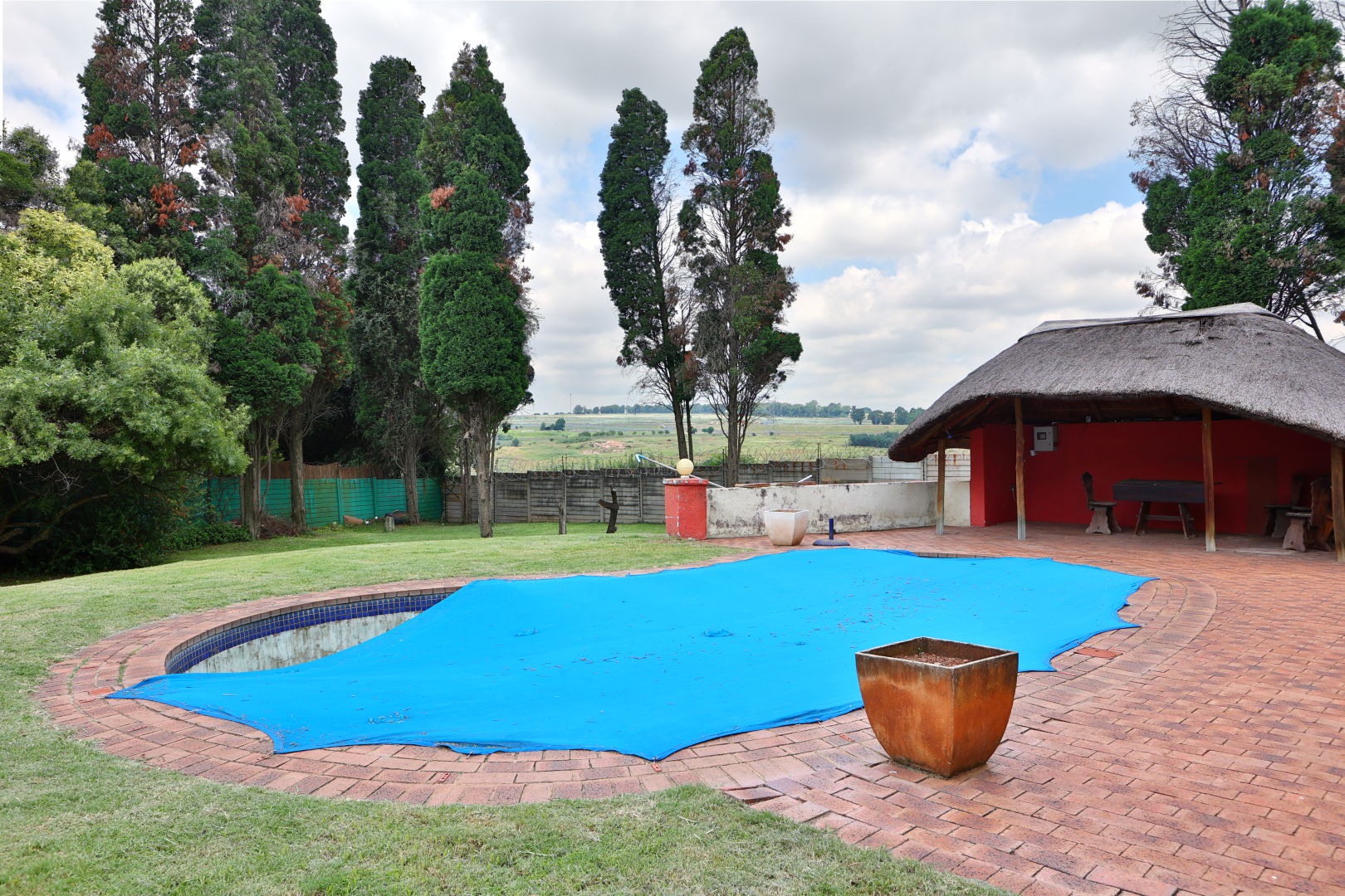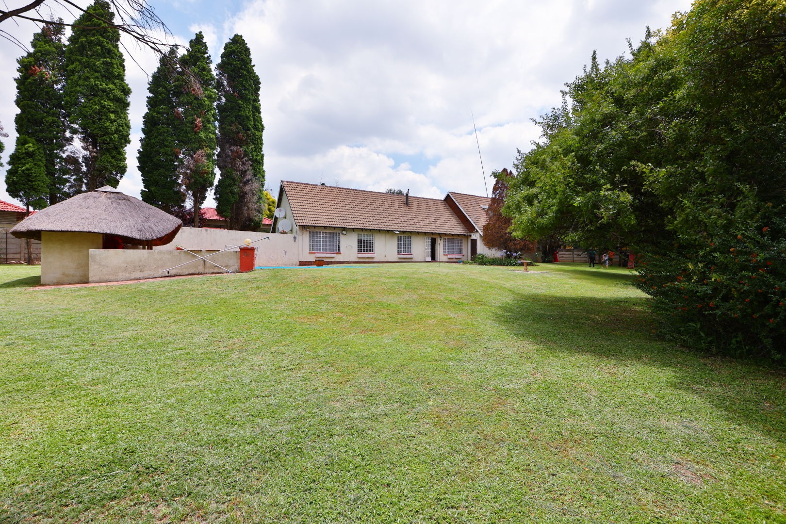Outdoor living is enhanced by a refreshing swimming pool and a lapa, perfect for relaxation and entertaining. The expansive 2031 sqm erf includes a garden, making it pet-friendly. Additional amenities include staff quarters and outside toilets.