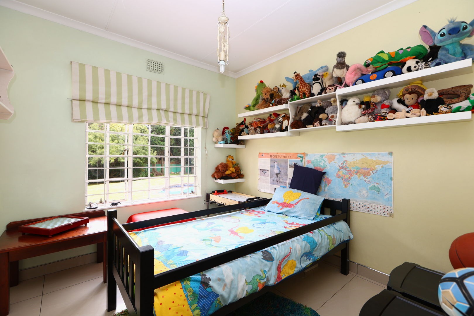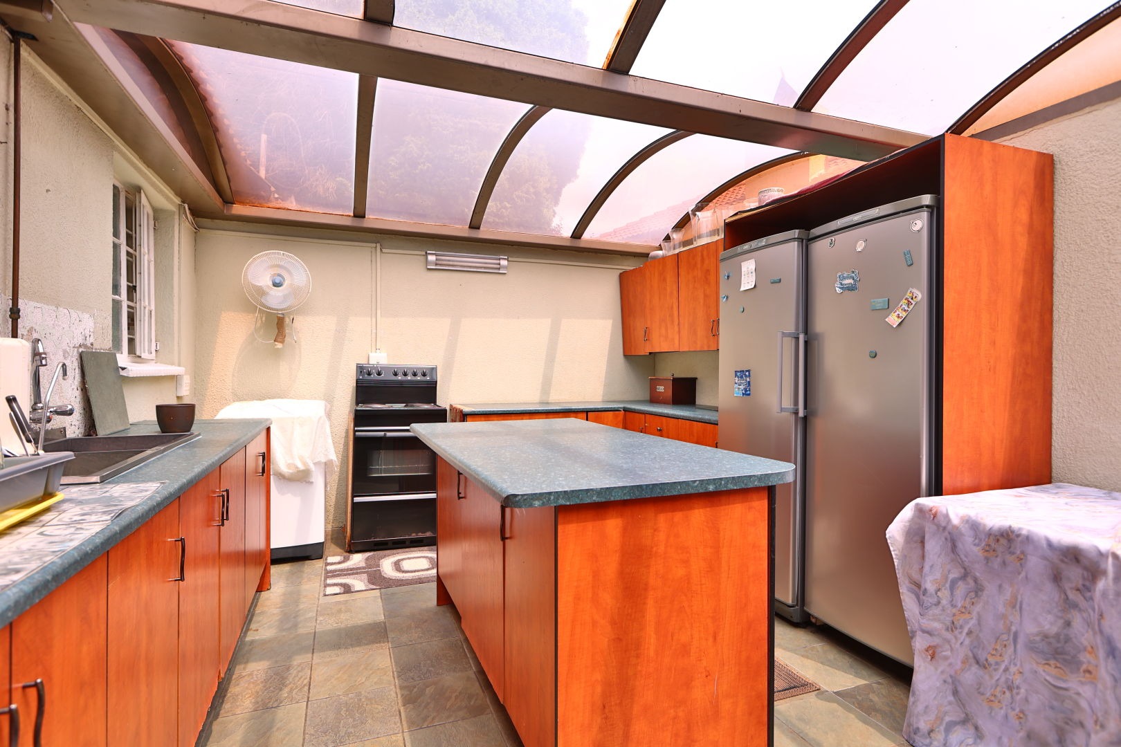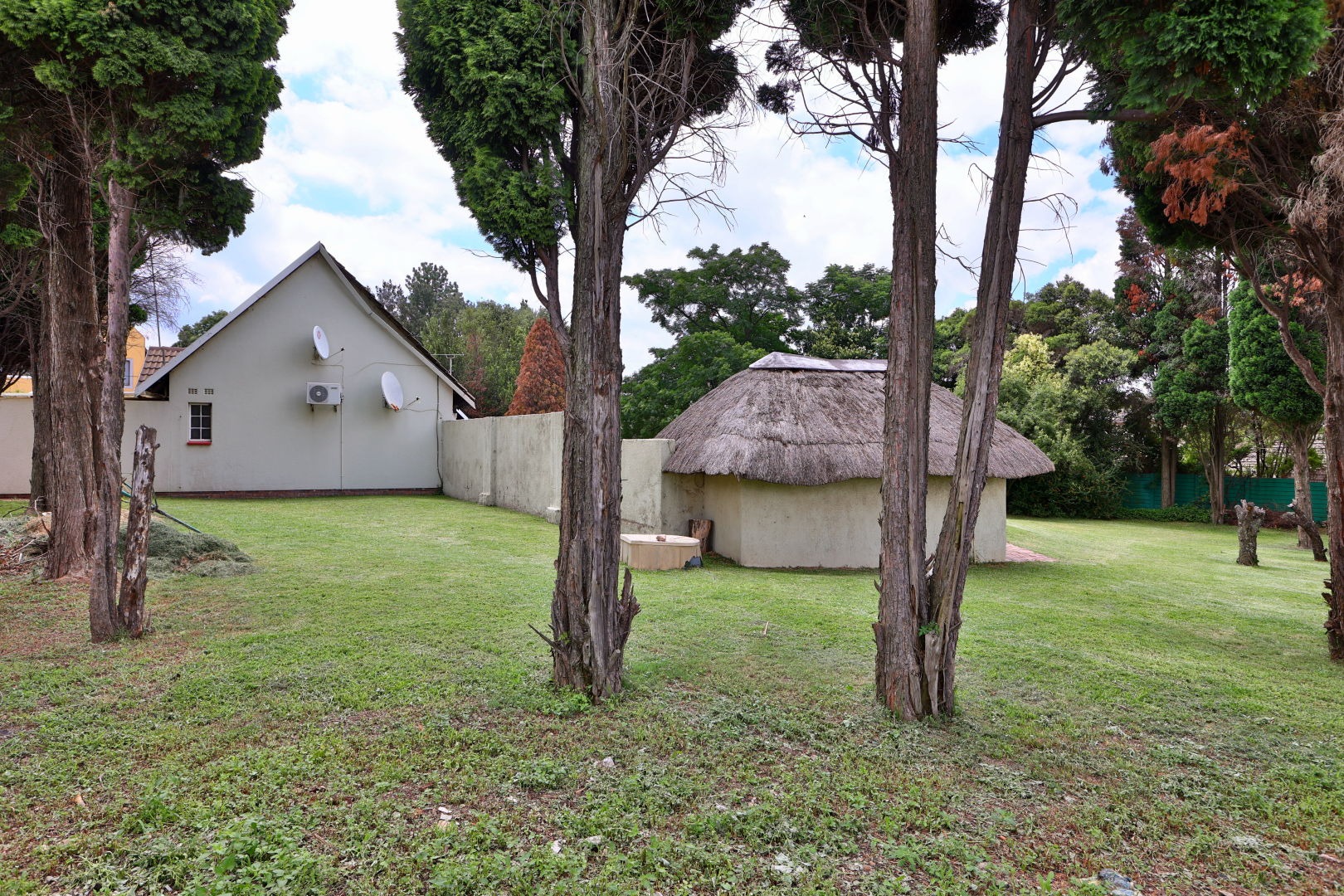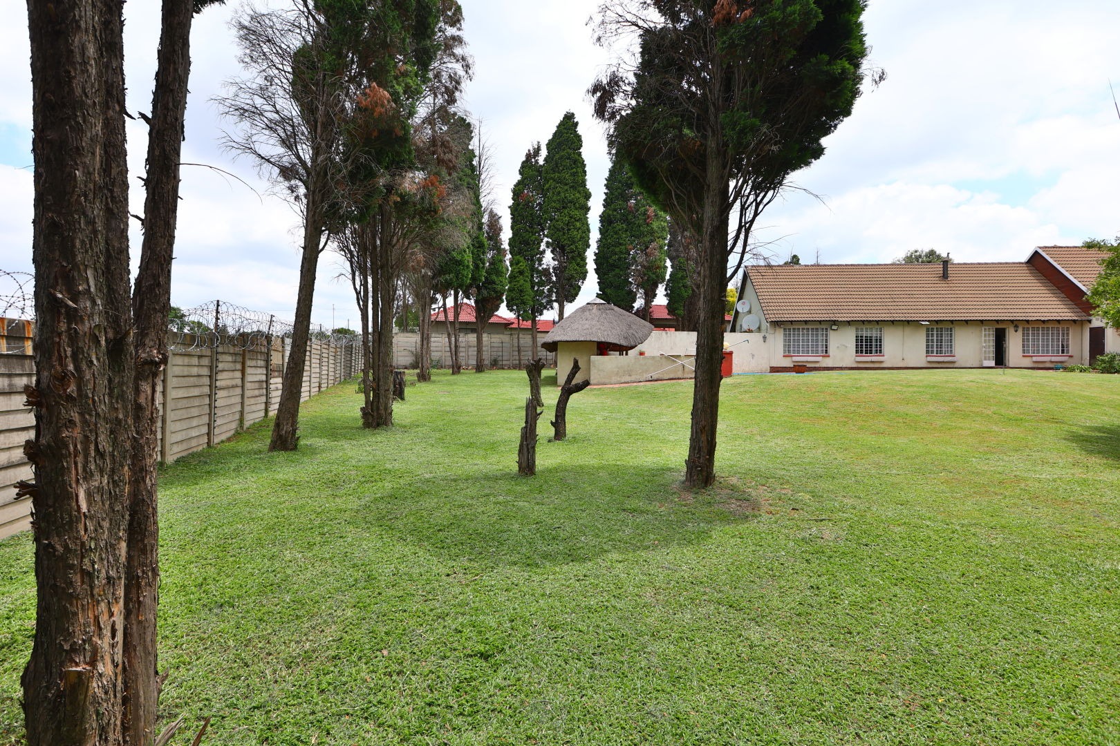 Outdoor living is enhanced by a refreshing swimming pool and a lapa, perfect for relaxation and entertaining. The expansive 2031 sqm erf includes a garden, making it pet-friendly. Additional amenities include staff quarters and outside toilets.