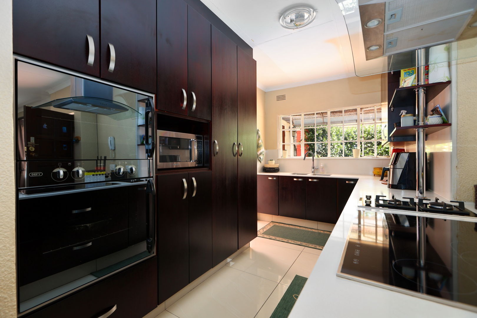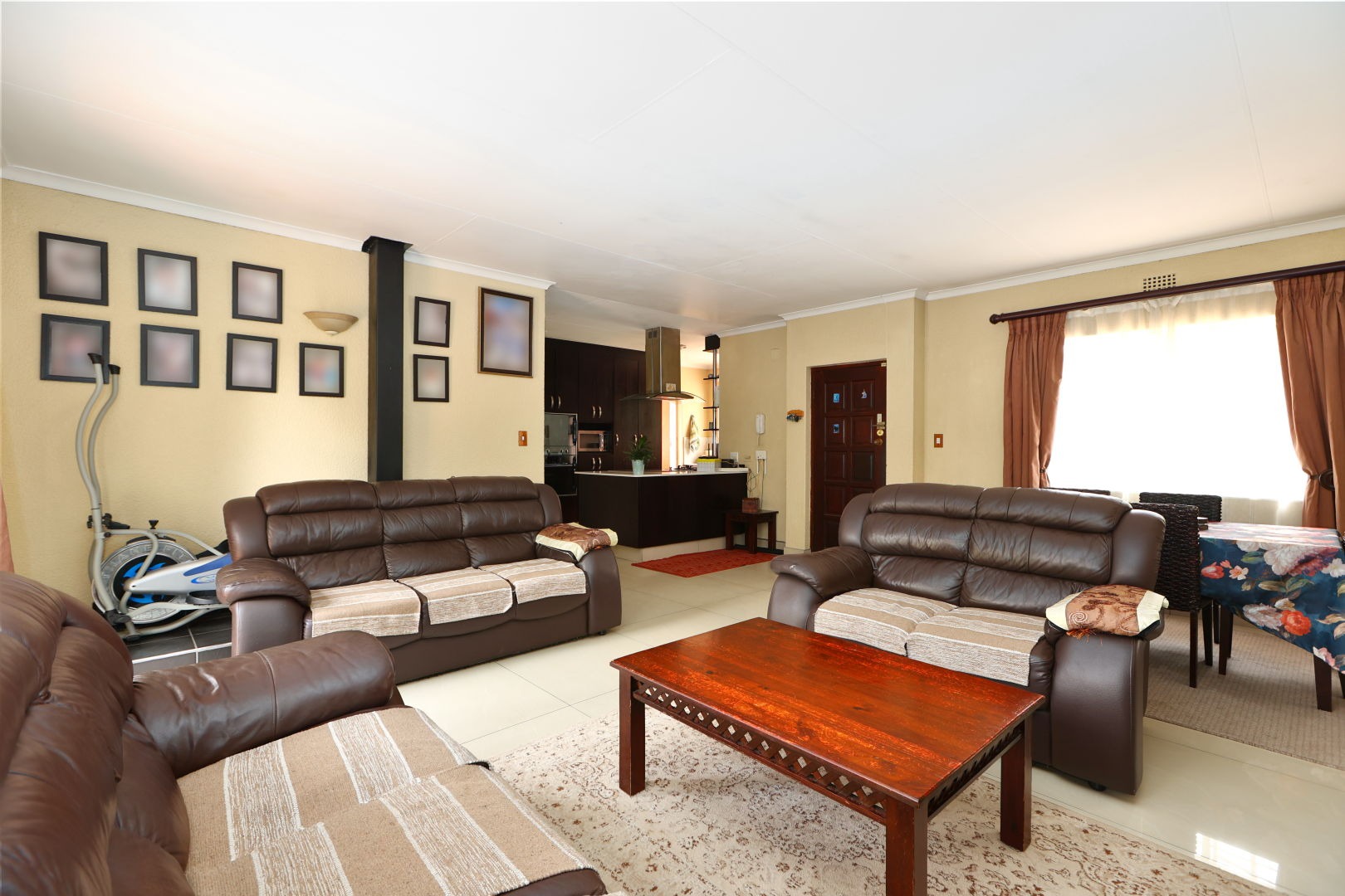 Step inside to an open-plan living, dining, and kitchen area, designed for modern family life and entertaining. Tiled flooring flows throughout, complemented by abundant natural light. The contemporary kitchen is a highlight, boasting dark cabinetry, Caesarstone white granite countertops, integrated appliances, and a practical breakfast bar. A convenient pantry provides additional storage.