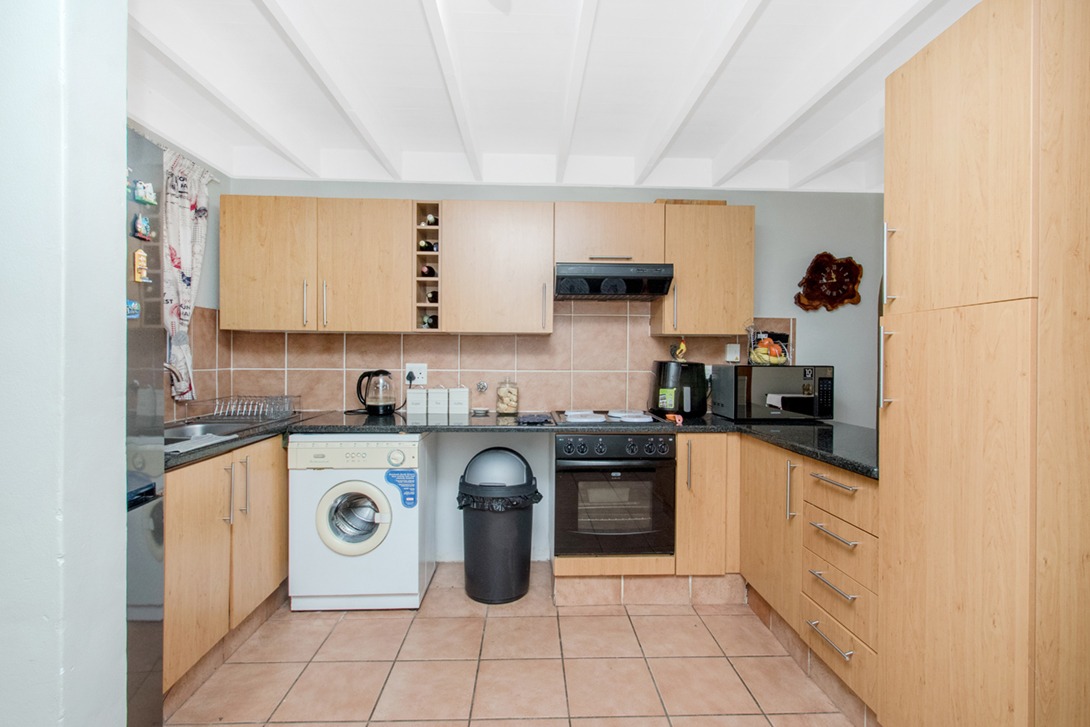 The smart granite kitchen has plenty of storage space and accommodates your washing machine, dishwasher and single door fridge.