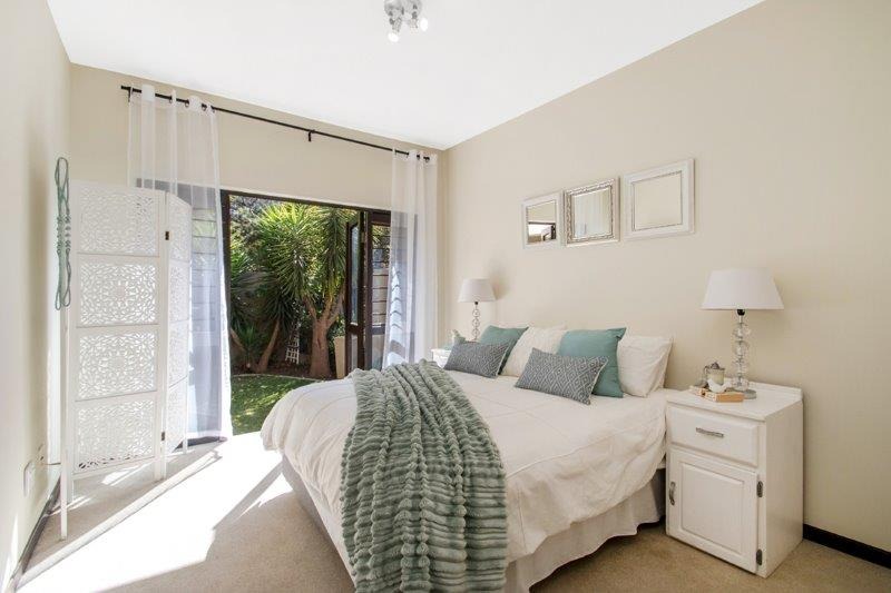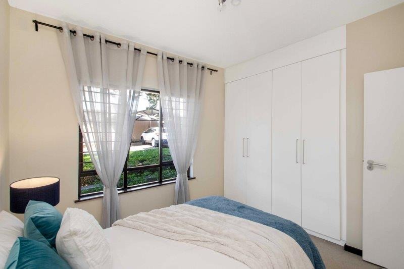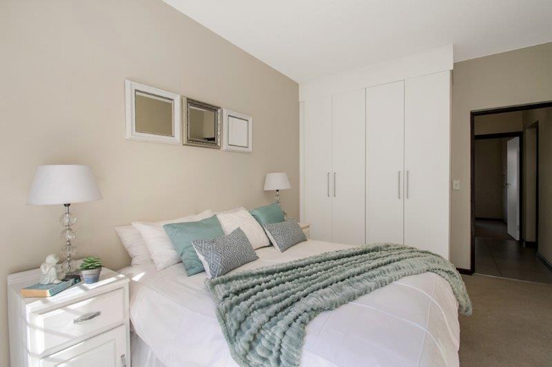 The property offers two generously-sized bedrooms, both of which are fitted with built-in cupboard and are carpeted. The main bedroom is bathed in sunlight and has doors opening out to the manicured garden area
