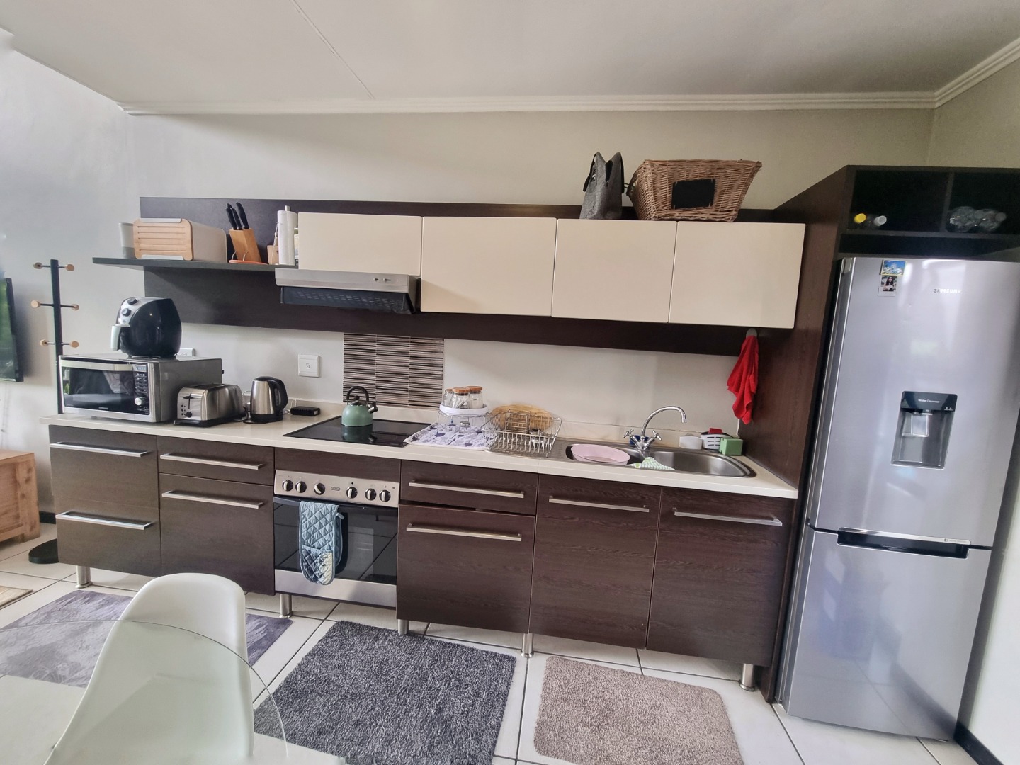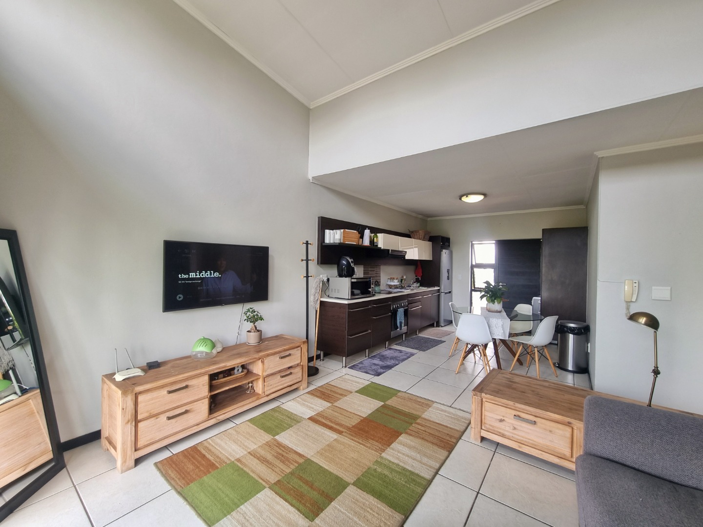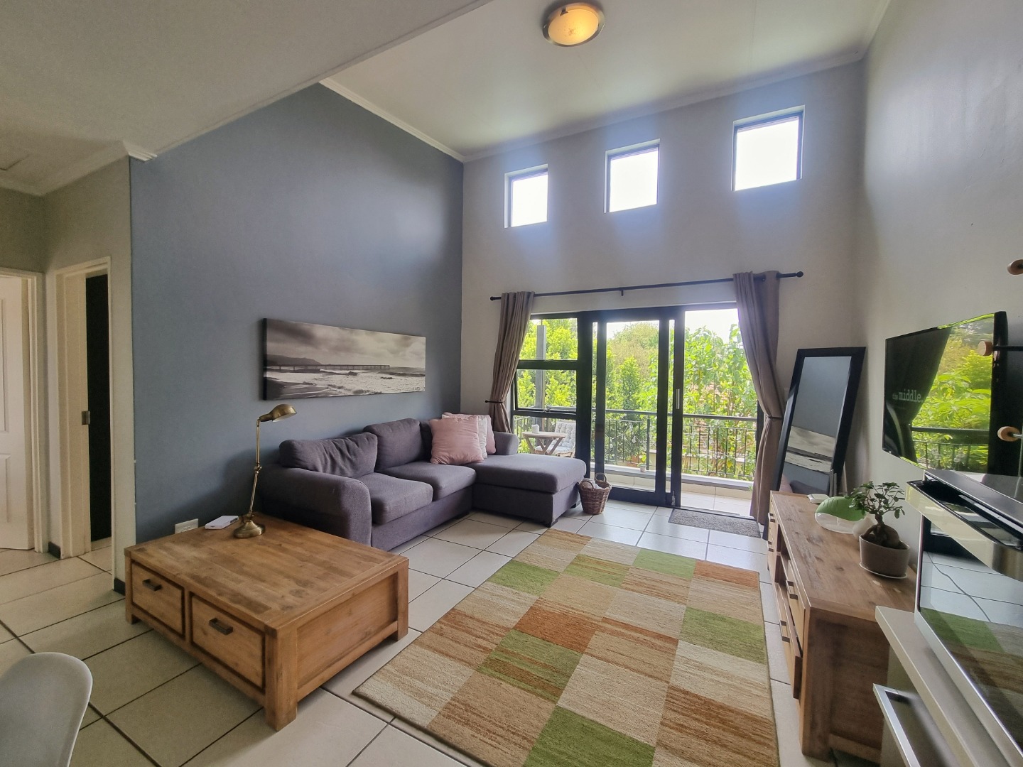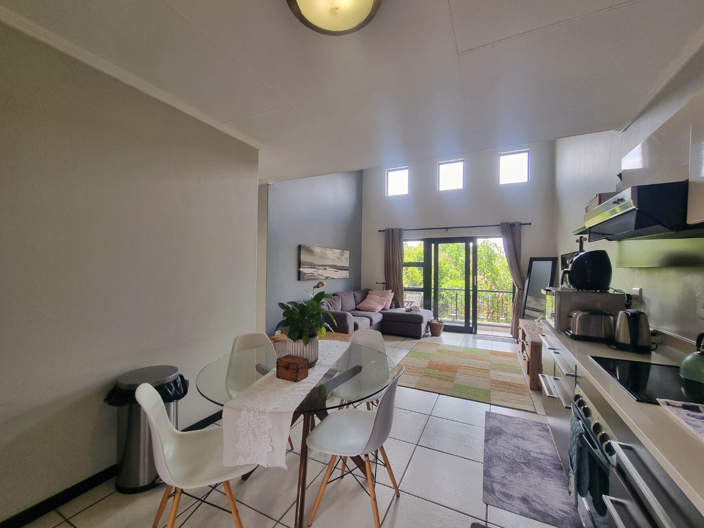 A functional, contemporary kitchen with space for two appliances flows seamlessly into the open-plan living area. High ceilings enhance the sense of space, while the lounge opens onto a private balcony with peaceful views — perfect for relaxing or enjoying sundowners.