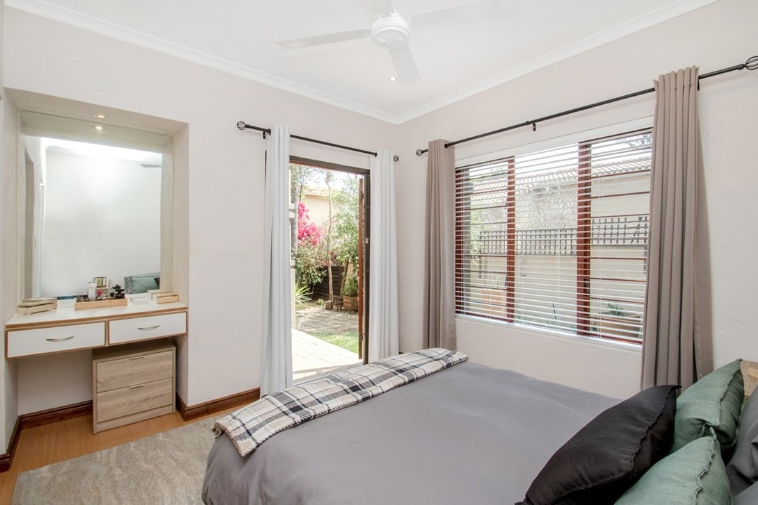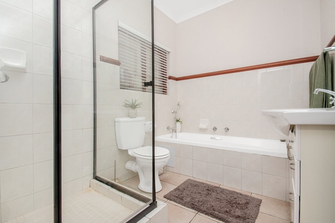 The main bedroom is a generously sized room with lots of built-in cupboards and a full en suite bathroom with shower and tub. It leads out to the patio and garden.