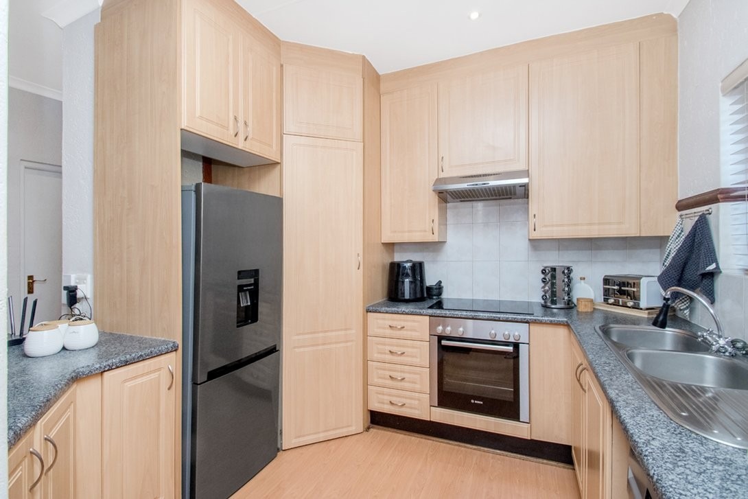 The bright, well-fitted kitchen has a pantry cupboard, double sink, space for microwave oven and 2 appliances plus single door fridge. The granite-look worktops extend into a breakfast bar/server.
