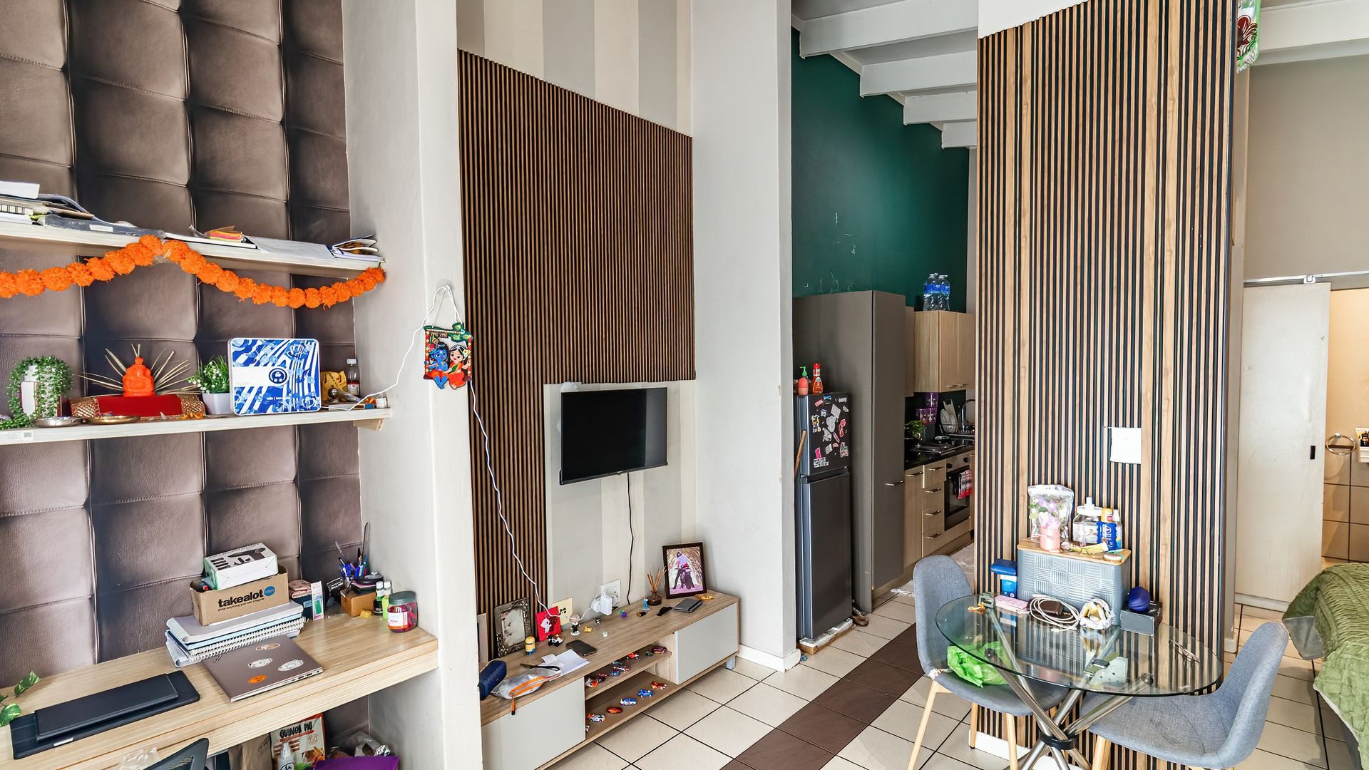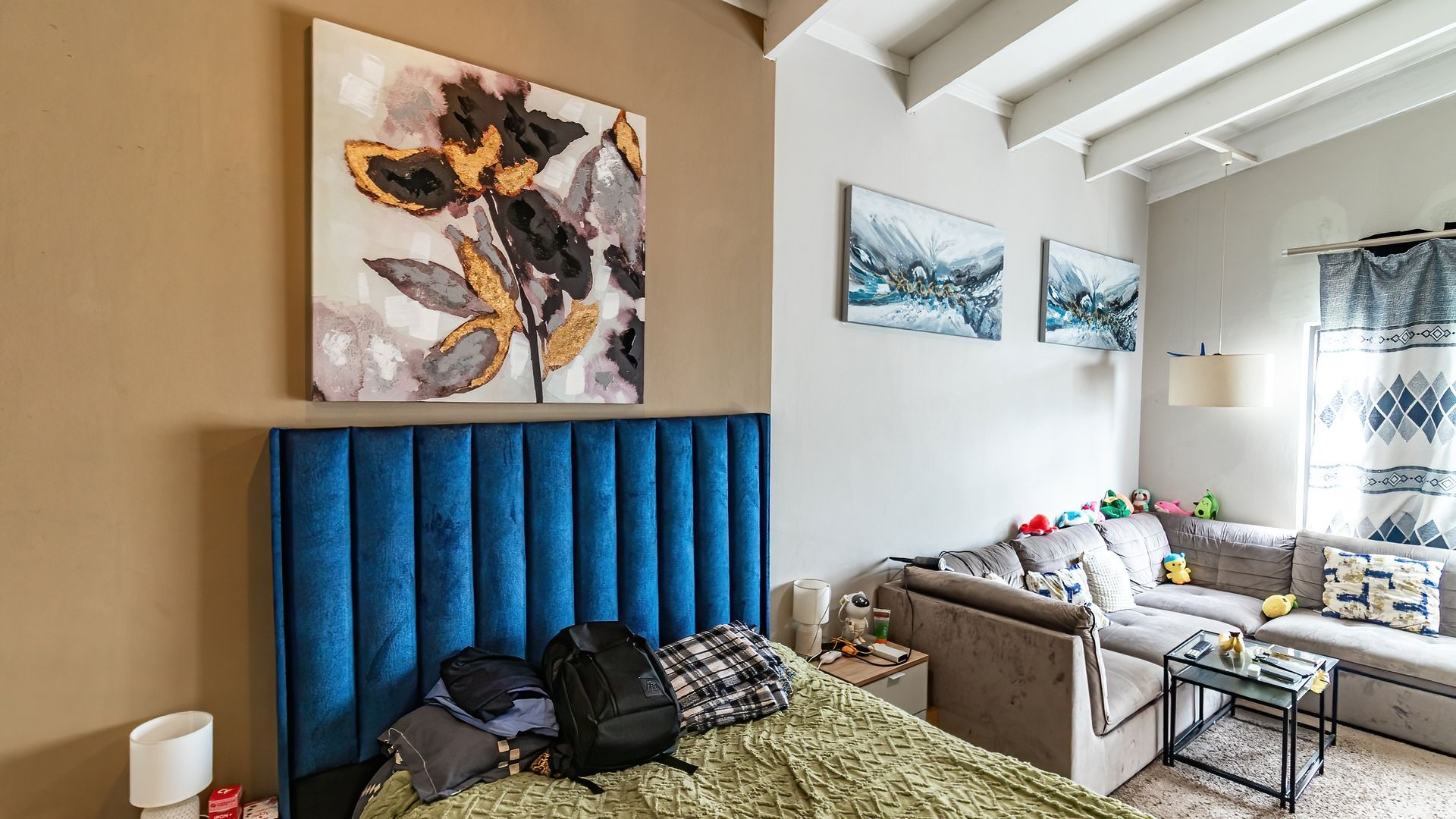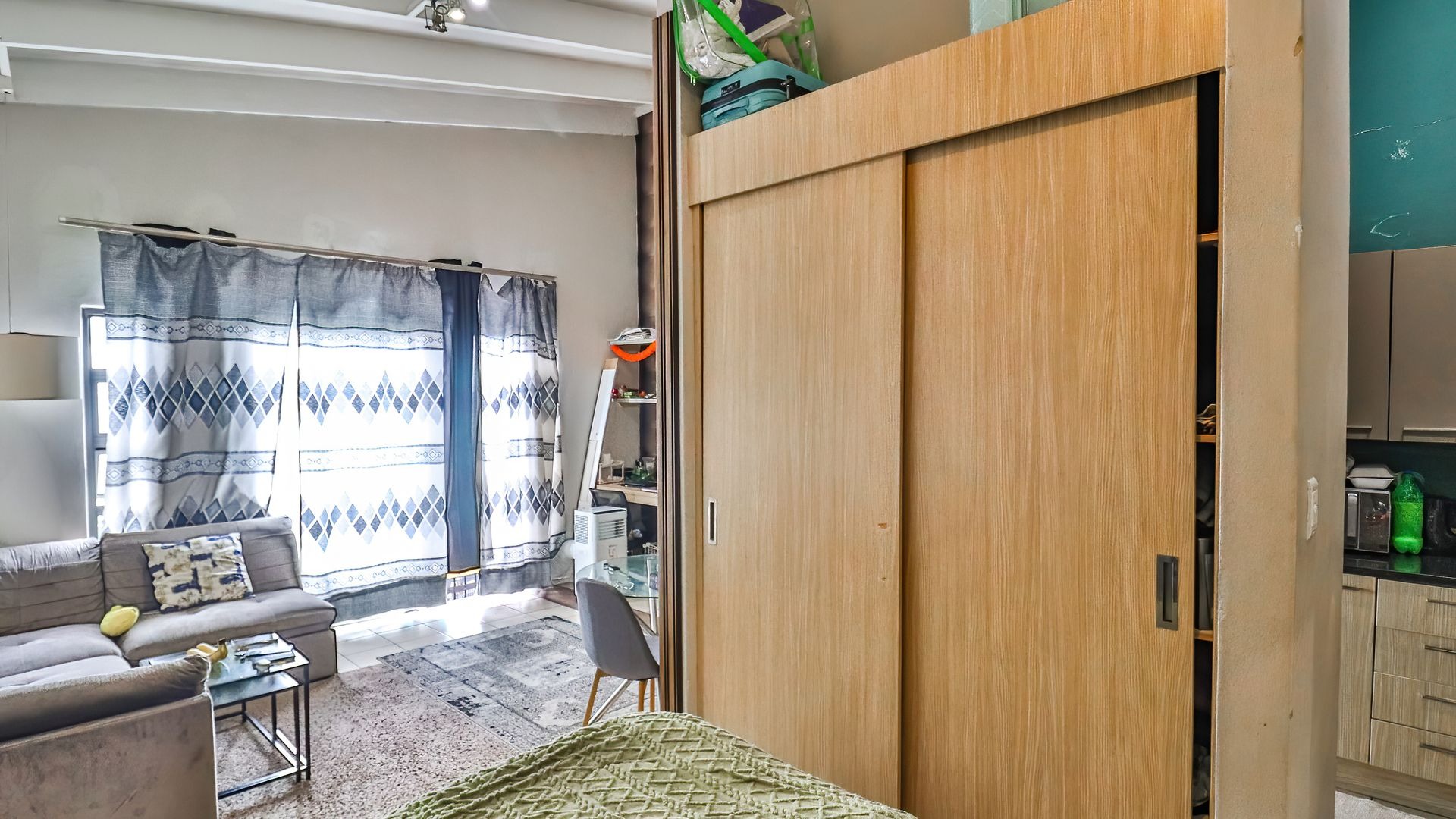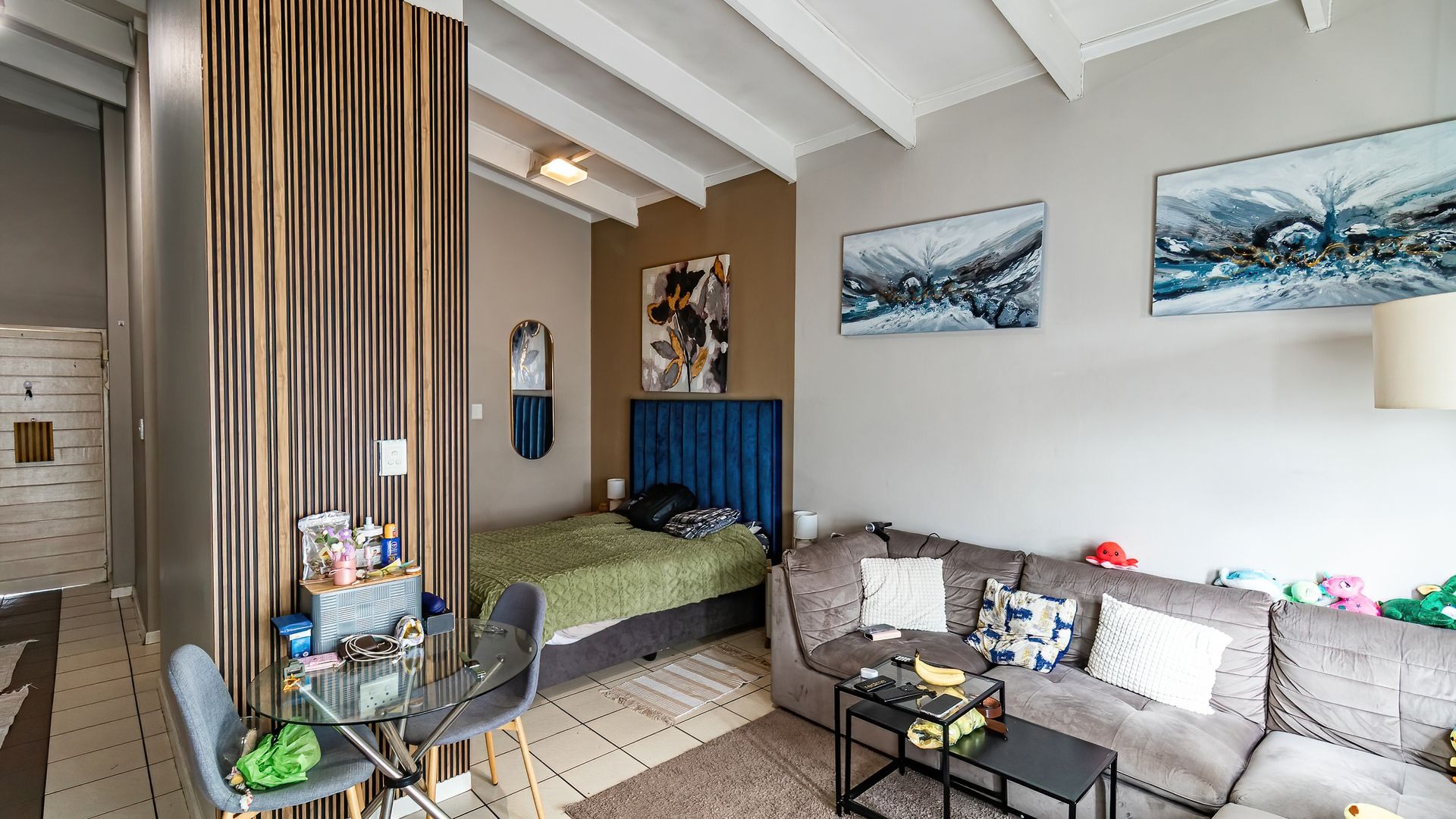 - Open-plan studio layout combining bedroom and living space