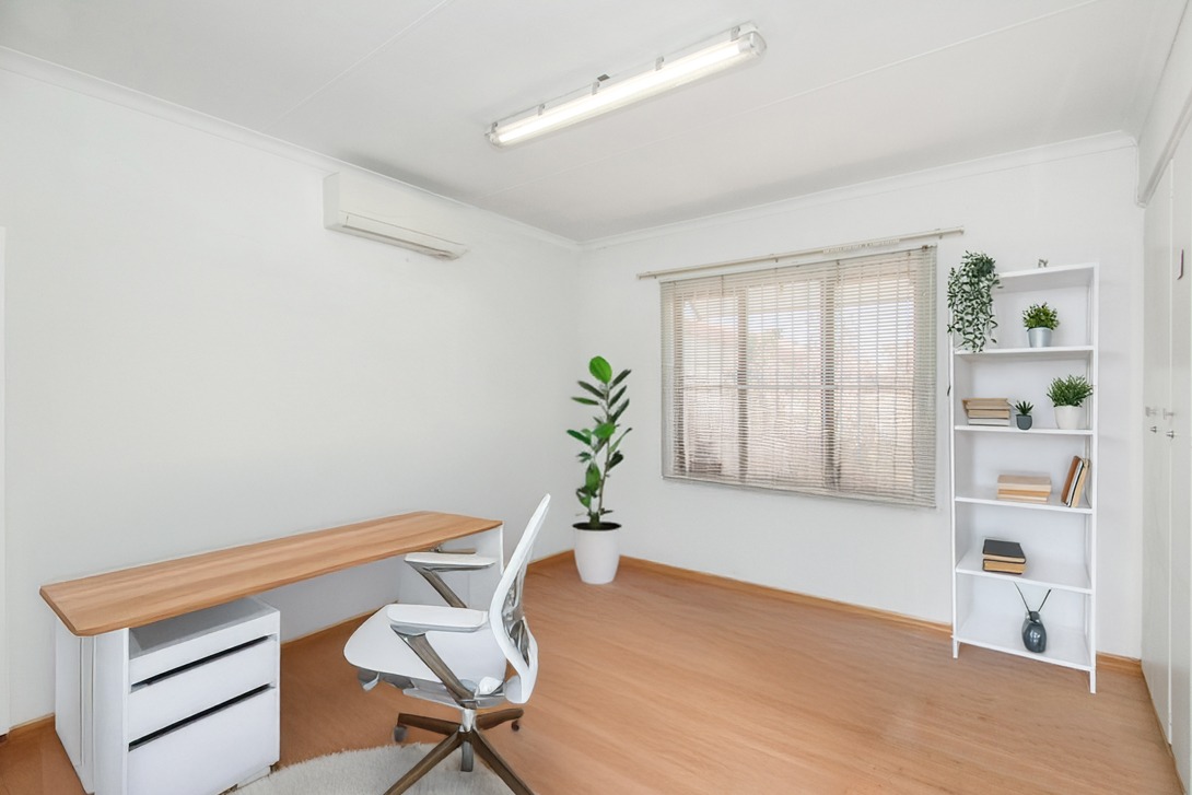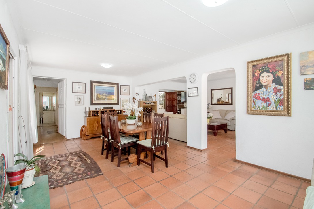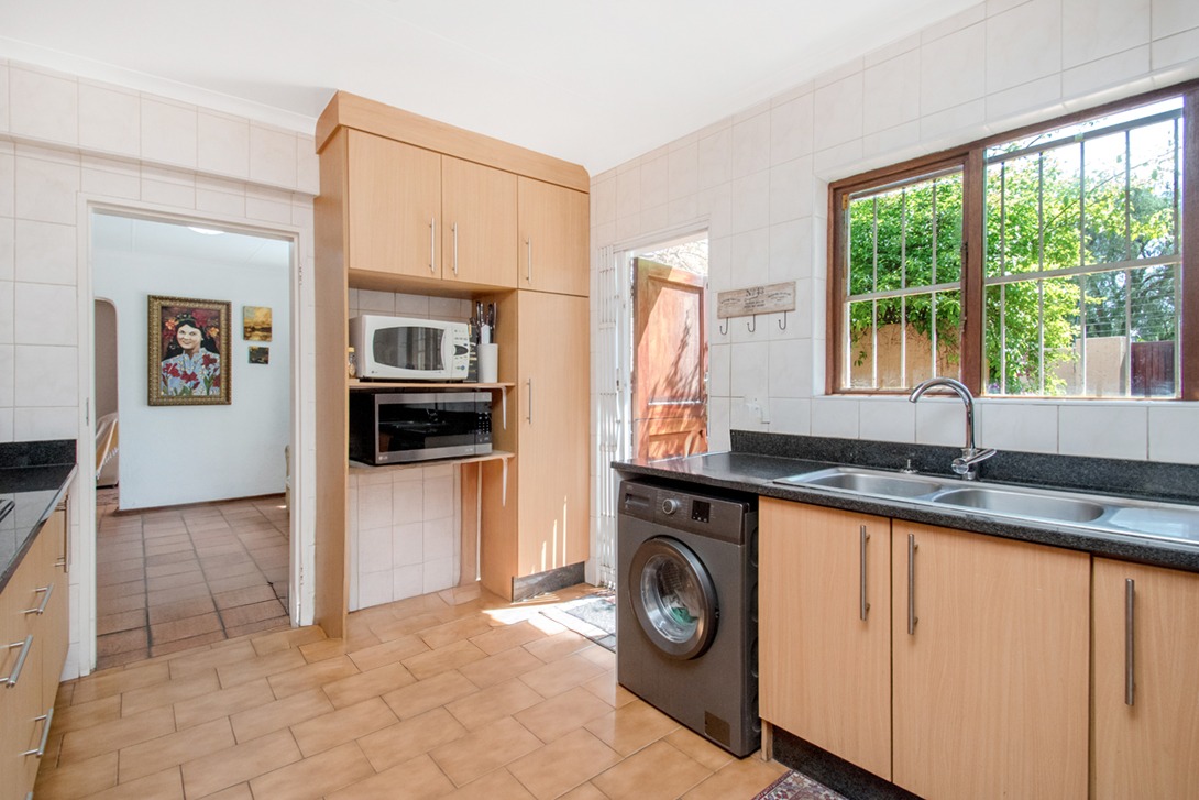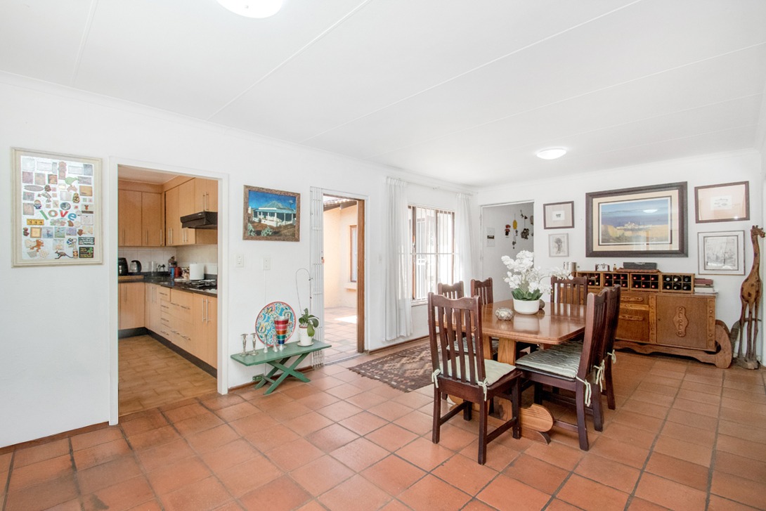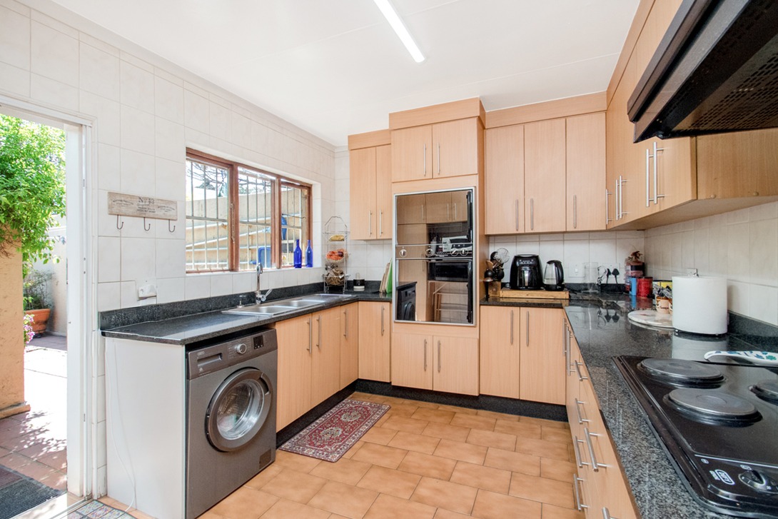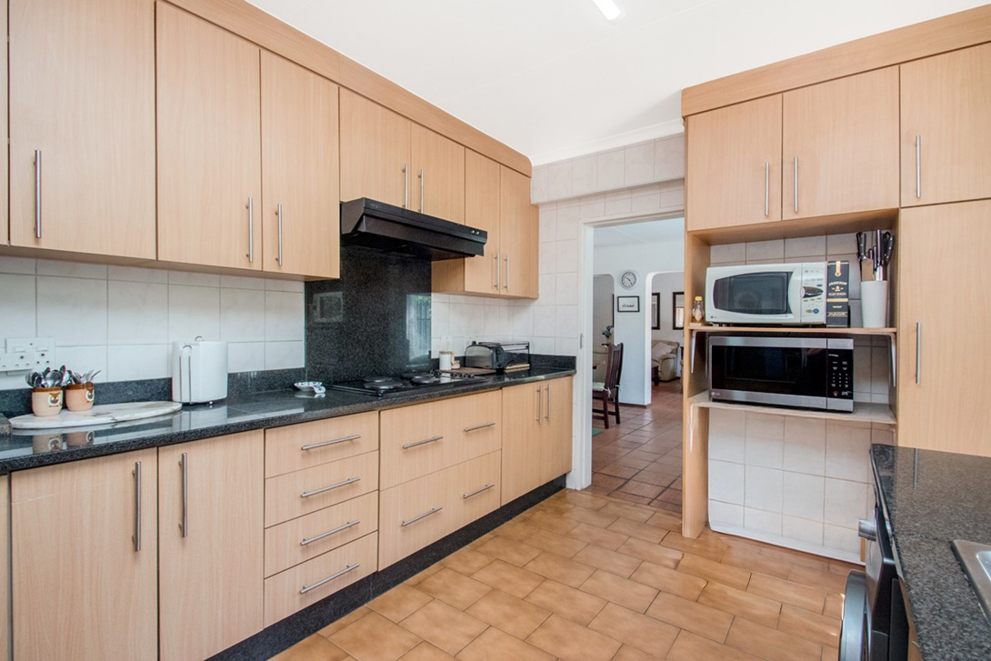 Sunny and bright, the kitchen is fitted with granite counter tops and many cupboards, has space for a double door fridge and leads out to a courtyard and the garden.