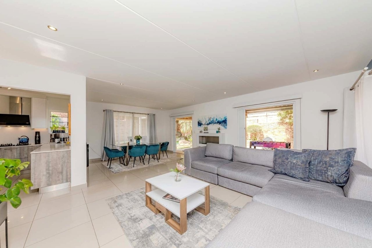 Come home to perfection in this three bedroom, three bathroom house with an ultra modern kitchen, large living spaces and bright rooms, all with high-end finishes, located in a well-managed Sectional Title townhouse complex in Fourways. It is 215 sqm under roof, in a low-maintenance facebrick, double storey house with a long, covered patio, set in a wraparound garden with a swimming pool. It has a pristine staff suite, two 1 000-litre water tanks on a filtration system, a rented GoSolar system with eight panels and a 5kVA inverter, a double garage with automated doors, and three airconditioners.