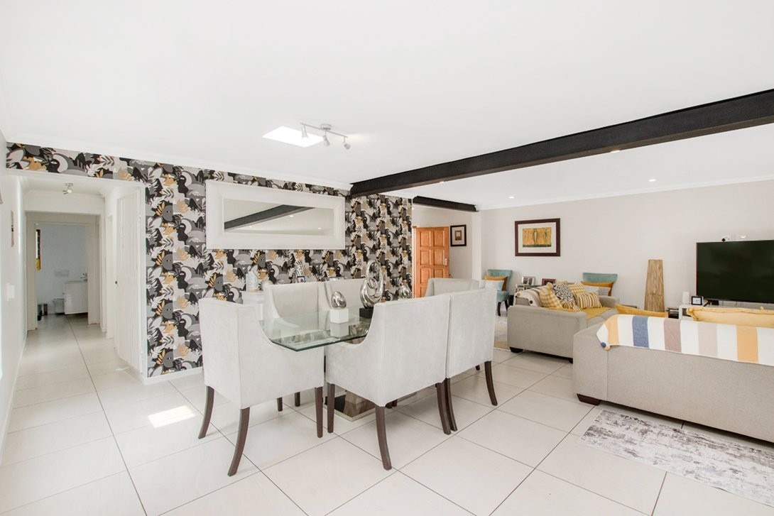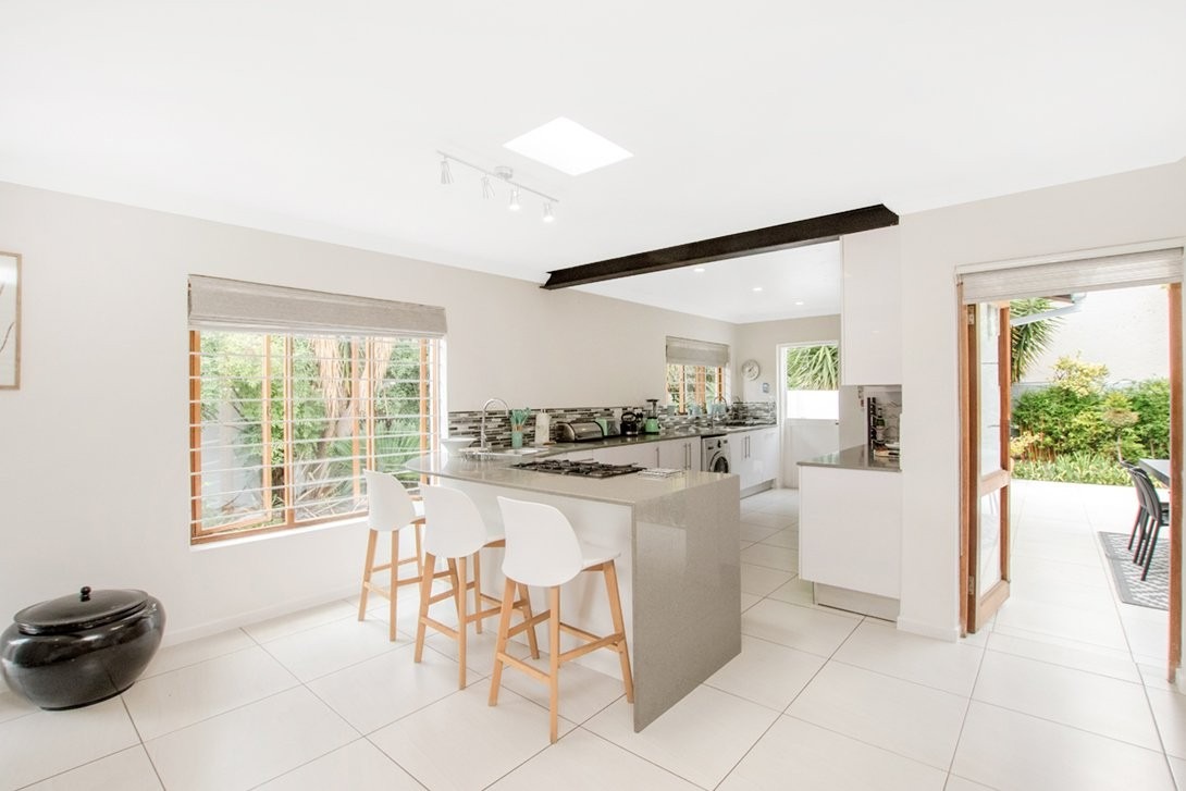 A very private space, with high garden walls and a pretty garden, the home has a lovely lead-in to its entrance, opening to the white and pale grey space of the combined lounge and dining room, with exit doors to the garden on three sides.