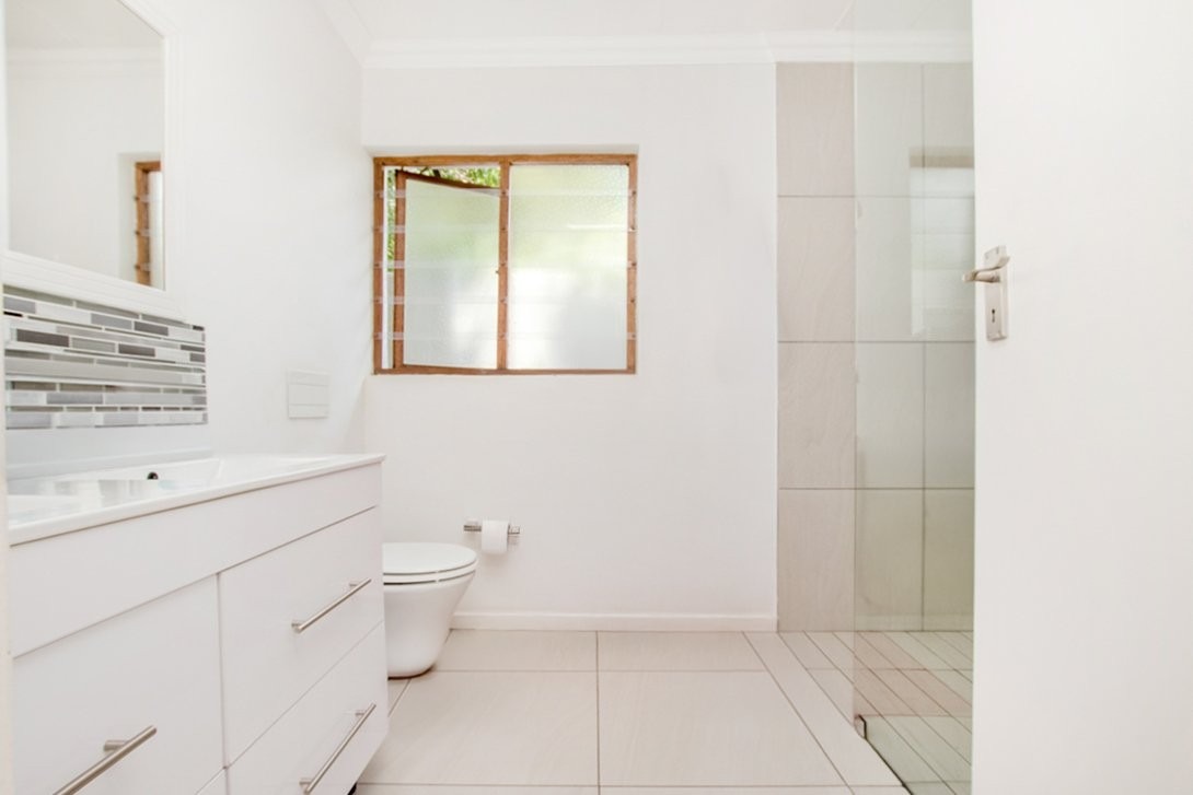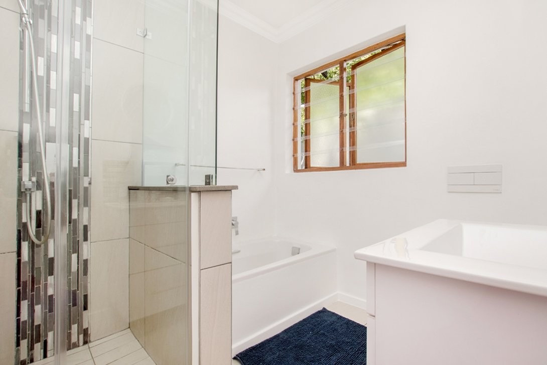 The main bedroom is generous in size, has a bank of cupboards and an en-suite, modern and stylish bathroom with a tub and a walk-in shower. It opens to the patio and garden. The second bathroom also has a shower and a tub, serving the other, good-sized bedrooms.
