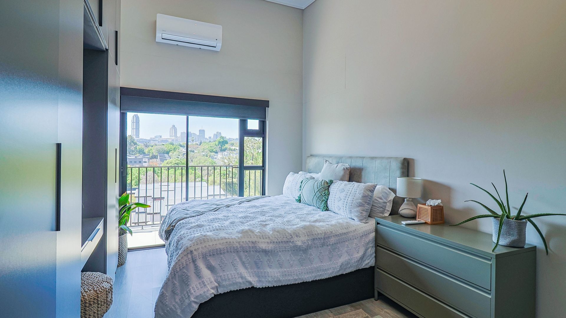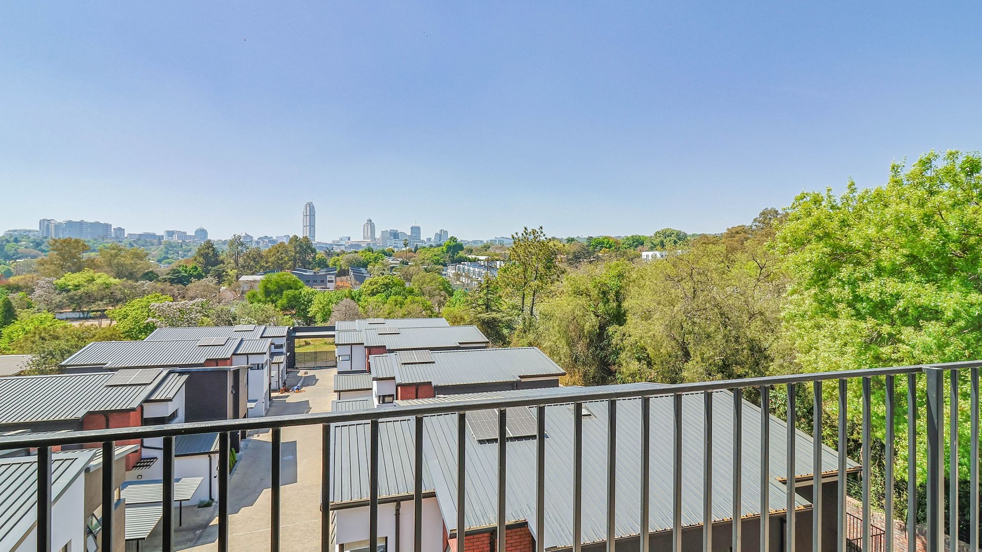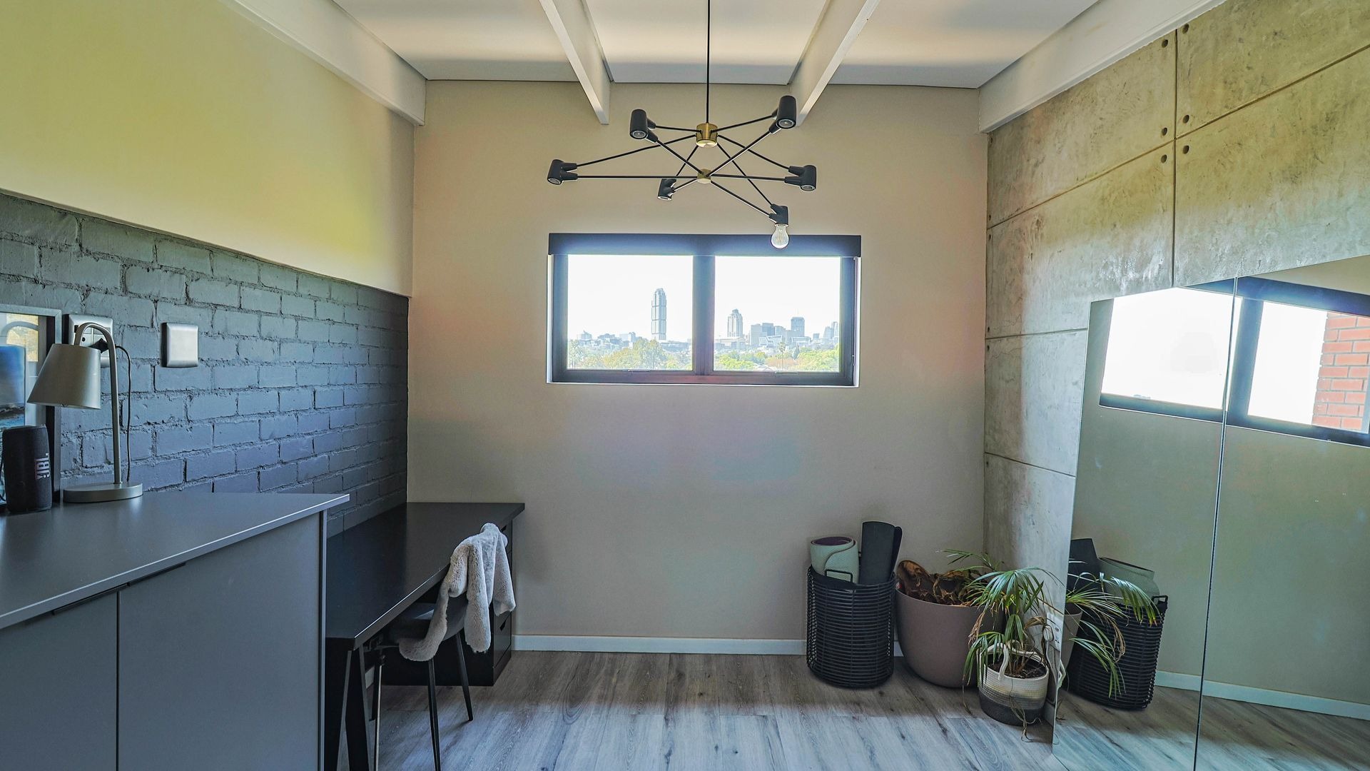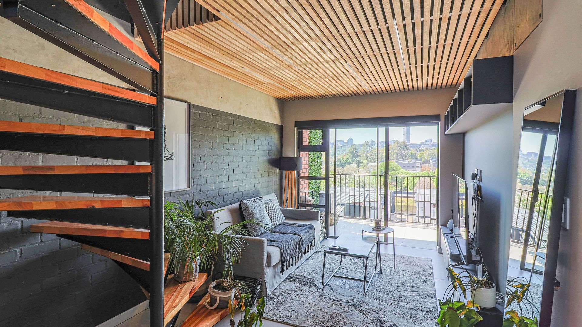 Open plan lounge elegantly decorated with built in Tv stand and shelving. Wooden roof for added beauty and design. Leads out onto a breath taking large balcony with views of Sandton's skyline. Built in loft makes this one bed so spacious.