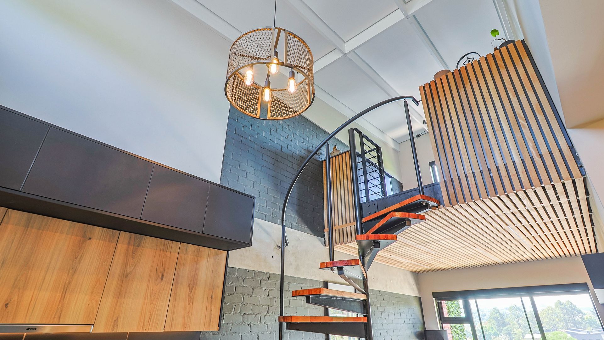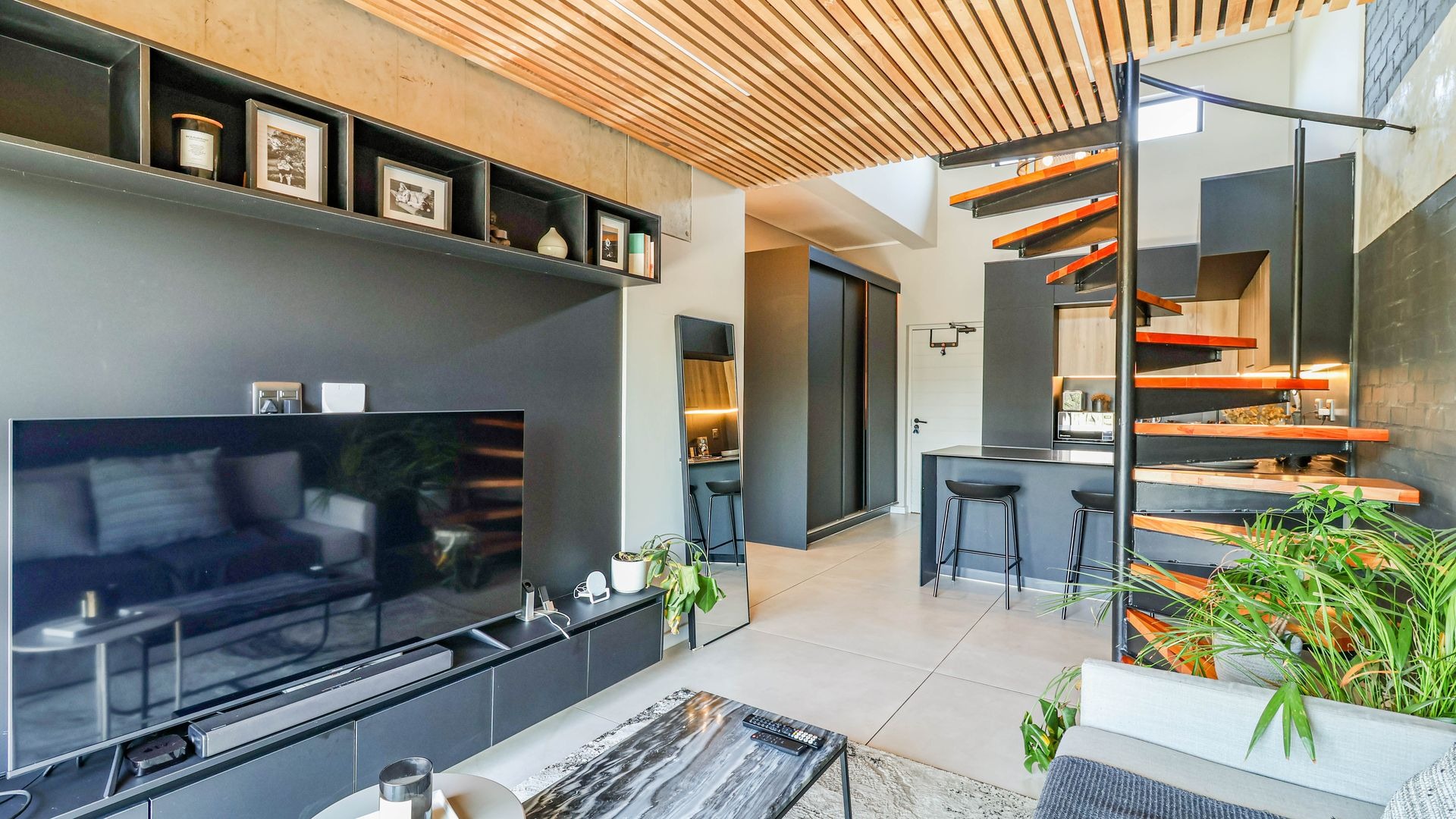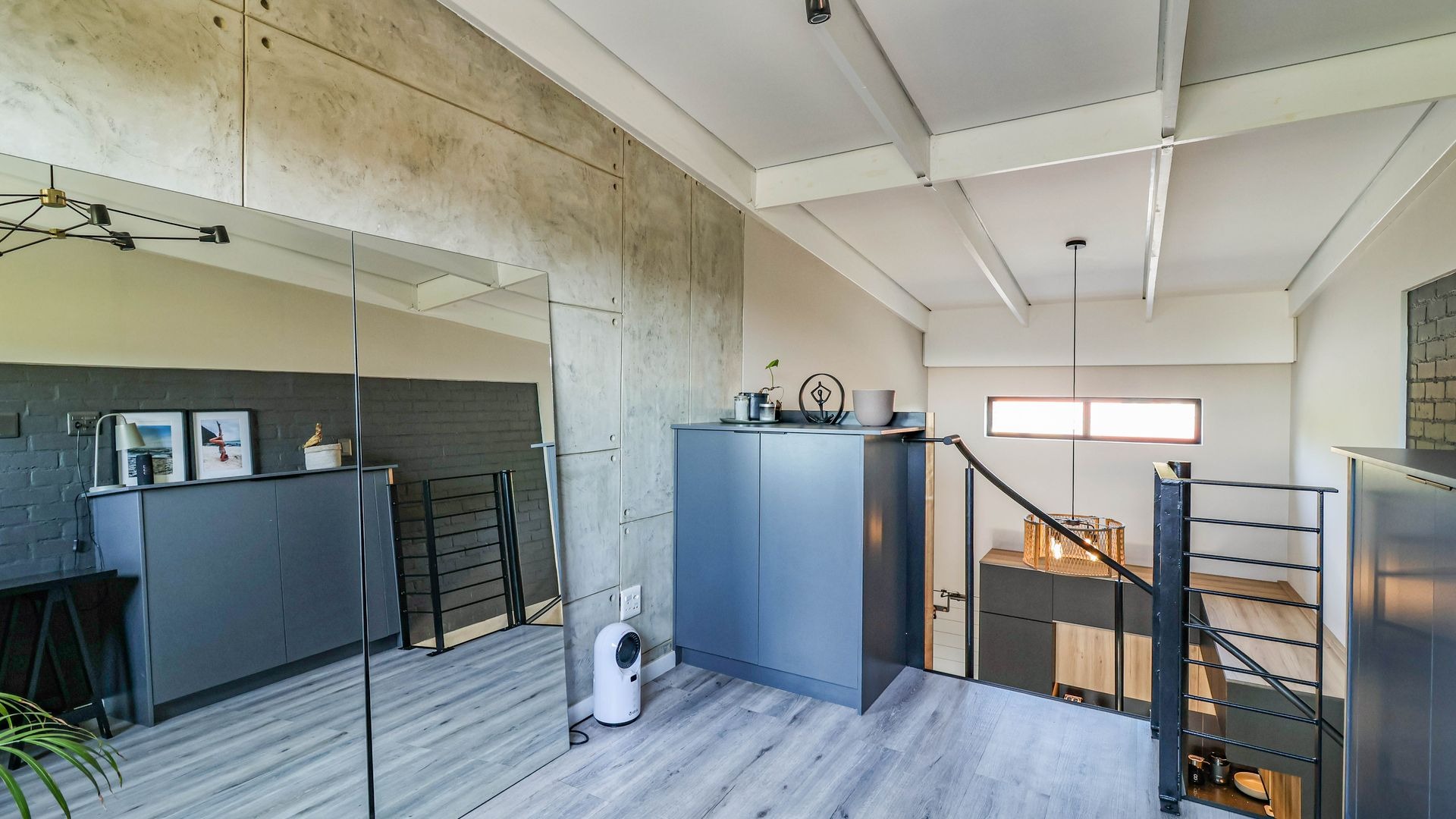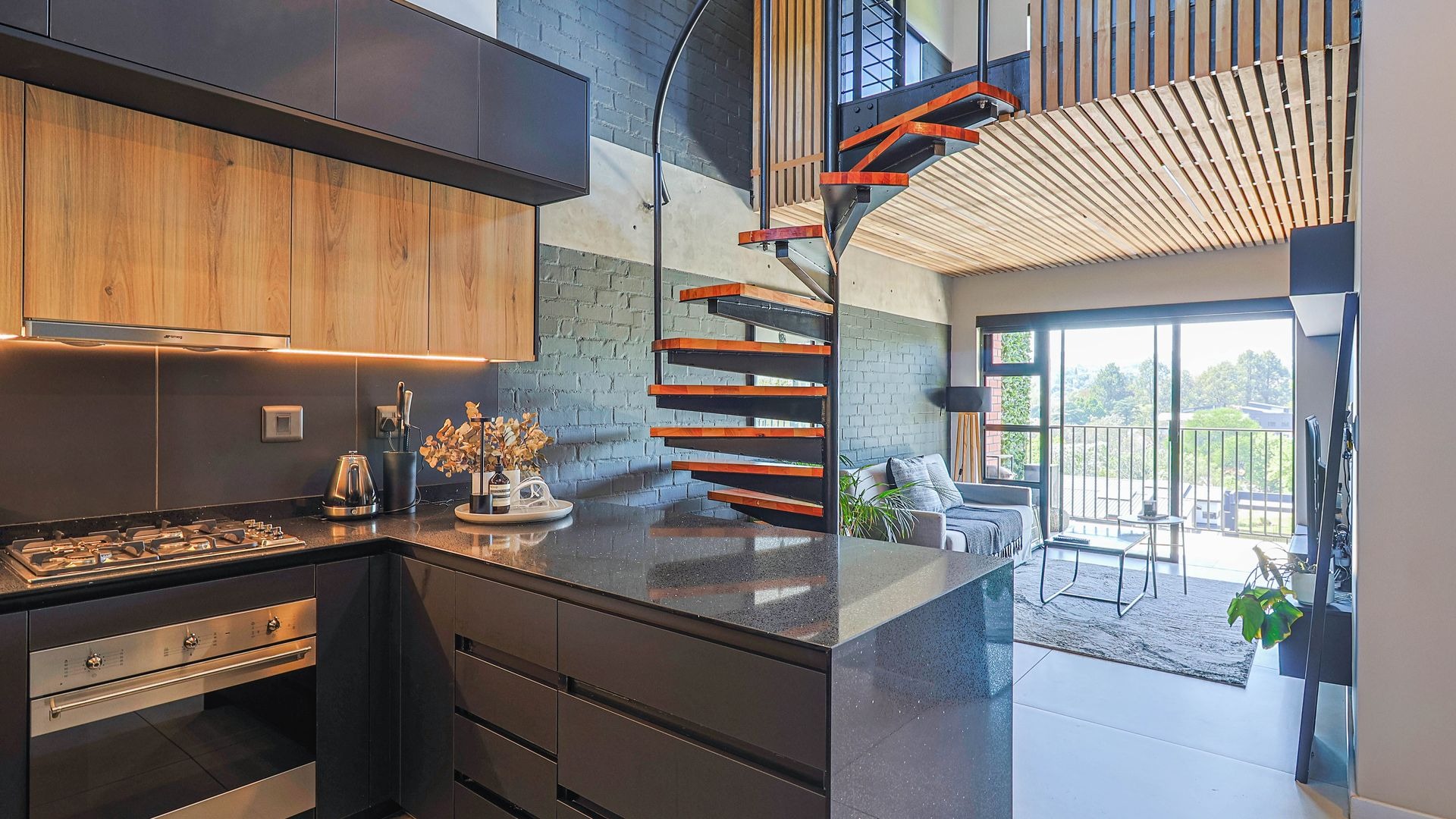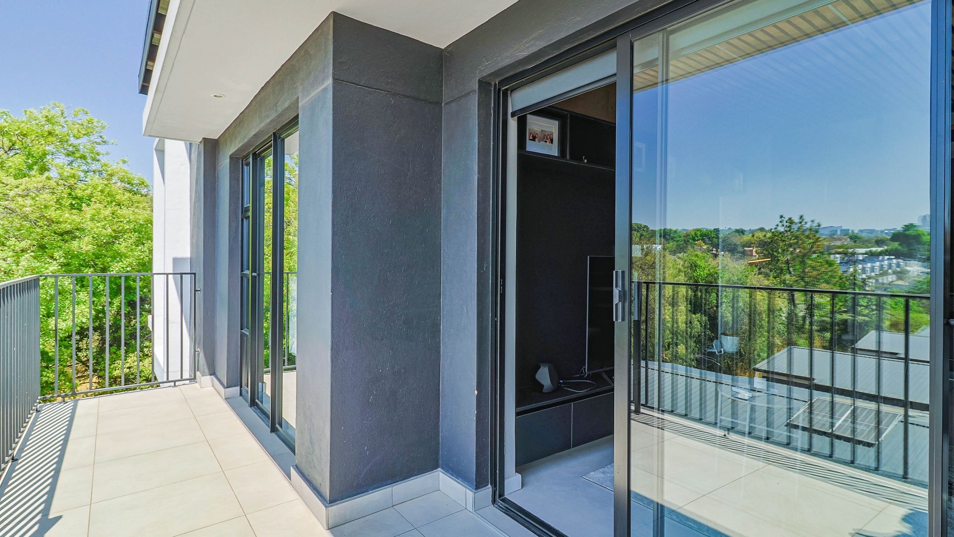 Open plan lounge elegantly decorated with built in Tv stand and shelving. Wooden roof for added beauty and design. Leads out onto a breath taking large balcony with views of Sandton's skyline. Built in loft makes this one bed so spacious.