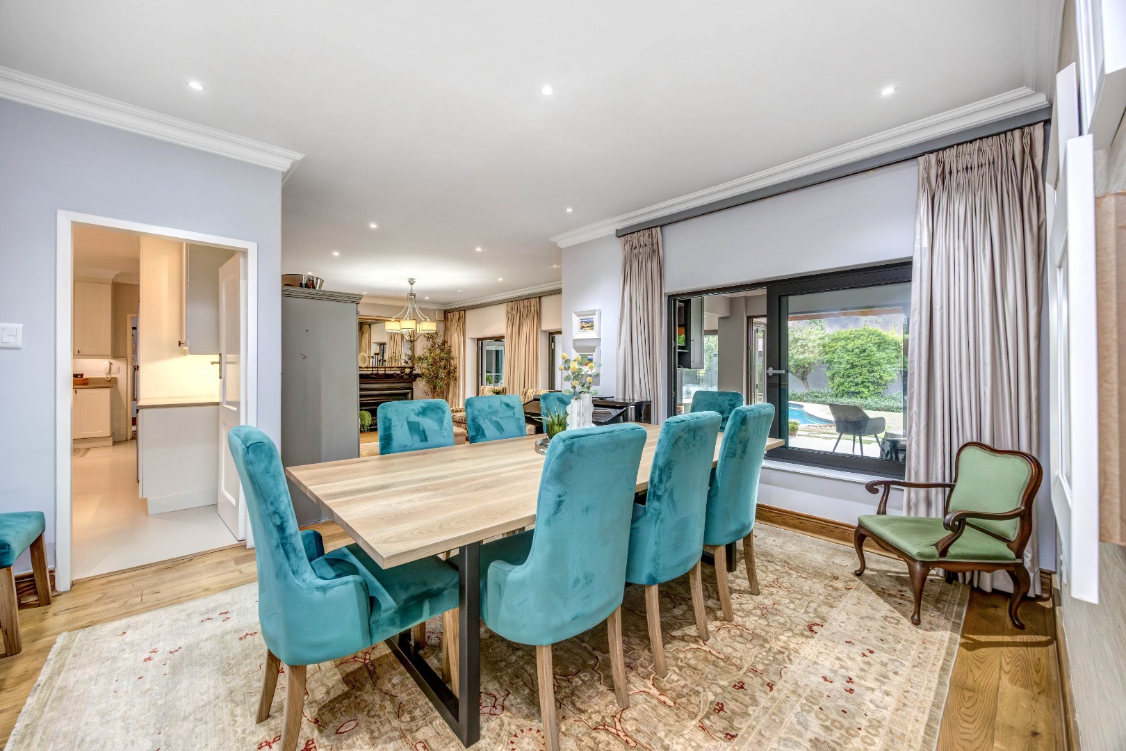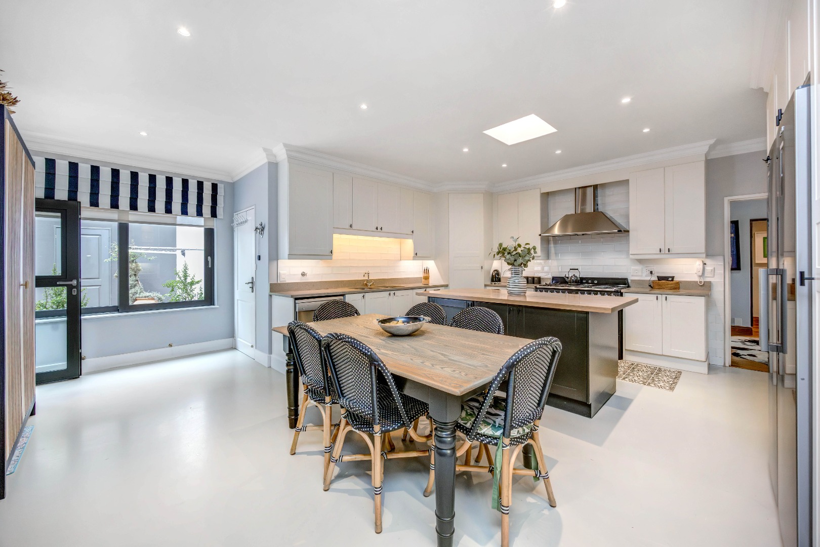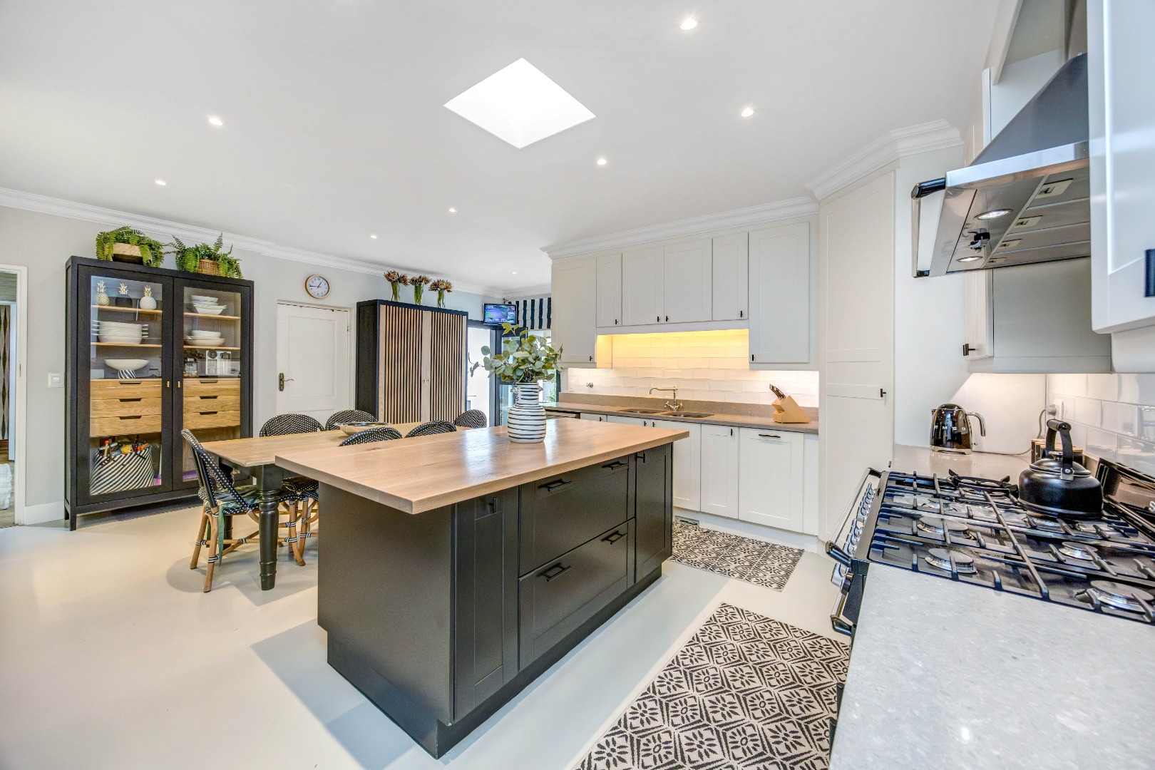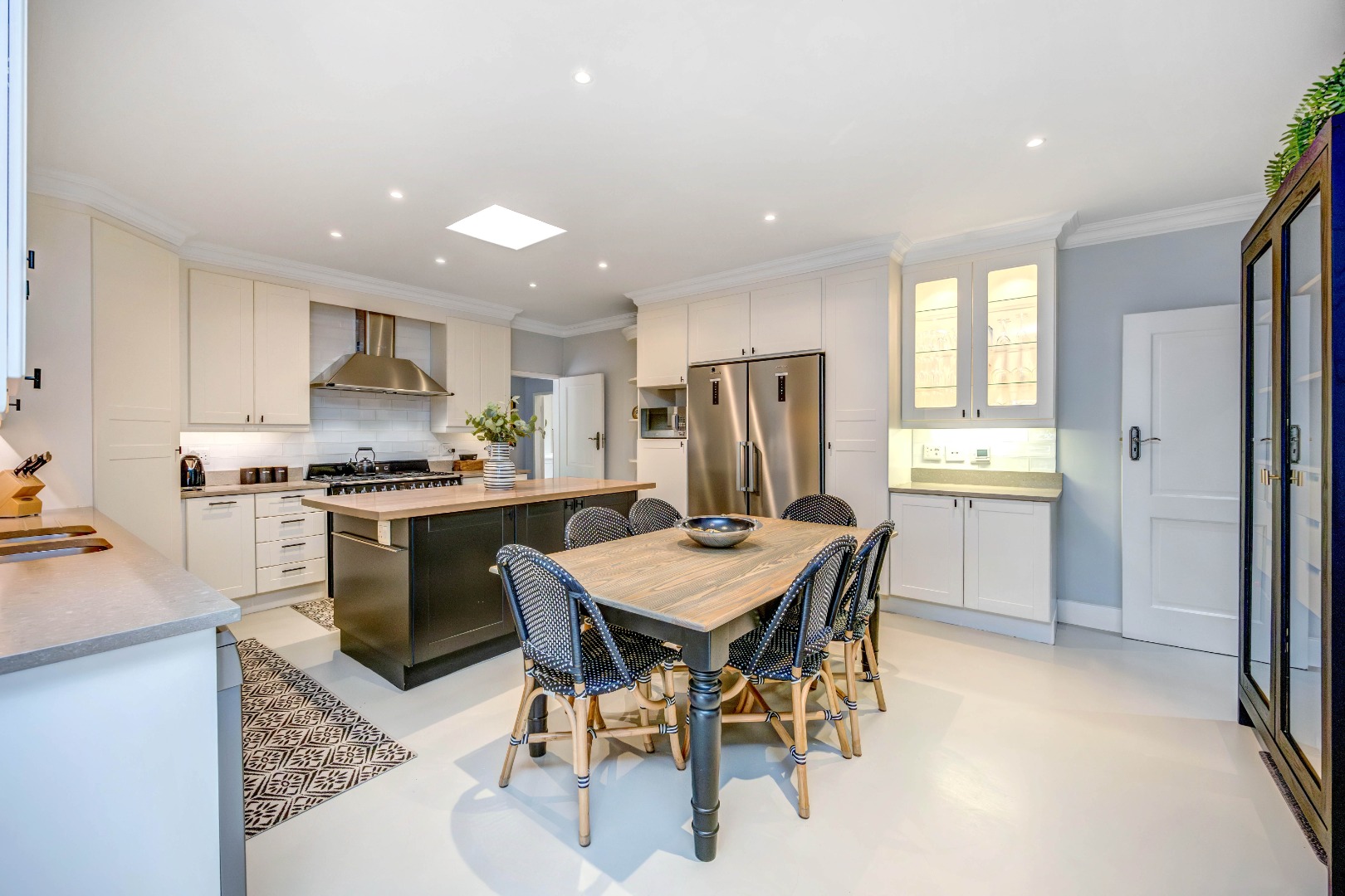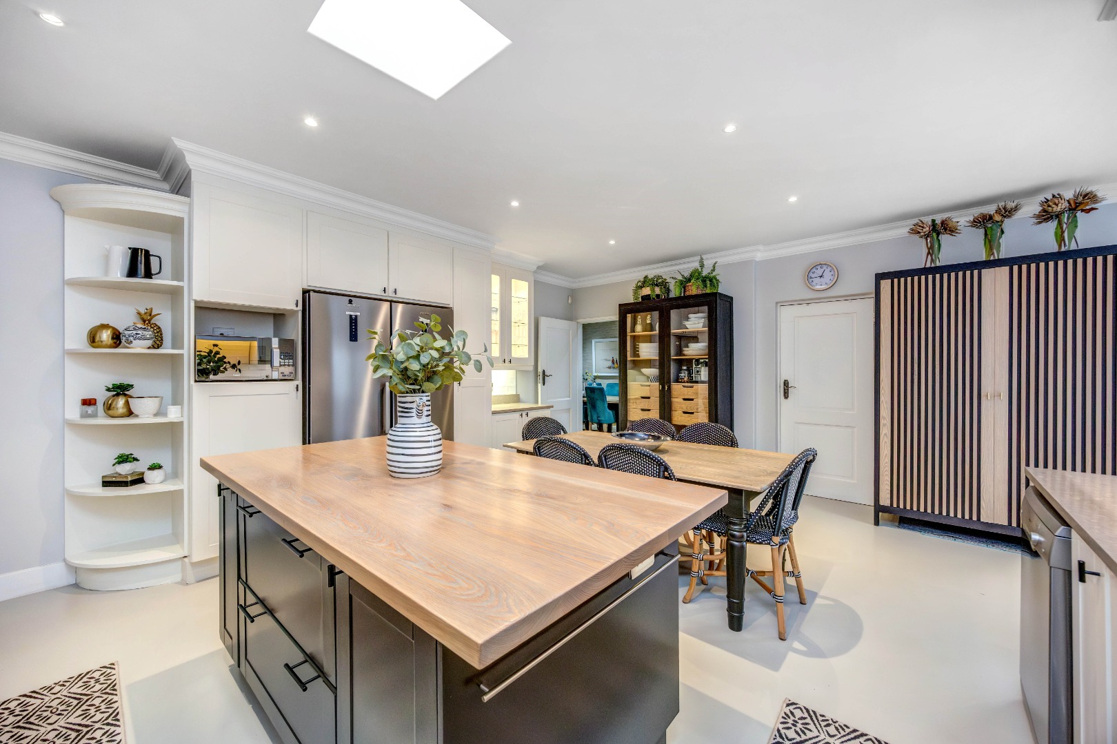 At the heart of the residence lies a generously proportioned kitchen with abundant cabinetry and easy access to the entertainment areas, thoughtfully designed for practical everyday living. It features screed floors, classic subway tiles, and a substantial SMEG hob with a seven-plate gas top, two ovens and a grill. A wood-topped centre island anchors the space, complemented by a separate pantry, a modern Apell double sink, and space for a dishwasher and large fridge.