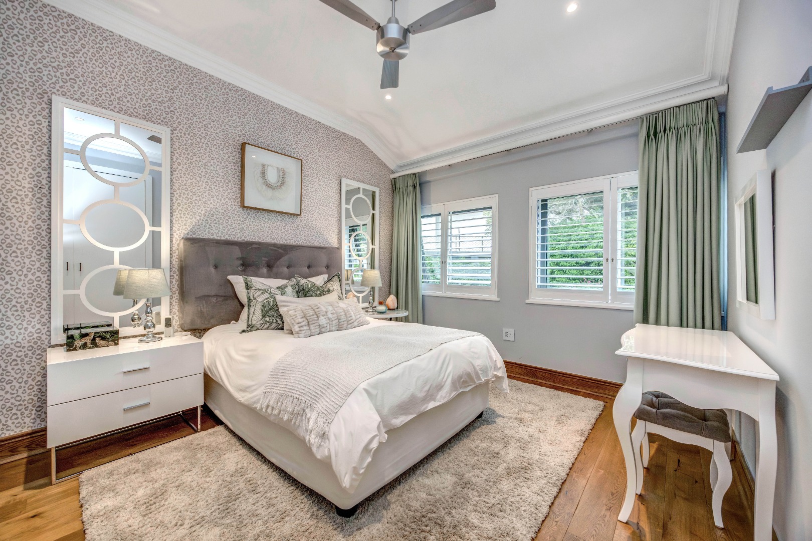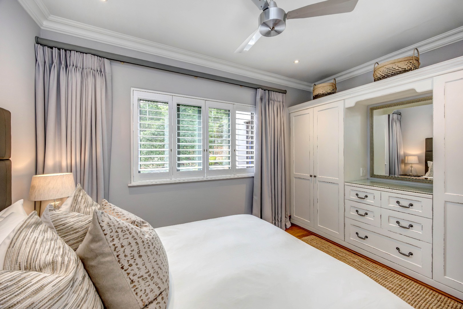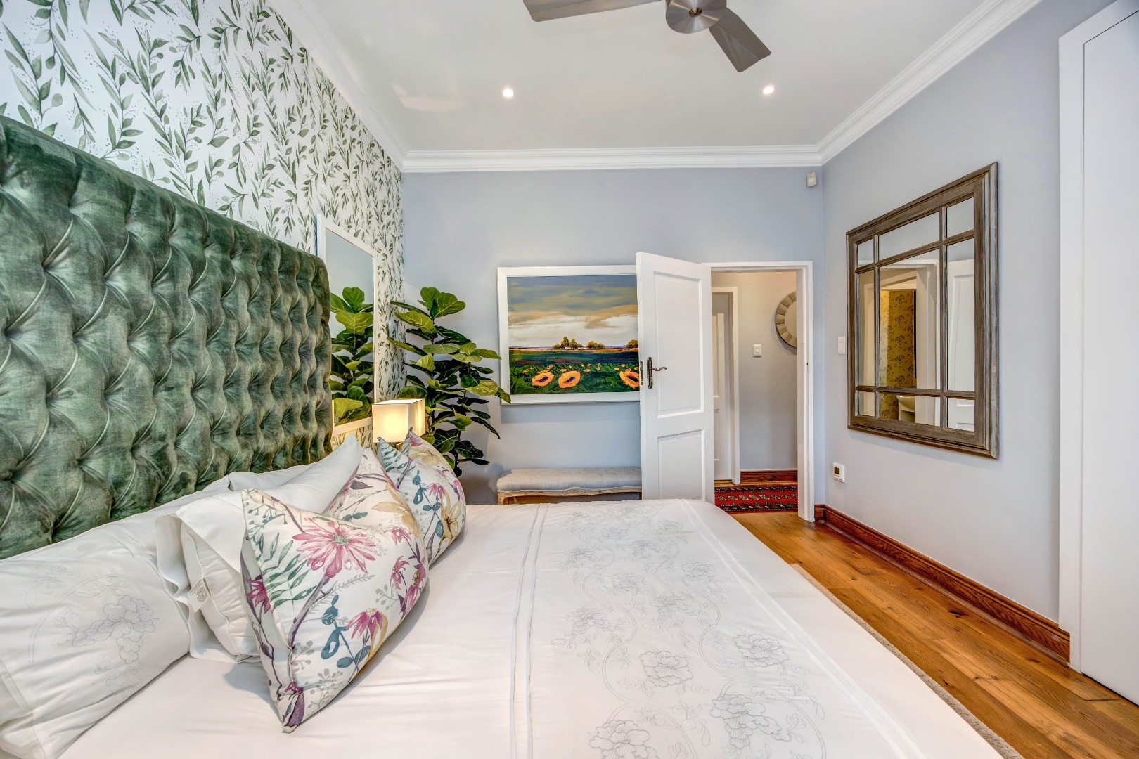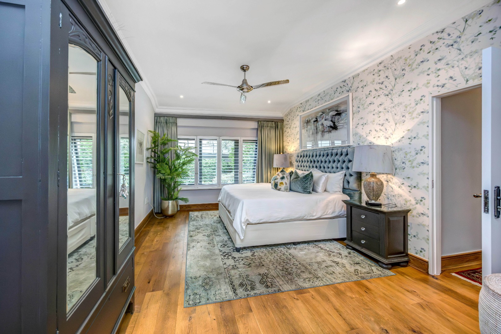 The bedroom accommodation has been carefully planned to ensure both comfort and privacy. The main family wing comprises three spacious bedrooms, two full bathrooms and a guest loo. Positioned on the opposite side of the home, a private guest suite with its own full bathroom offers ideal accommodation for visitors or extended family members. The master bedroom enjoys a walk-through dressing room leading into a full bathroom with double vanities and an integrated dressing table. All bedrooms overlook the established garden, allowing for tranquil green views throughout.