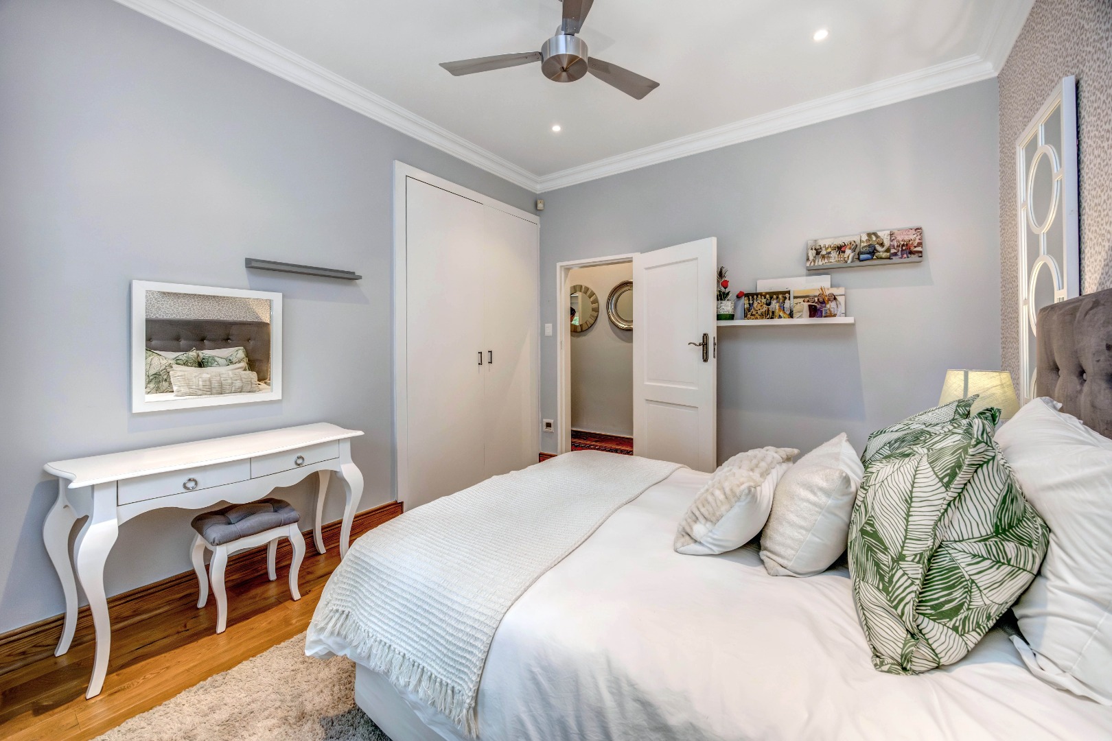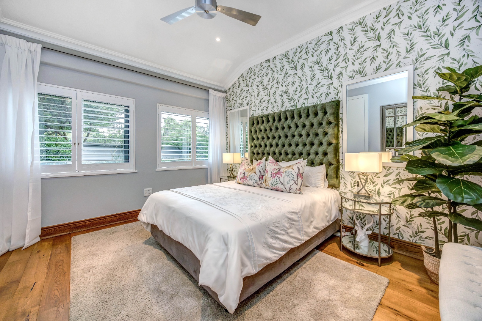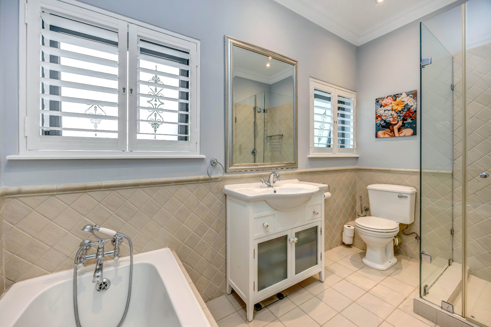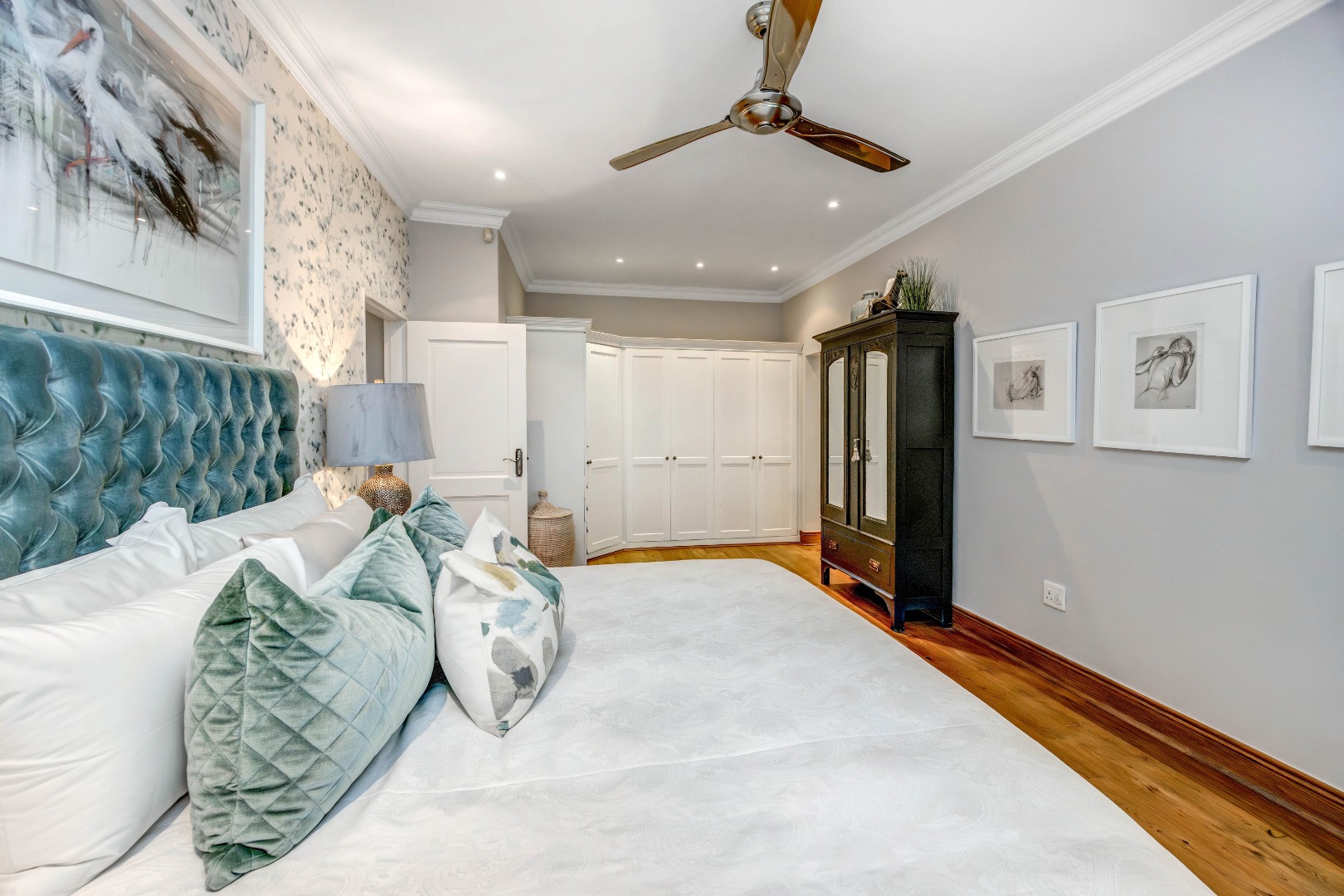 The bedroom accommodation has been carefully planned to ensure both comfort and privacy. The main family wing comprises three spacious bedrooms, two full bathrooms and a guest loo. Positioned on the opposite side of the home, a private guest suite with its own full bathroom offers ideal accommodation for visitors or extended family members. The master bedroom enjoys a walk-through dressing room leading into a full bathroom with double vanities and an integrated dressing table. All bedrooms overlook the established garden, allowing for tranquil green views throughout.