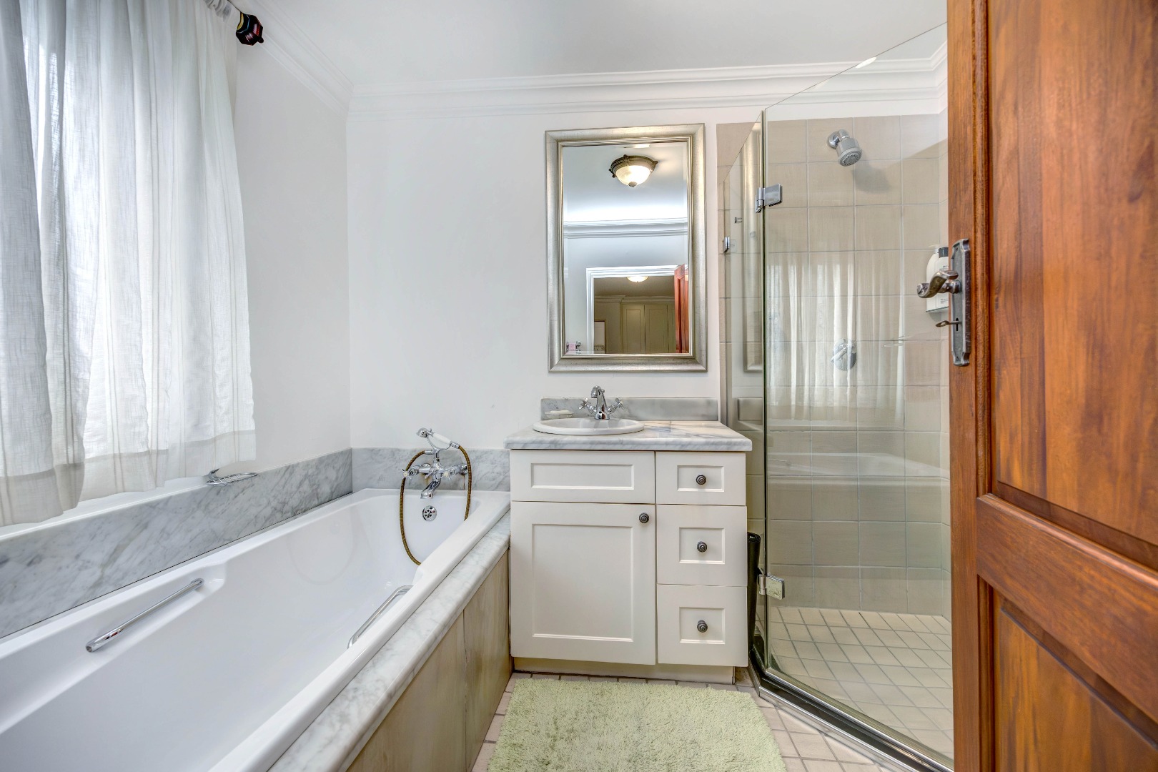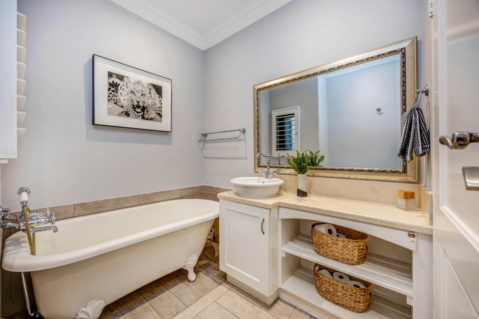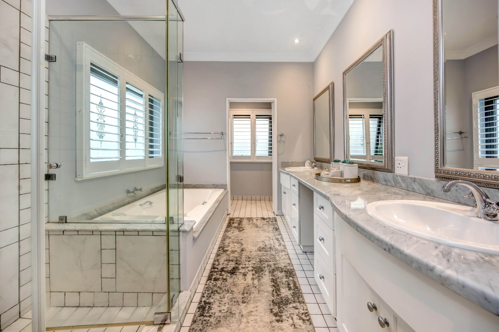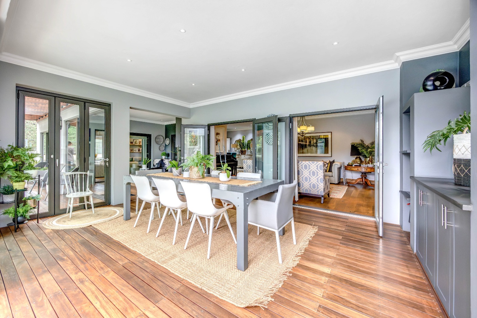The bedroom accommodation has been carefully planned to ensure both comfort and privacy. The main family wing comprises three spacious bedrooms, two full bathrooms and a guest loo. Positioned on the opposite side of the home, a private guest suite with its own full bathroom offers ideal accommodation for visitors or extended family members. The master bedroom enjoys a walk-through dressing room leading into a full bathroom with double vanities and an integrated dressing table. All bedrooms overlook the established garden, allowing for tranquil green views throughout.