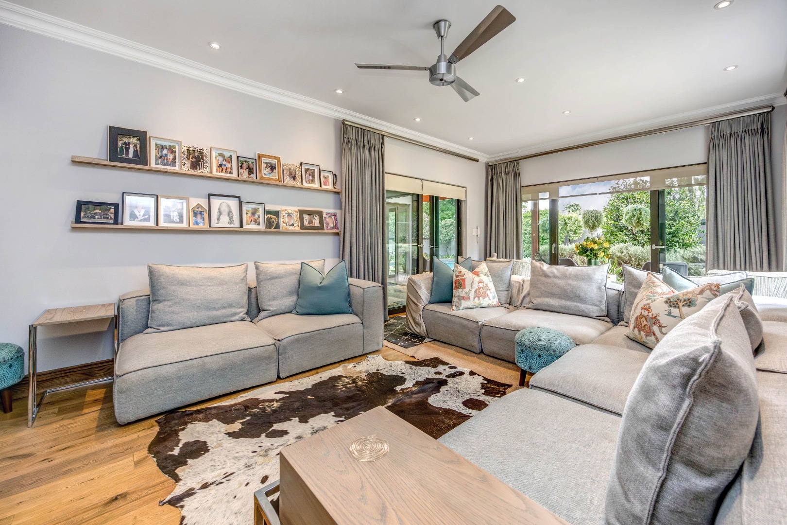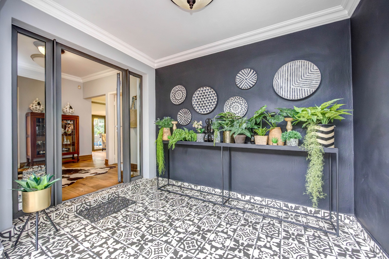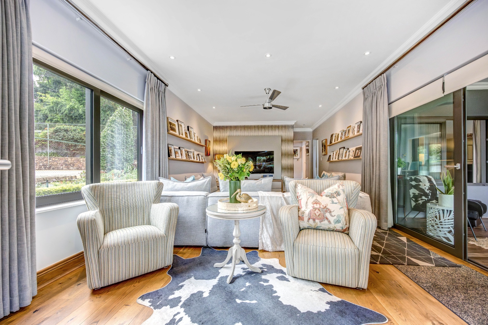 A beautifully tiled porch with feature gates welcomes you into the entrance hall of the main home, setting the tone for the warm and inviting interiors. The living areas flow seamlessly into one another, creating an effortless environment suited to both intimate evenings and larger social gatherings. The formal lounge, complete with a gas fireplace, offers a refined yet comfortable setting, while the separate TV lounge provides a relaxed family retreat. A well-positioned dining room enhances the home’s entertainment appeal, and a separate study offers a quiet workspace for those working from home.