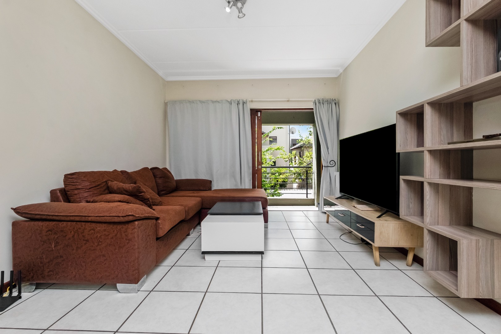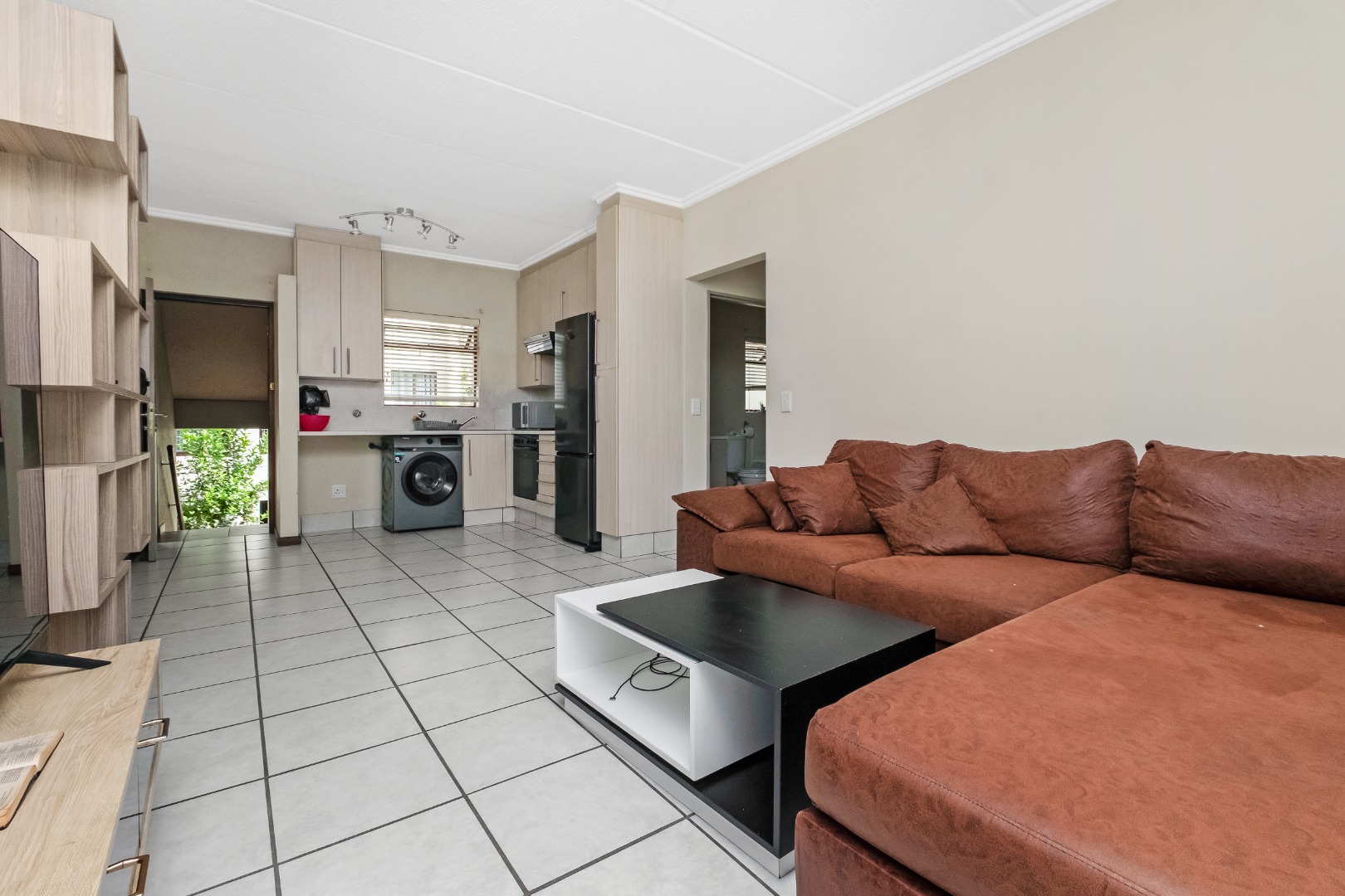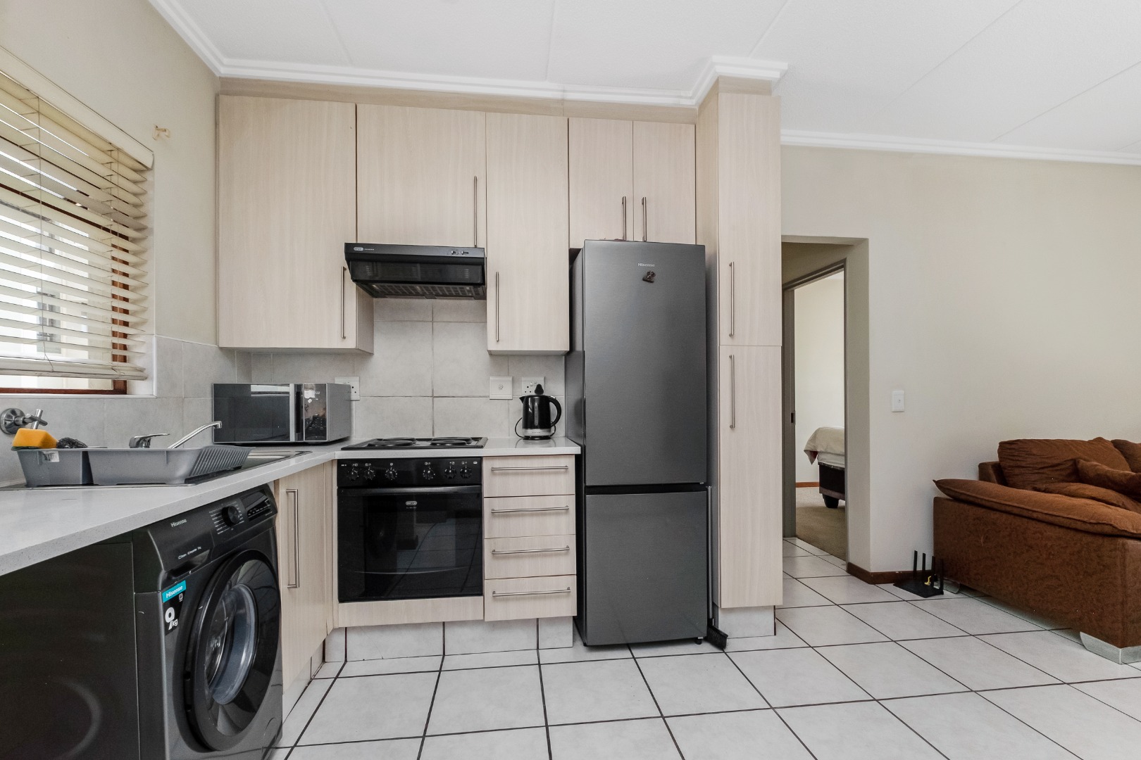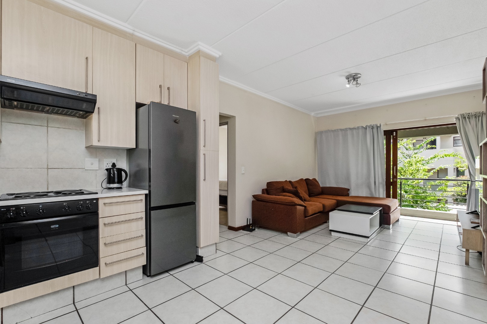 The apartment is bright and spacious with an open-plan design, comprising a well-sized bedroom and a full bathroom. The kitchen is practical and modern, offering ample cupboard space, generous countertops, and room for two undercounter appliances, electric stove and oven and space for single door fridge. The tiled living area opens onto a private balcony, enhancing the overall living experience and adding to its rental desirability.