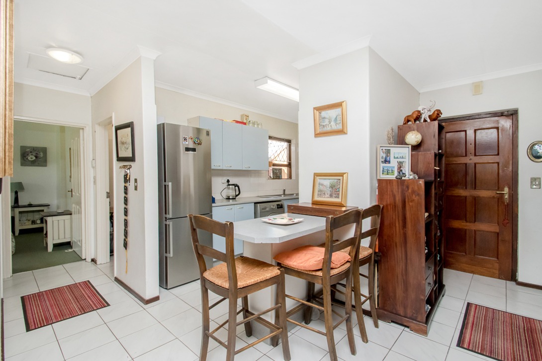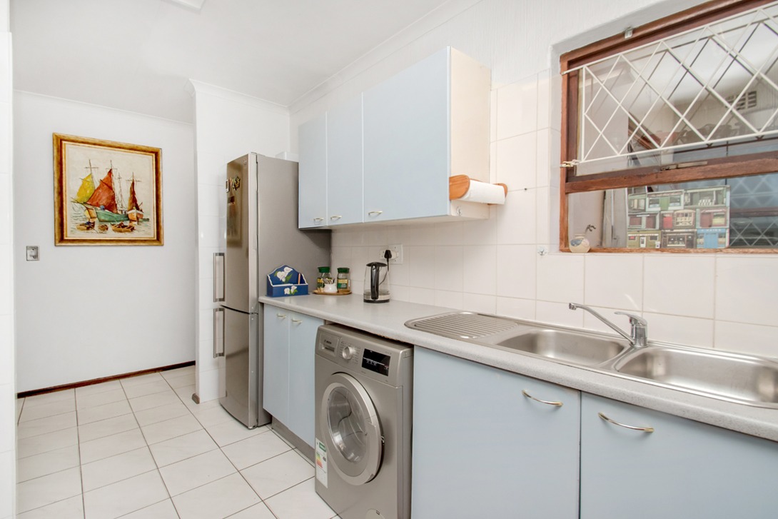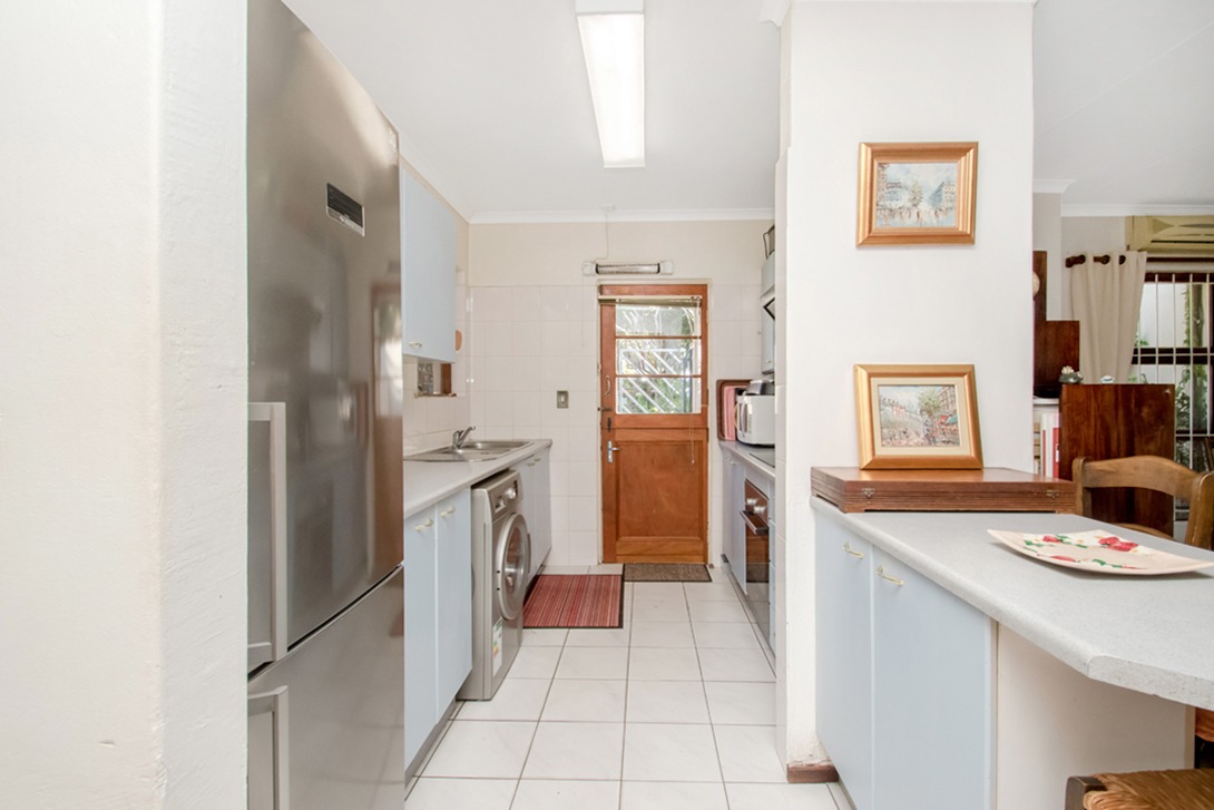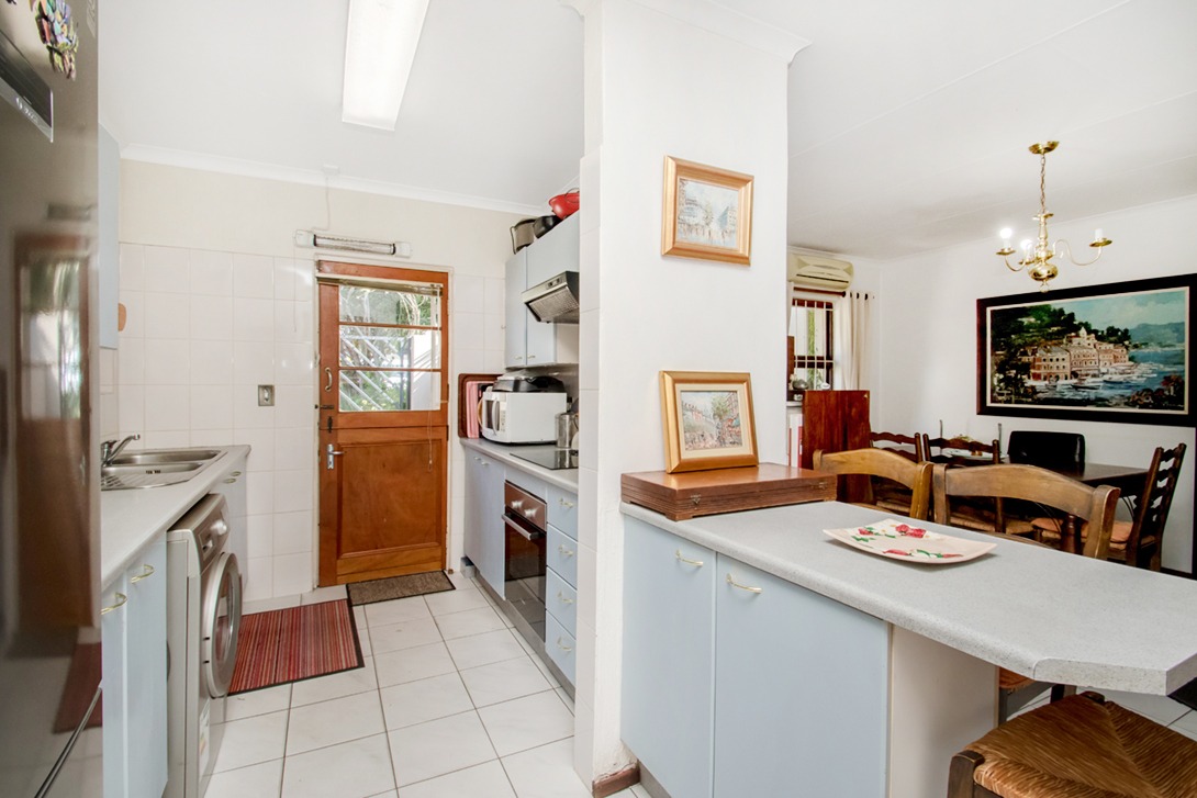 - Kitchen with breakfast nook, ample cupboard space, provision for one undercounter appliance (with potential to install a second), single-door fridge, electric stove, and oven. Kitchen opens onto a neat courtyard with a wendy house for extra storage.