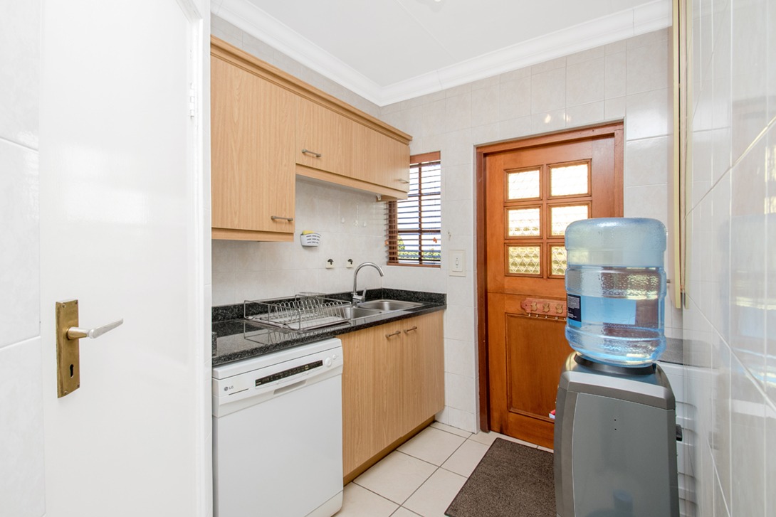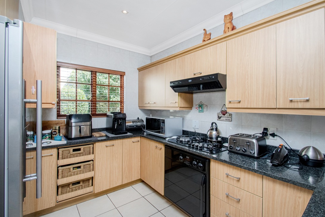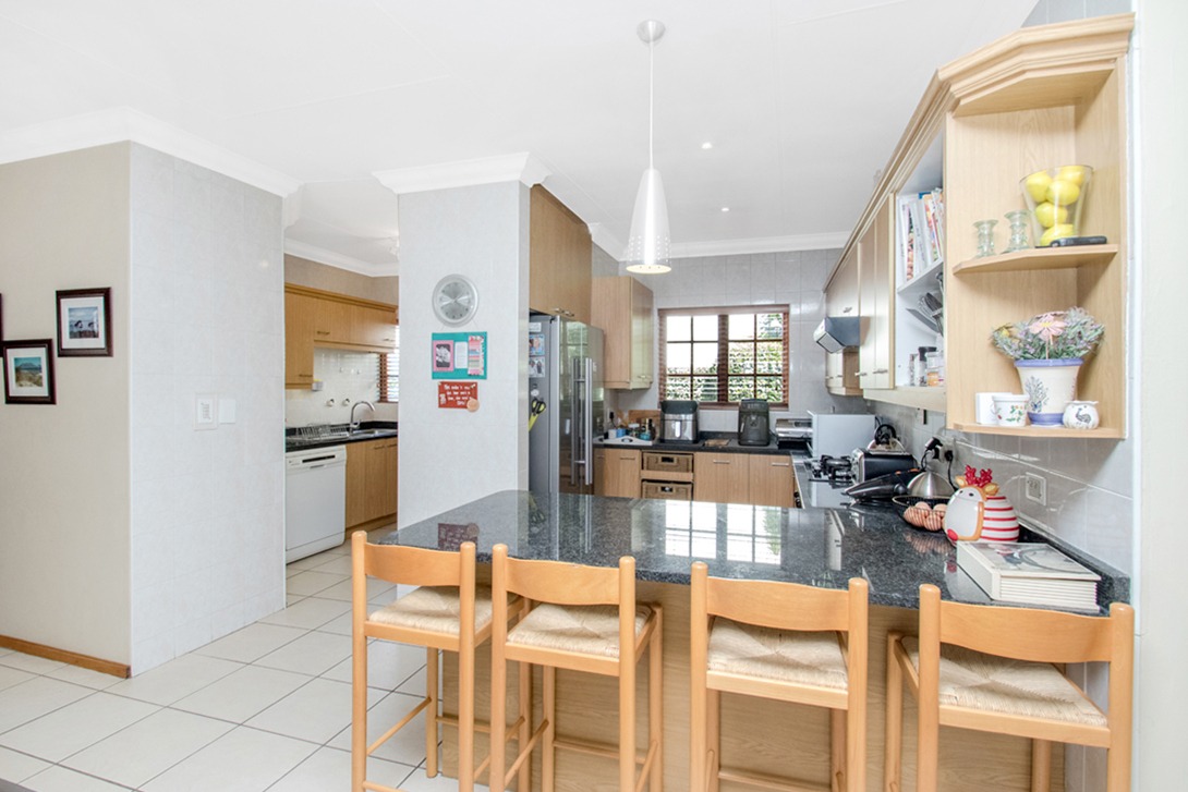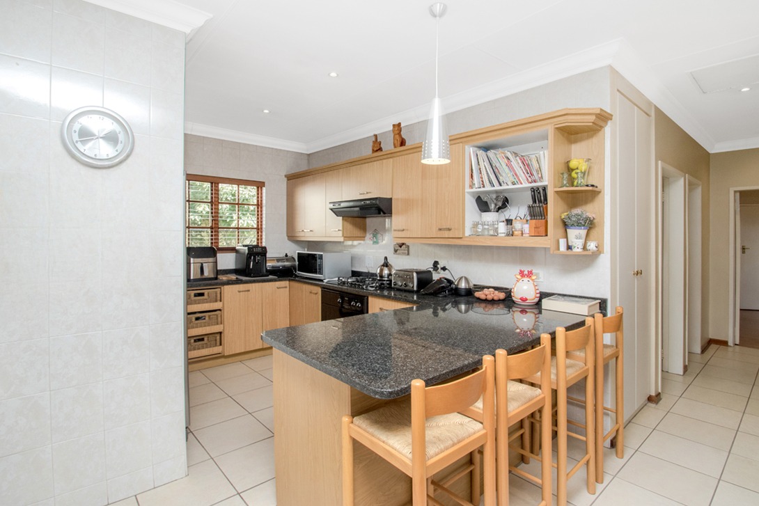 The modern kitchen features granite countertops, a breakfast nook, gas hob, and electric oven—perfectly positioned to serve both the formal and informal living areas. A separate scullery provides space for a double-door fridge and two undercounter appliances, with direct access to a neat paved courtyard and gorgeous garden.