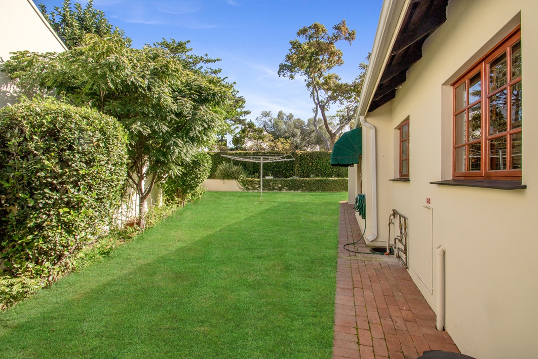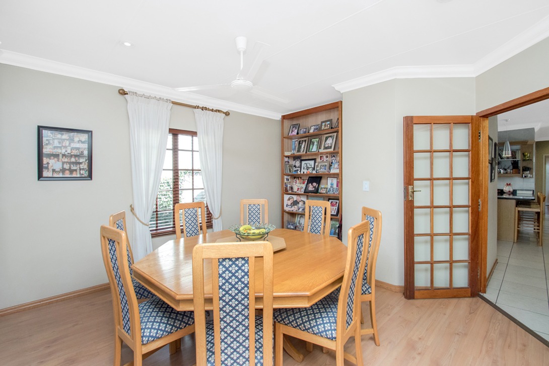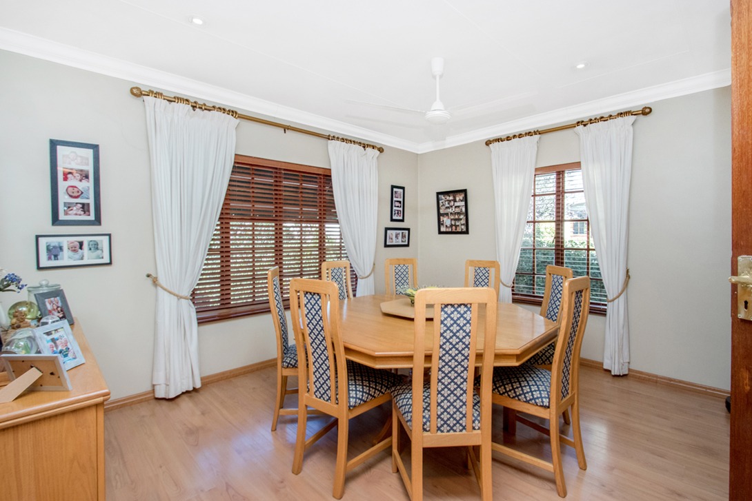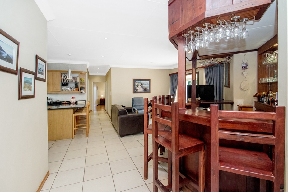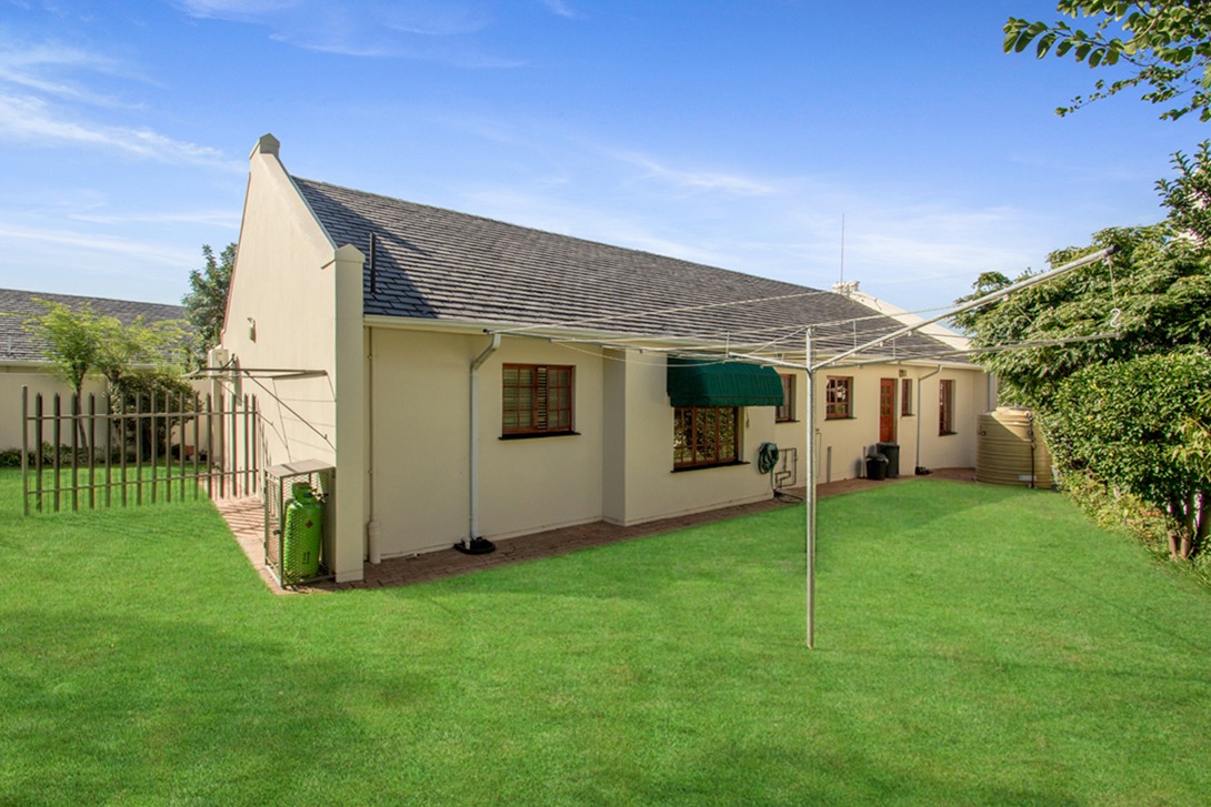 The modern kitchen features granite countertops, a breakfast nook, gas hob, and electric oven—perfectly positioned to serve both the formal and informal living areas. A separate scullery provides space for a double-door fridge and two undercounter appliances, with direct access to a neat paved courtyard and gorgeous garden.