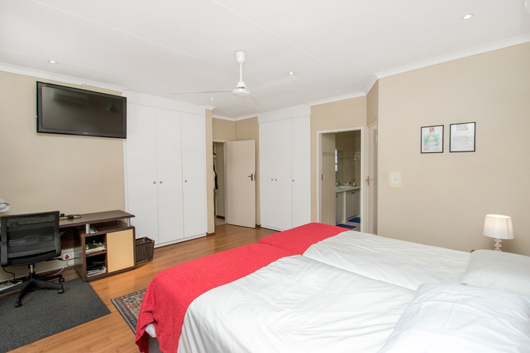 The master suite is a luxurious haven, opening onto the patio with pool and garden views, a walk-in closet, built-in cupboards, air-conditioning, and an oversized full en-suite bathroom with a double vanity, bath, and shower.