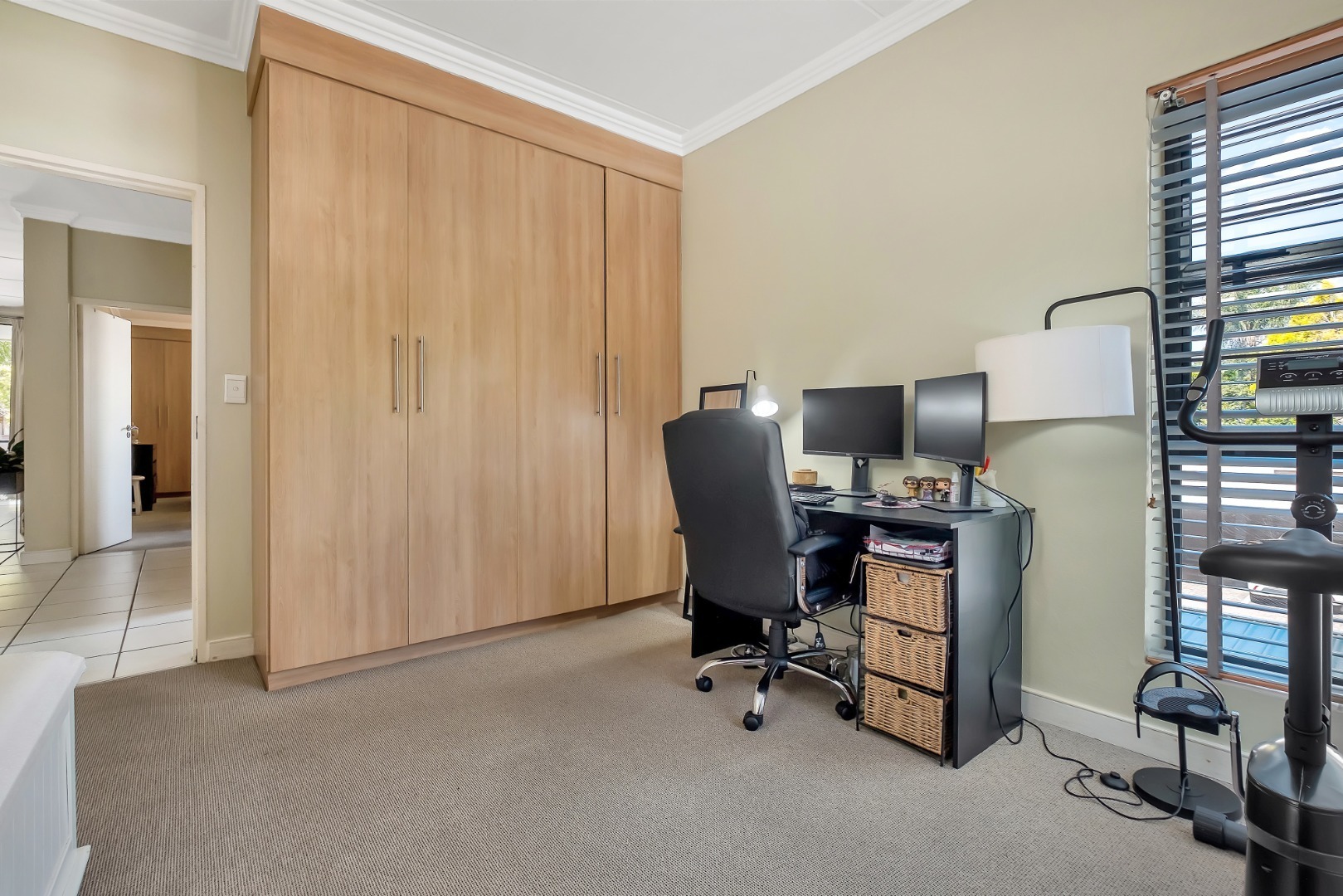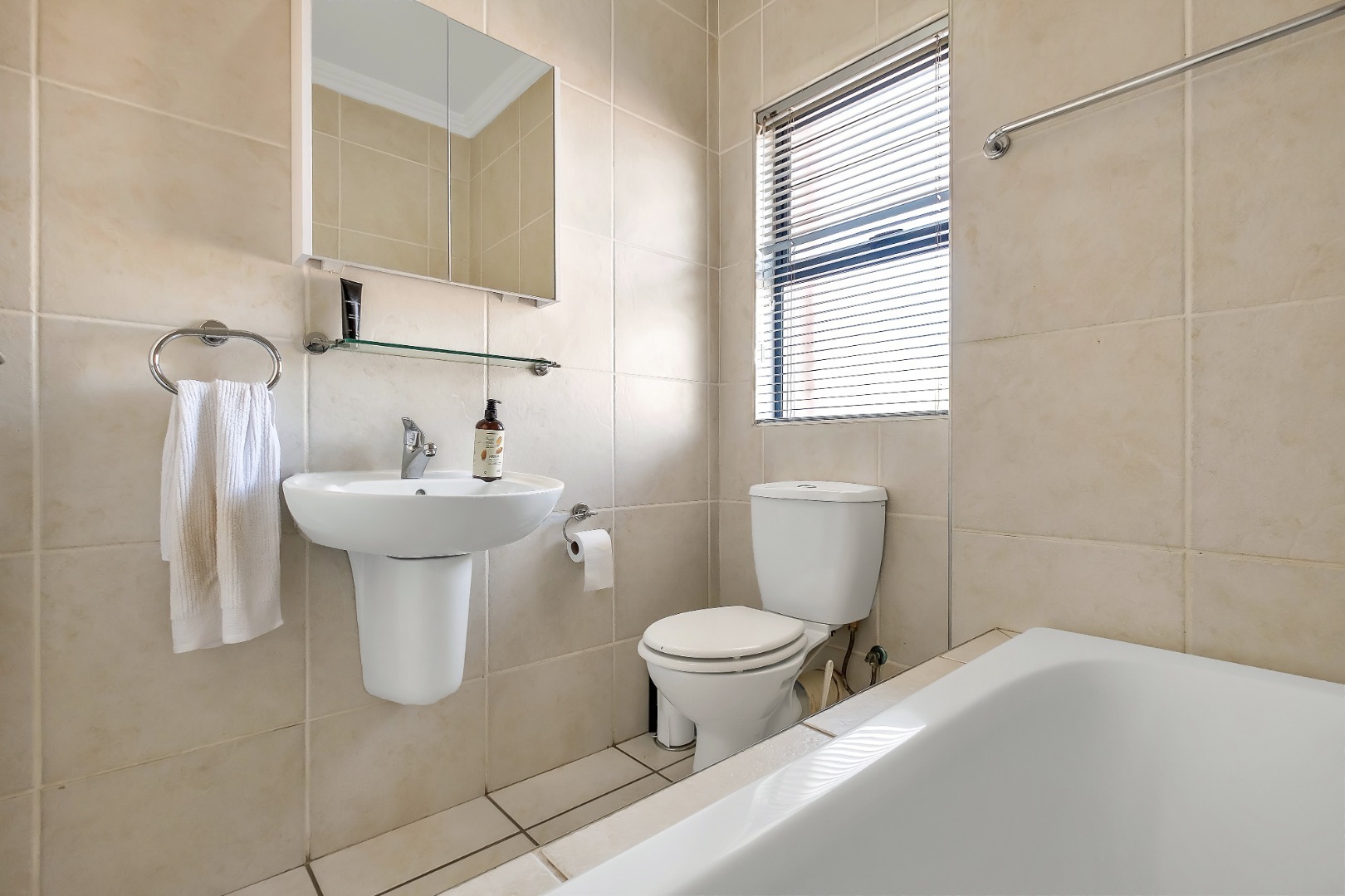 The master bedroom is warm and welcoming with large windows, two sets of built-in cupboards, and a stylish en-suite bathroom with a bath.