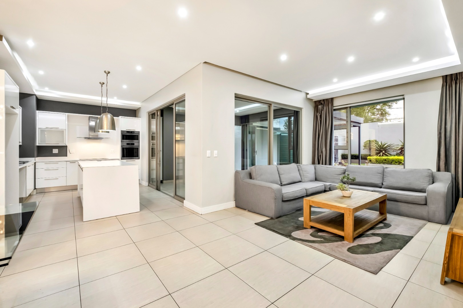 The open-plan living area is the heart of the home, combining a bespoke dining space with feature lighting, a beautifully curated designer kitchen, and a relaxed lounge that overlooks the garden. Stacker doors open to an enclosed patio which further extends to a spacious covered patio, the ideal setting for year-round entertaining with a delightful garden view.