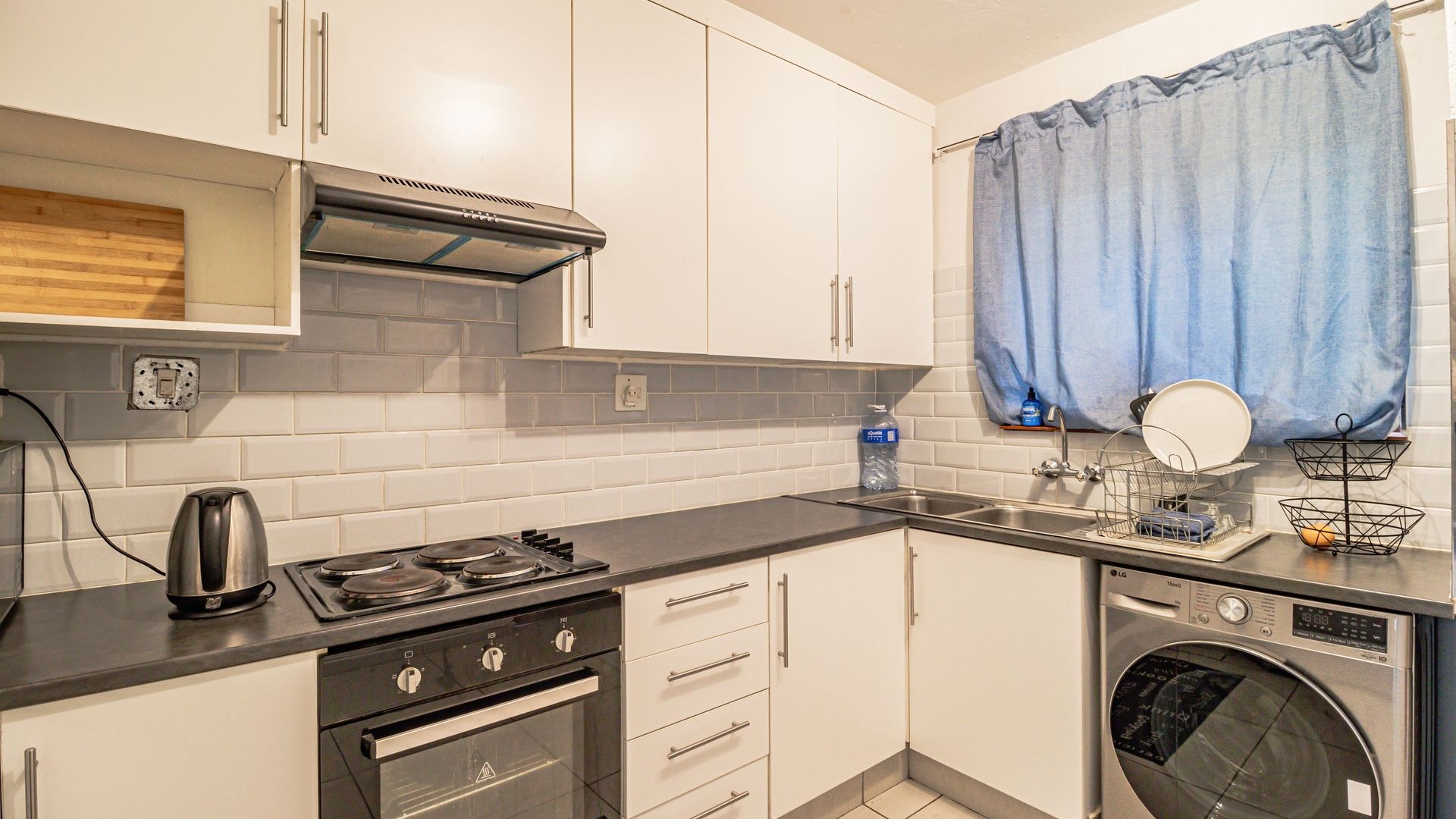 - Modern kitchen with white cabinetry, granite-look countertops, integrated hob and oven