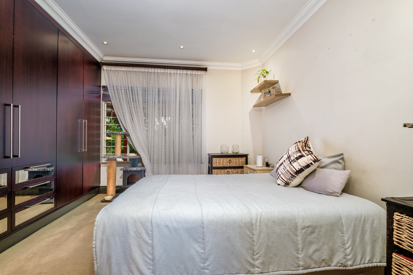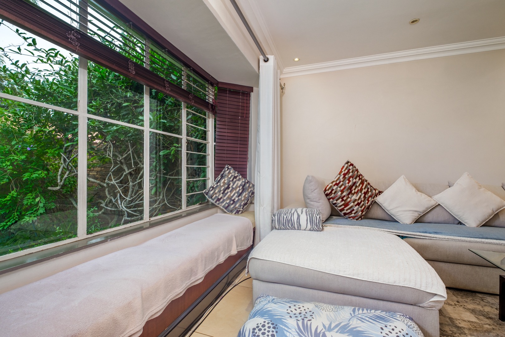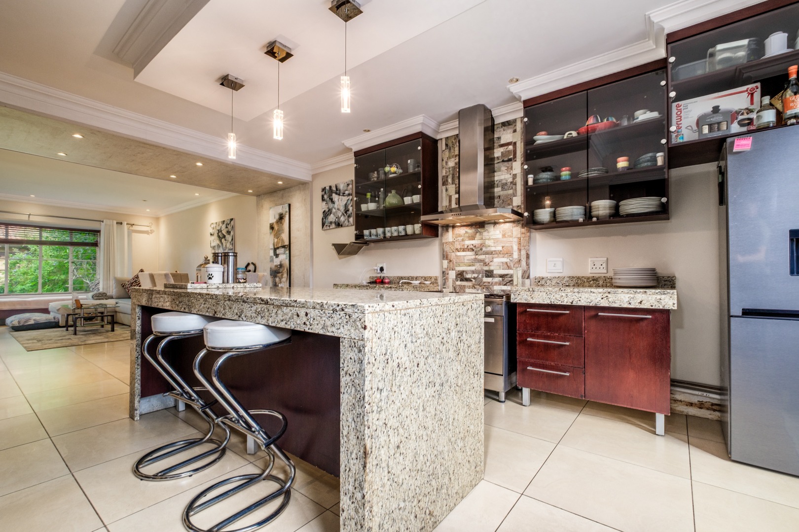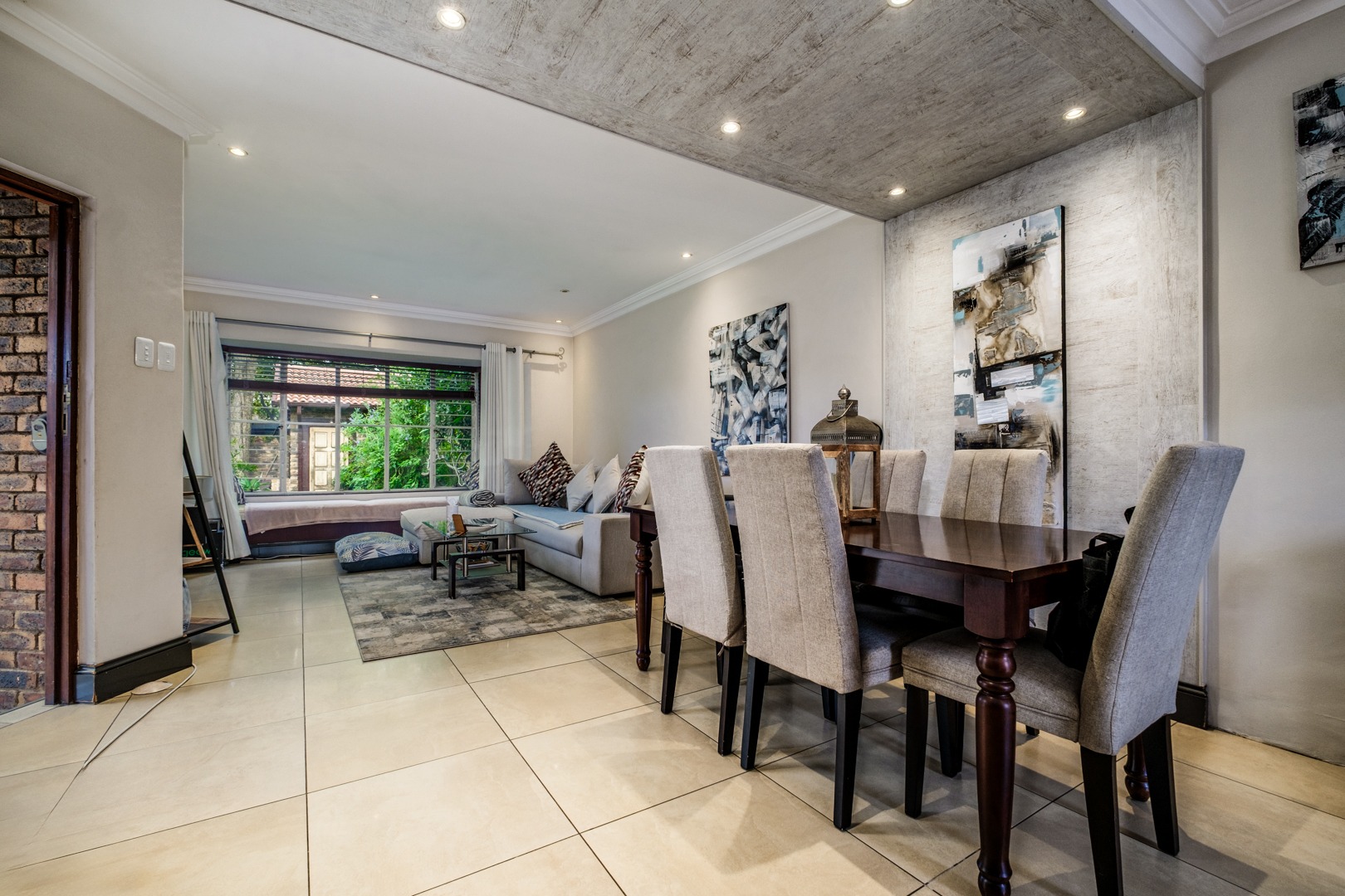 Discover this charming 121 sqm residence nestled within a secure gated community in River Club, Sandton. This inviting home offers a harmonious blend of comfortable living and outdoor enjoyment, perfect for those seeking a tranquil yet connected lifestyle. The property's kerb appeal is enhanced by its well-maintained garden and the welcoming covered patio, setting the stage for a delightful living experience. Step inside to an open-plan layout that seamlessly connects the modern kitchen with the lounge area. The kitchen is a highlight, featuring a large granite island with seating, ample granite countertop space, stylish dark wood cabinetry, and modern stainless steel appliances, including a stove and range hood. Tiled flooring extends throughout, ensuring easy maintenance and a cohesive aesthetic. The home comprises two comfortable bedrooms and two bathrooms, with one being an en-suite, providing privacy and convenience. Each space is designed for relaxation, offering a peaceful retreat after a busy day. Outdoor living is a true pleasure here, with a spacious covered patio that serves as an ideal setting for entertaining or quiet relaxation. This area, complete with comfortable outdoor seating and a BBQ grill, overlooks a lush, private garden, creating a serene oasis. Residents also benefit from access to a communal pool, perfect for cooling off on warm days. Pets are allowed, making this an ideal home for animal lovers. Security is paramount within this complex, featuring an access gate and burglar bars for peace of mind. The property is also fibre-ready, ensuring high-speed internet connectivity. With one garage and two additional parking spaces, convenience is assured. Located in the desirable River Club, Sandton, this home offers a superb opportunity for a balanced lifestyle. Key Features: * 121 sqm Floor Size * 2 Bedrooms, 2 Bathrooms (1 En-suite) * Open-Plan Kitchen with Granite Island * Spacious Covered Patio with Garden Access * Communal Pool Access * 1 Garage, 2 Parking Spaces * Gated Community with Access Gate and Burglar Bars * Fibre Ready * Pets Allowed