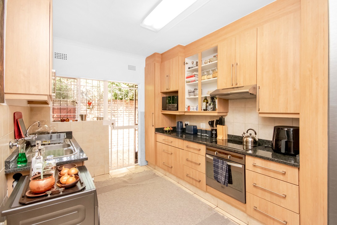Well kept kitchen with functional layout and room for 2 appliances leading to small courtyard