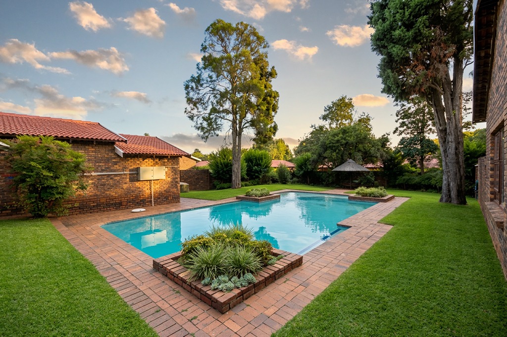Large pool in complex with established gardens.